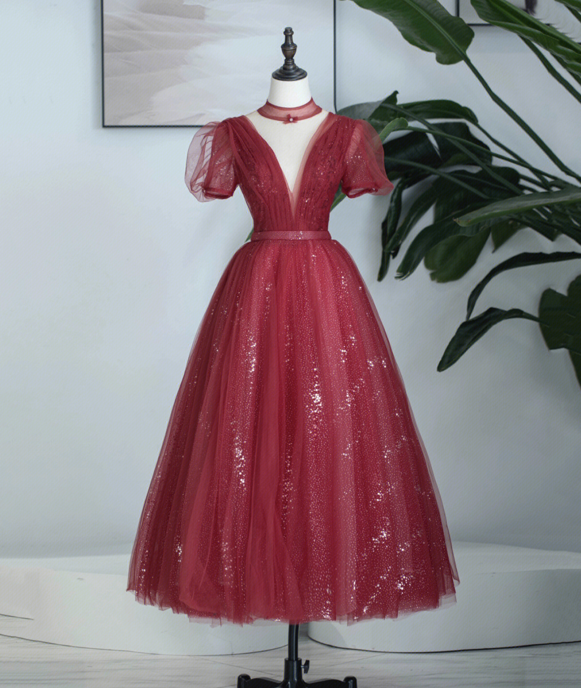 - Burgundy Tulle Sequins Tea Length Prom Dress, A-Line Party Dress -