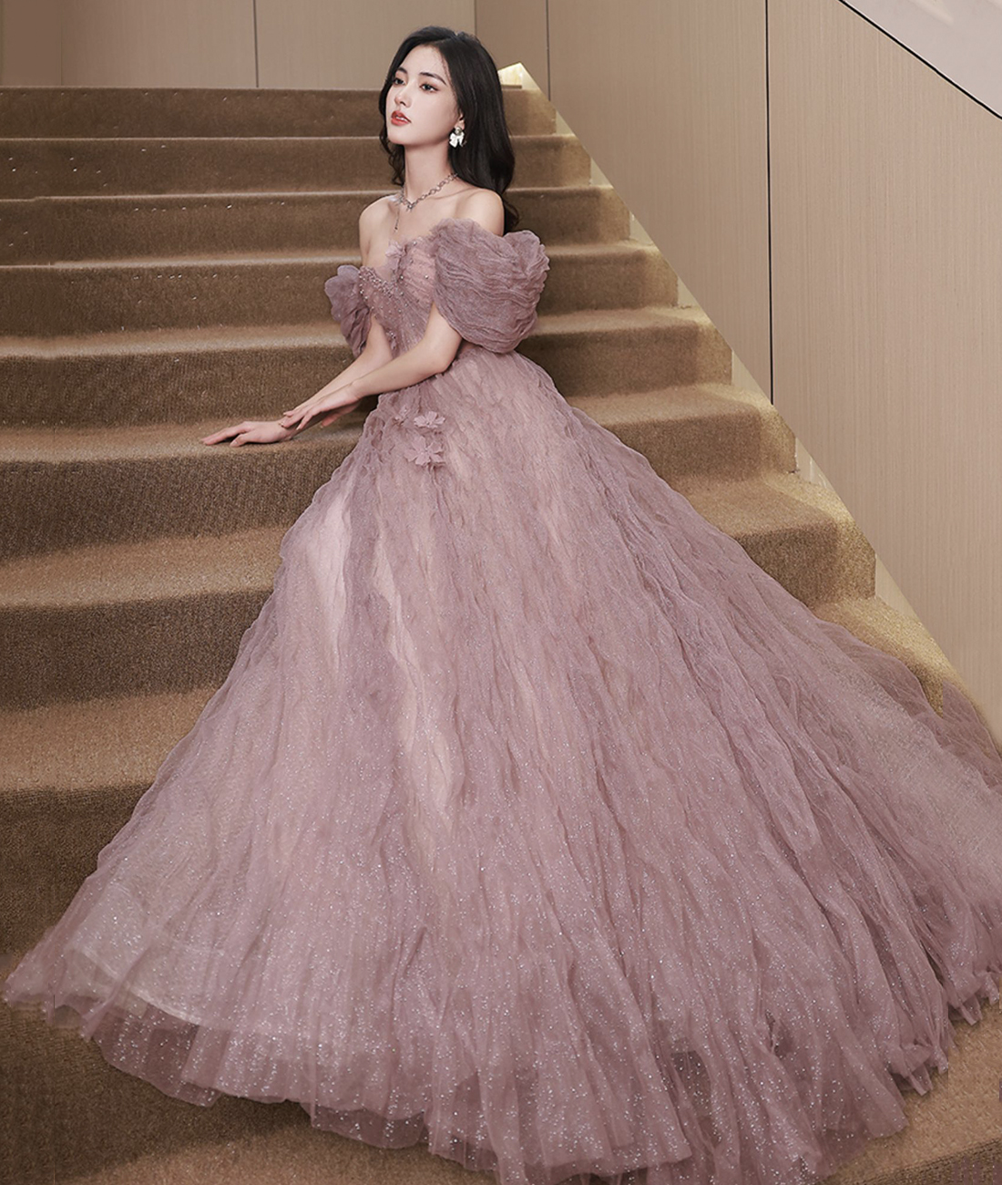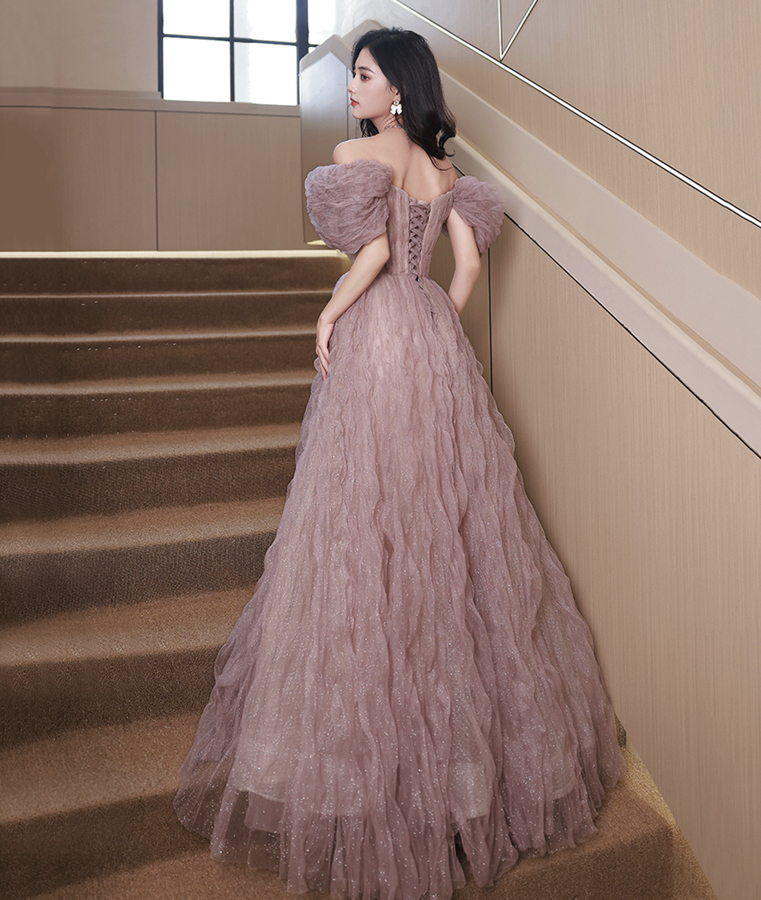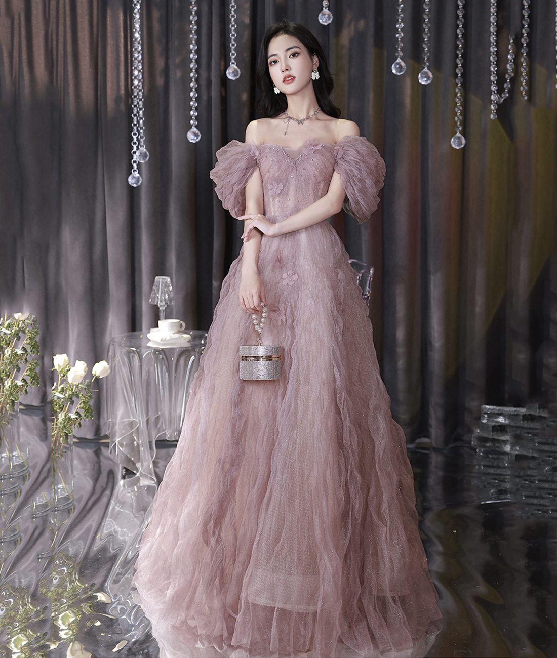 - Cute Tulle Long Prom Dress, Off the Shoulder Evening Dress -