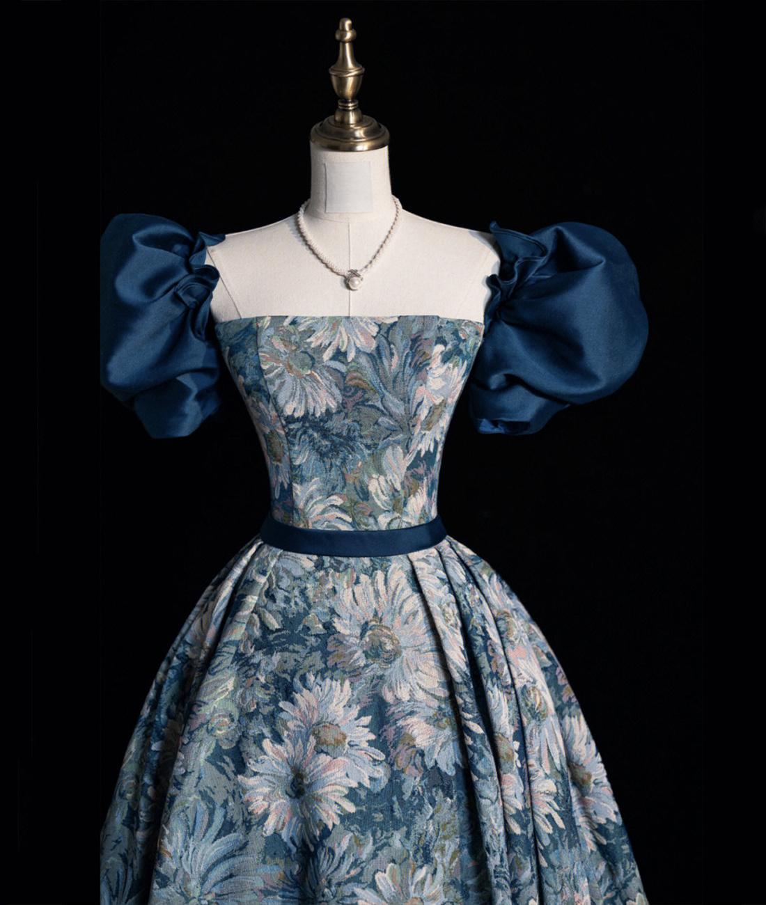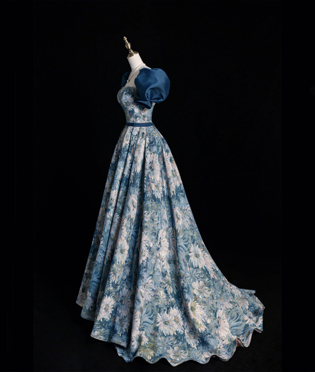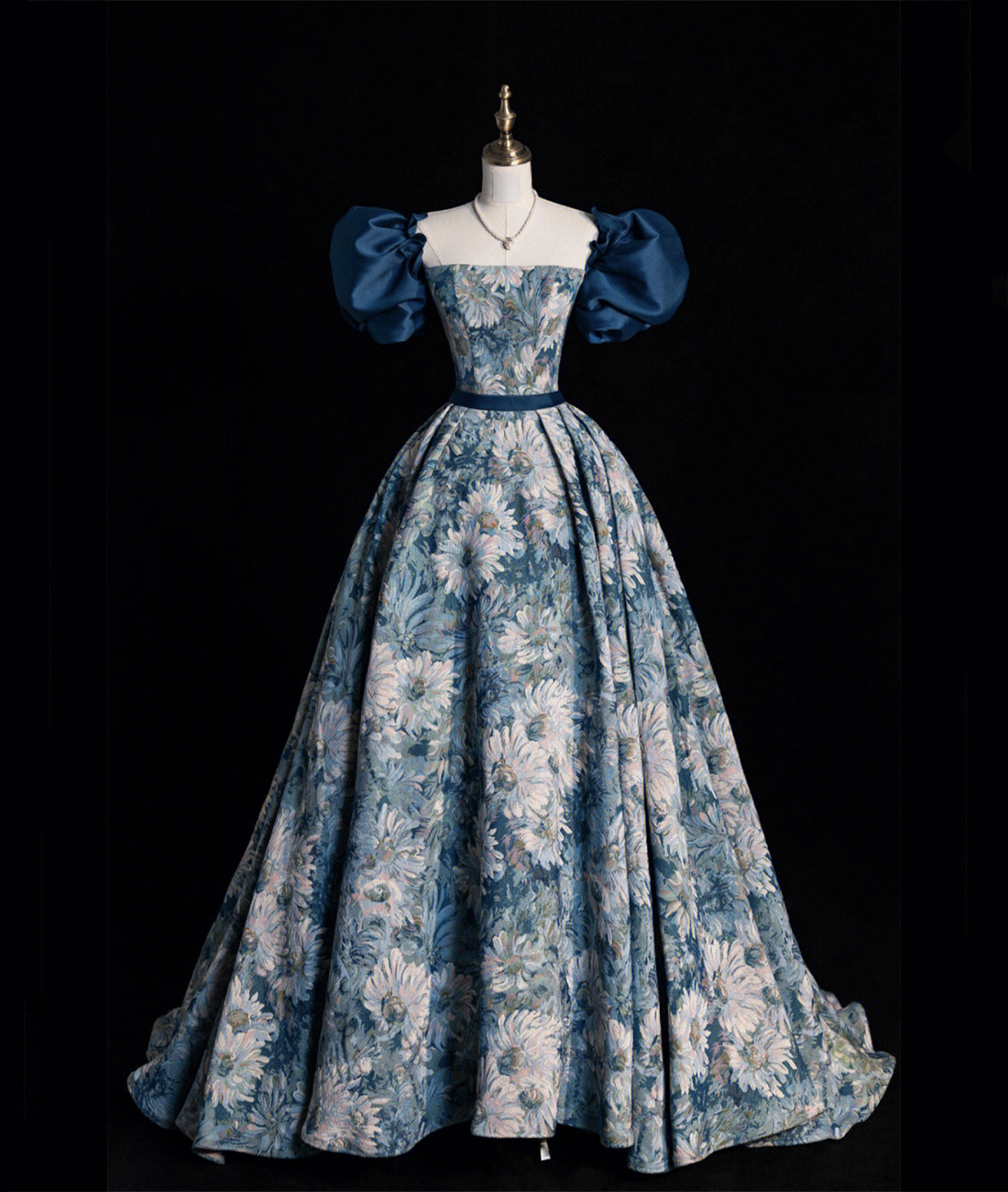 - Blue Floral Long A-Line Prom Dress, Elegant Short Sleeve Evening Dress -