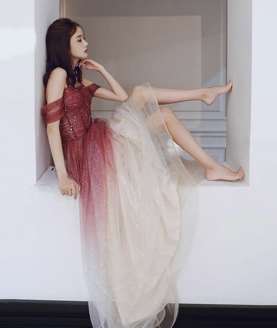 - Red Gradient Tulle Sweetheart Beaded Straps Prom Dres, Red Long Formal Dress -