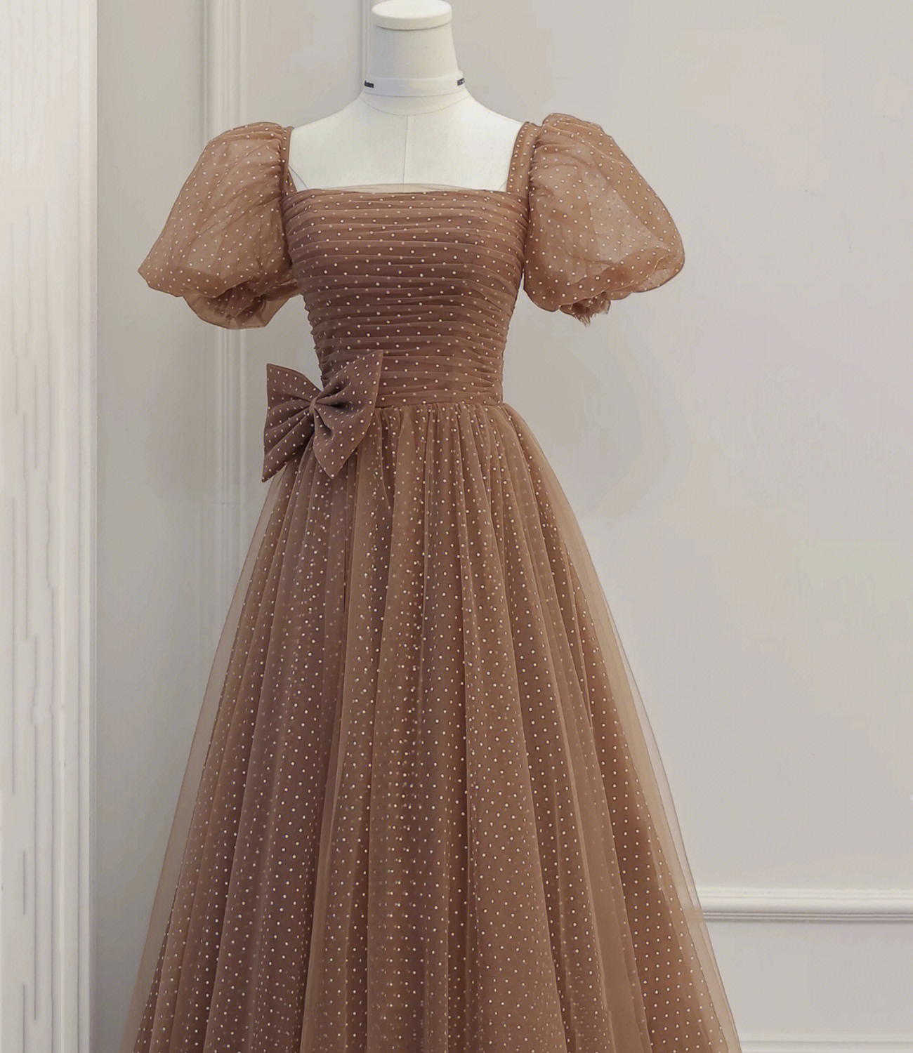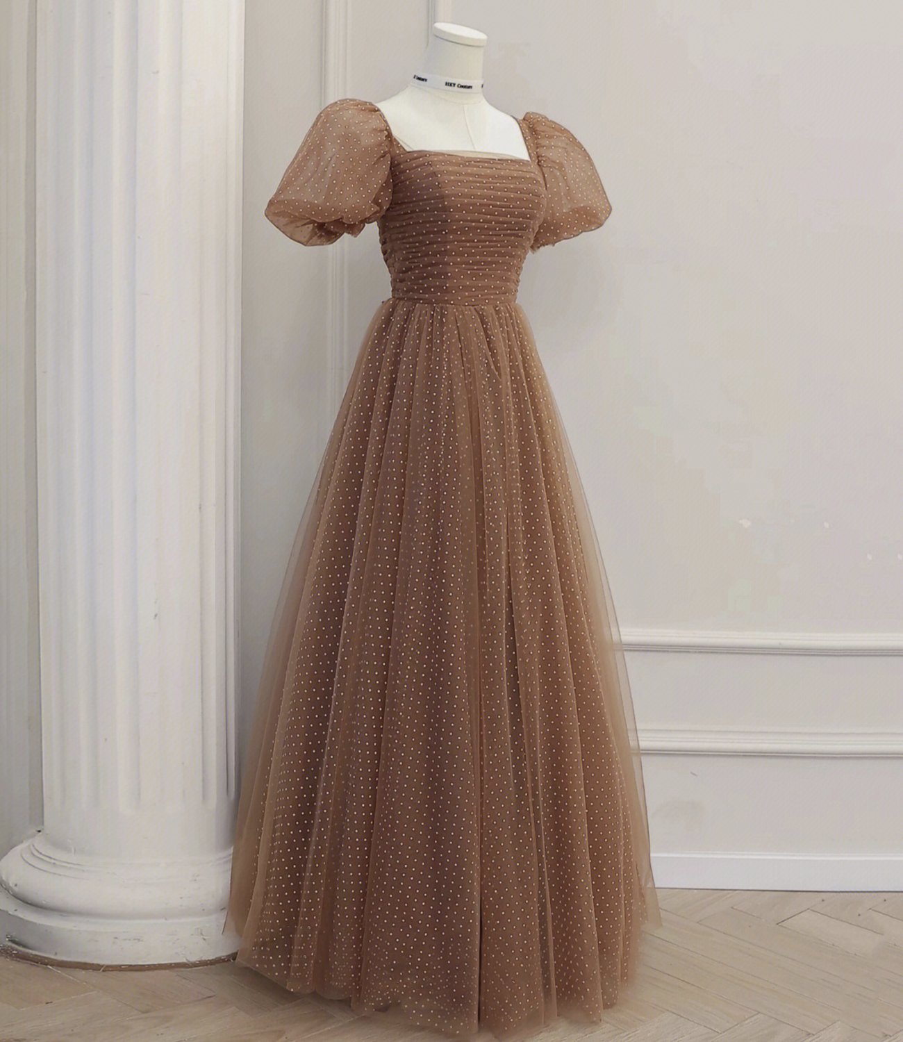 - Brown Polka Dots Tulle Long Prom Dress, Cute Short Sleeve Evening Dress -