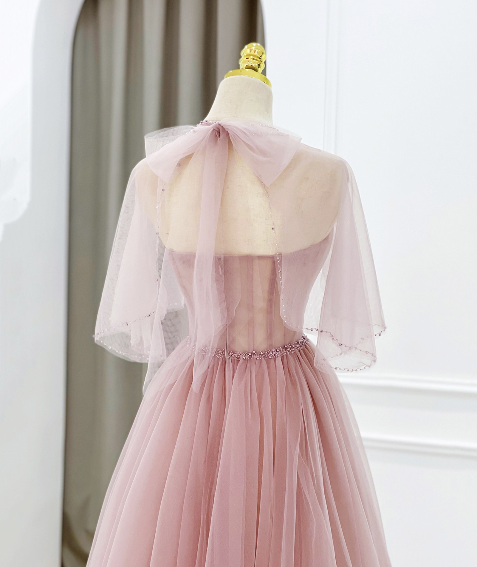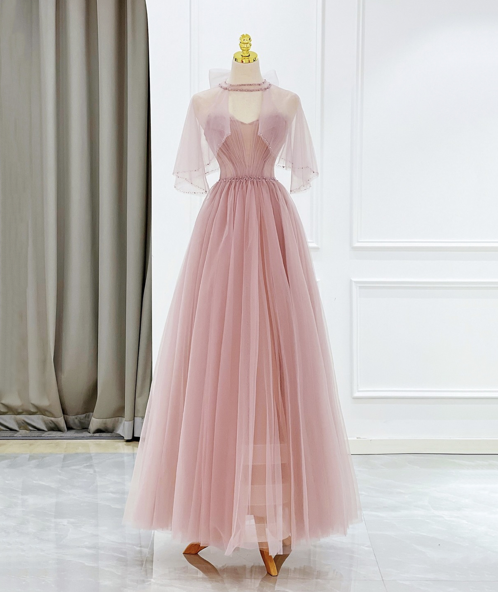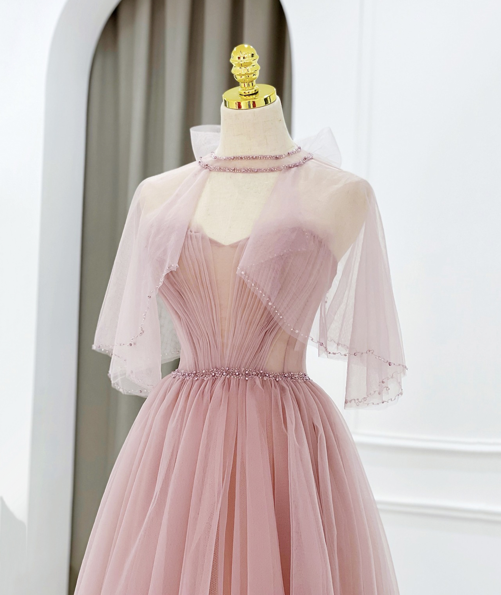 - Pink Tulle Beaded Long Formal Dress, Lovely Pink Evening Dress -