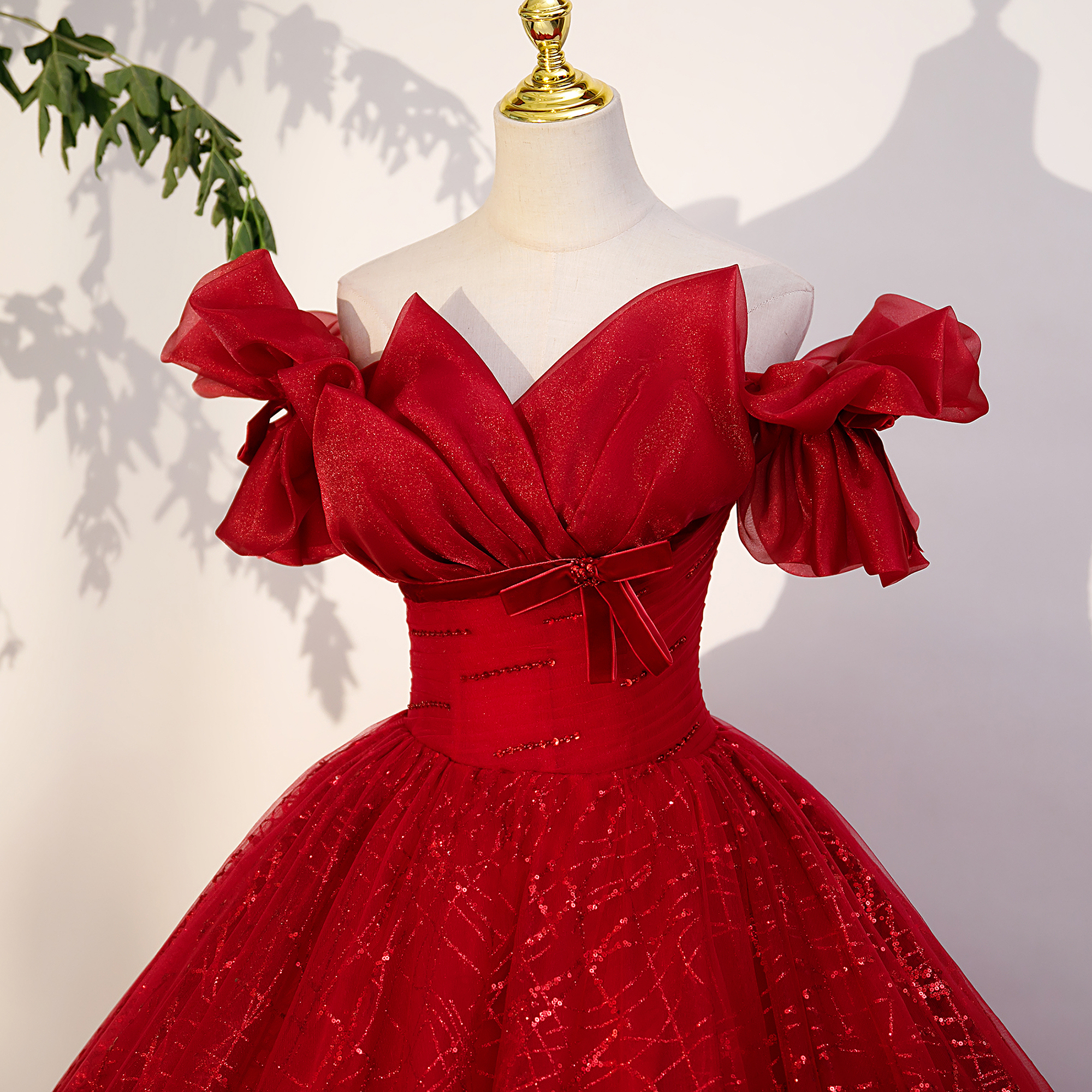 - Red Tulle Sequins Long Prom Dress, Red Off Shoulder Evening Dress -