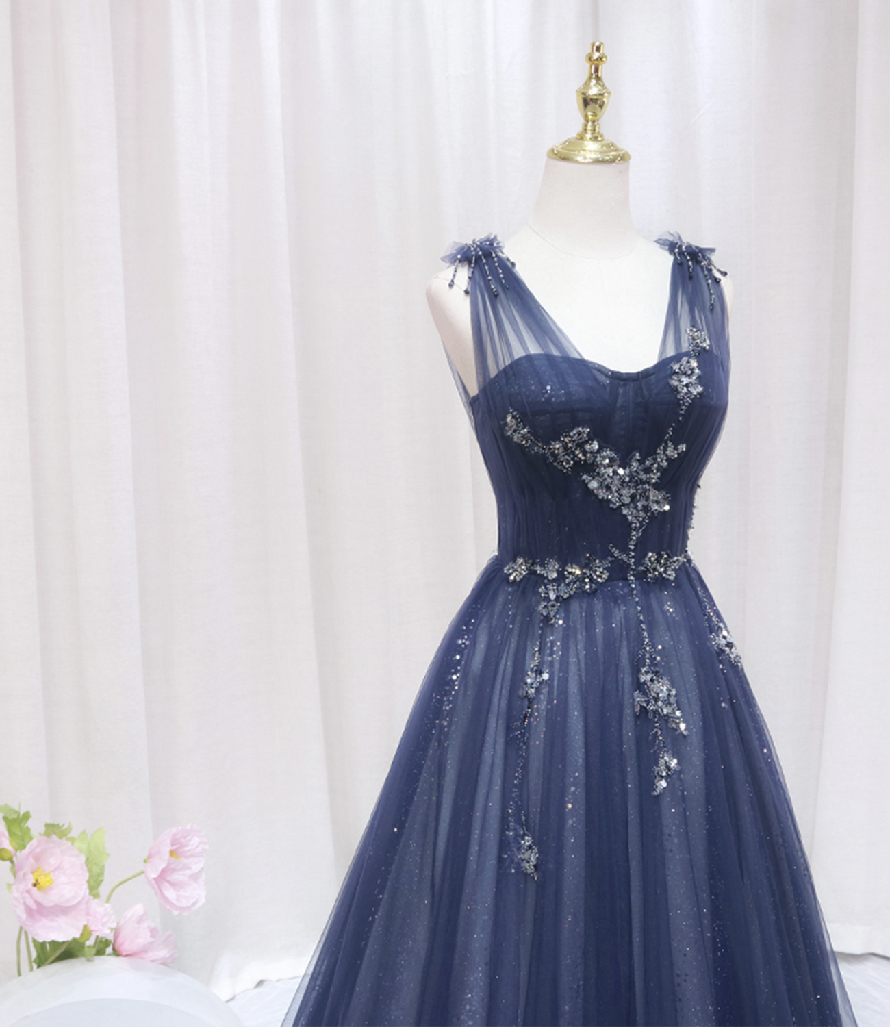 - Blue Tulle Beaded Long Prom Dress, A-Line Evening Party Dress -