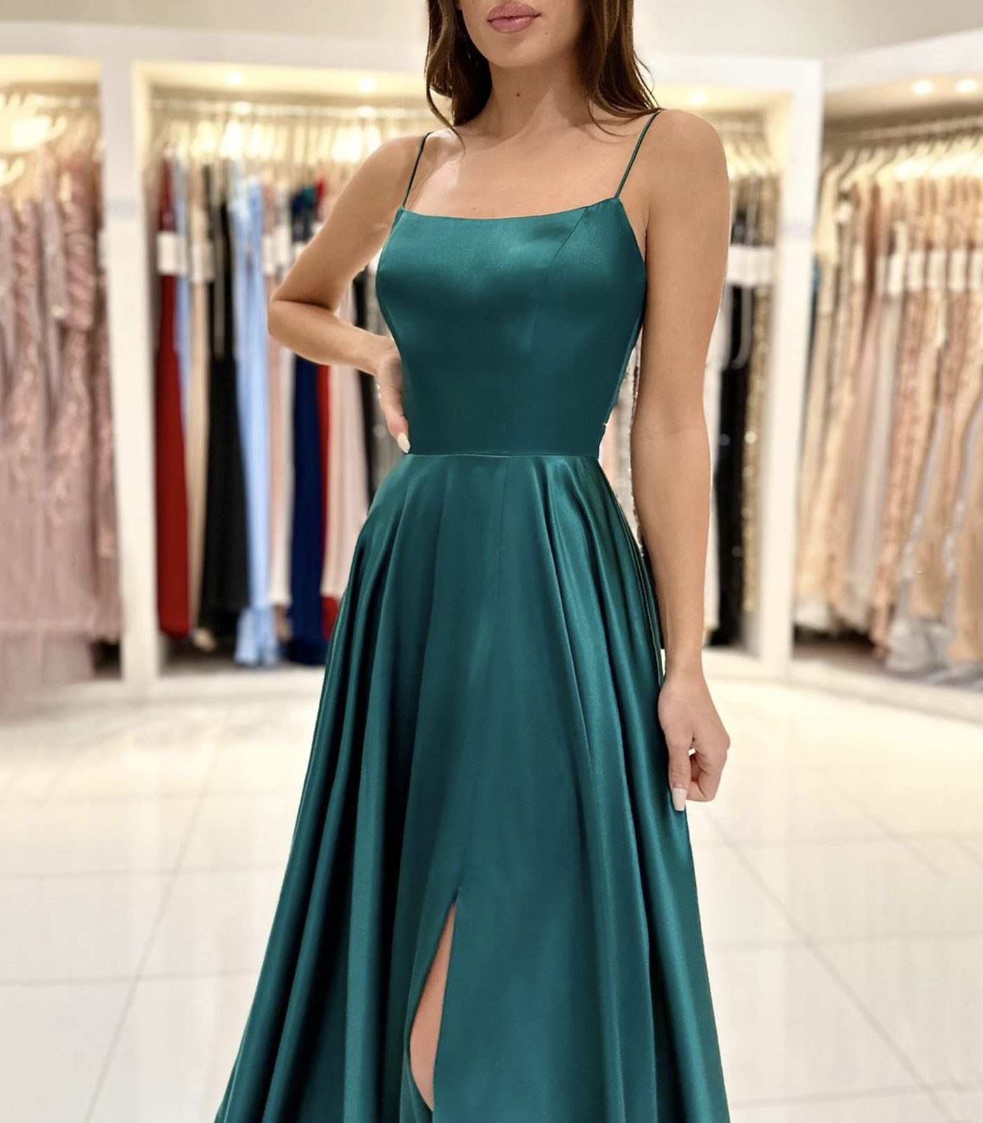 - Green Satin Long Prom Dress, Simple A-Line Backless Evening Dress -