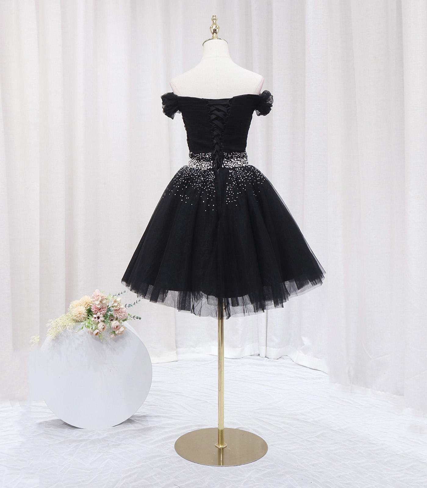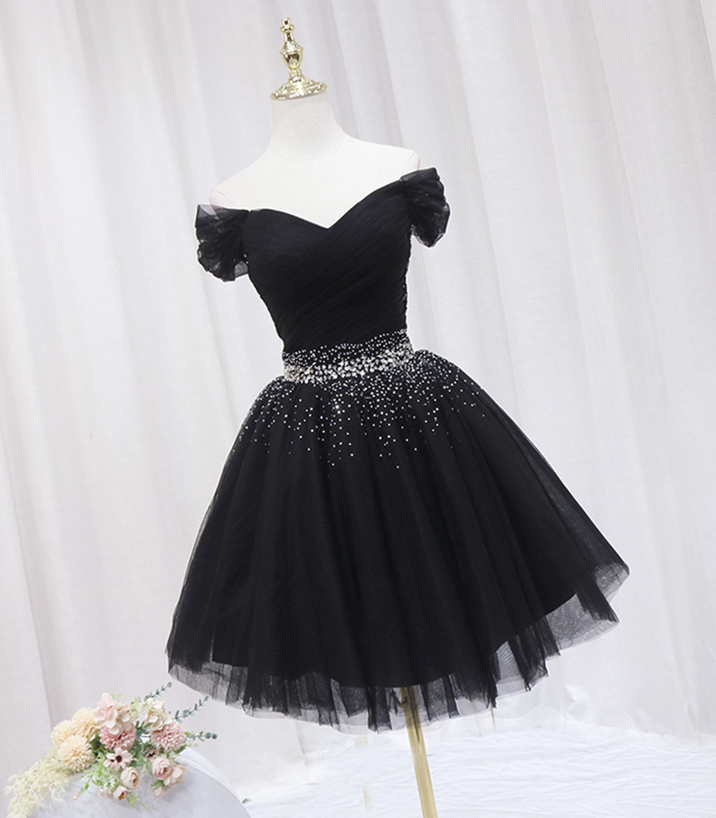 - Black Tulle Beaded Short Prom Dress, Black Off Shoulder Party Dress -