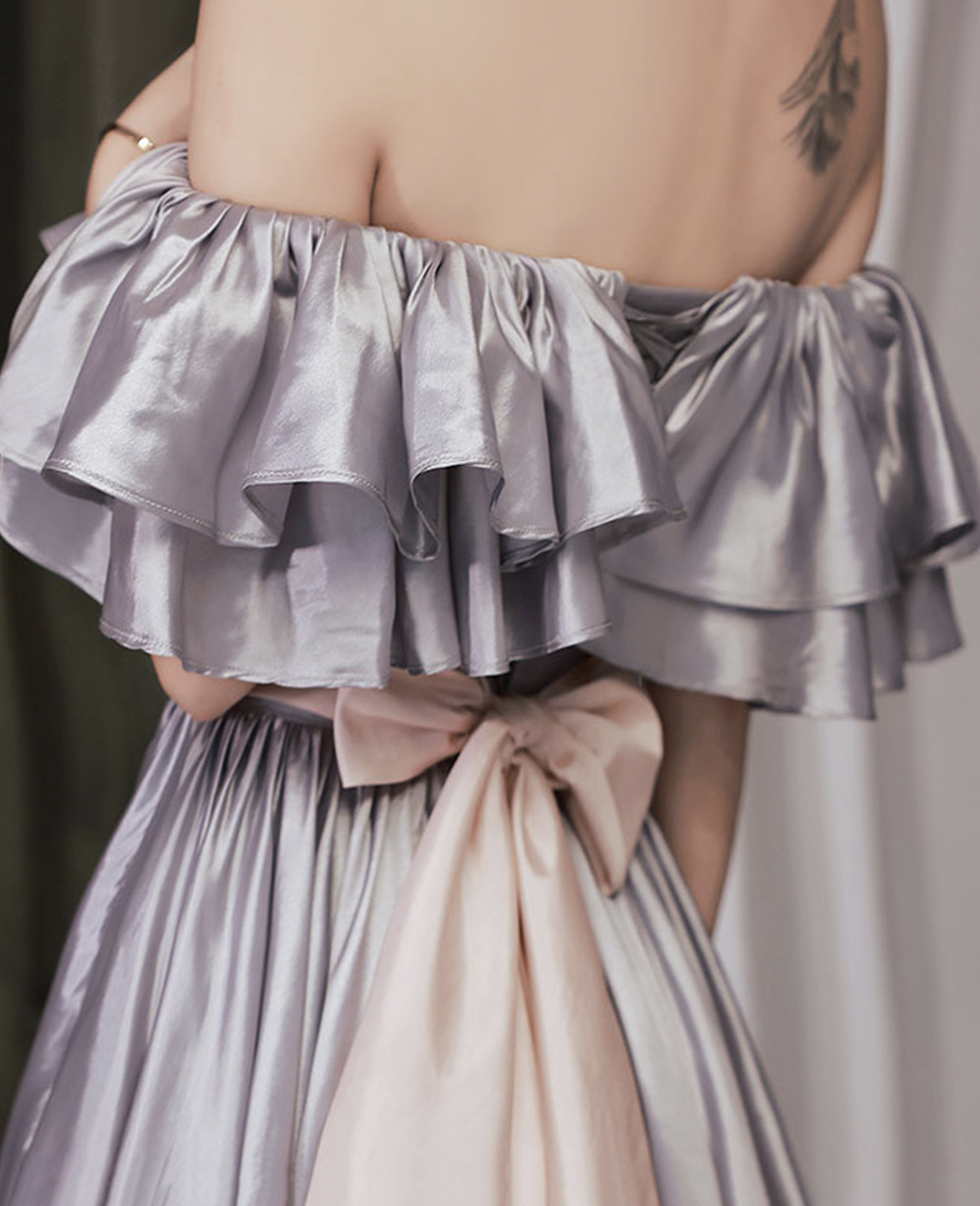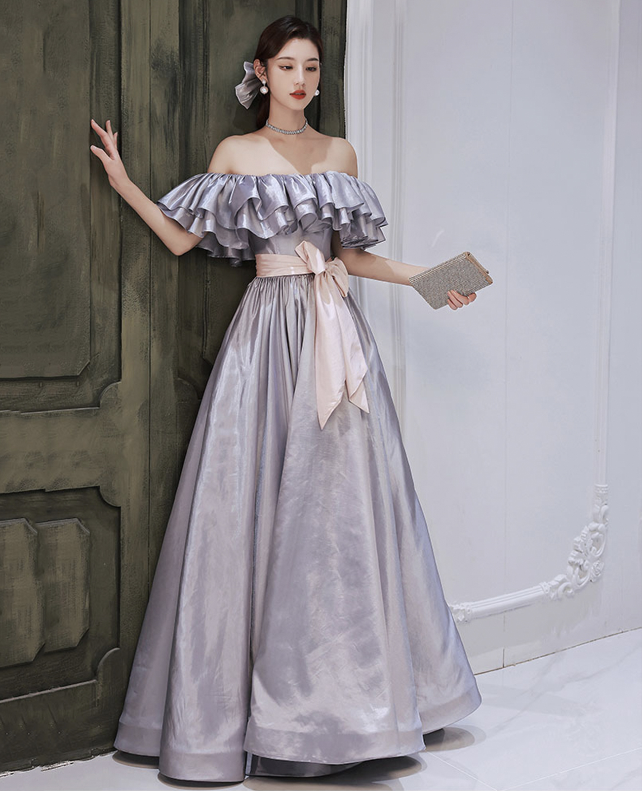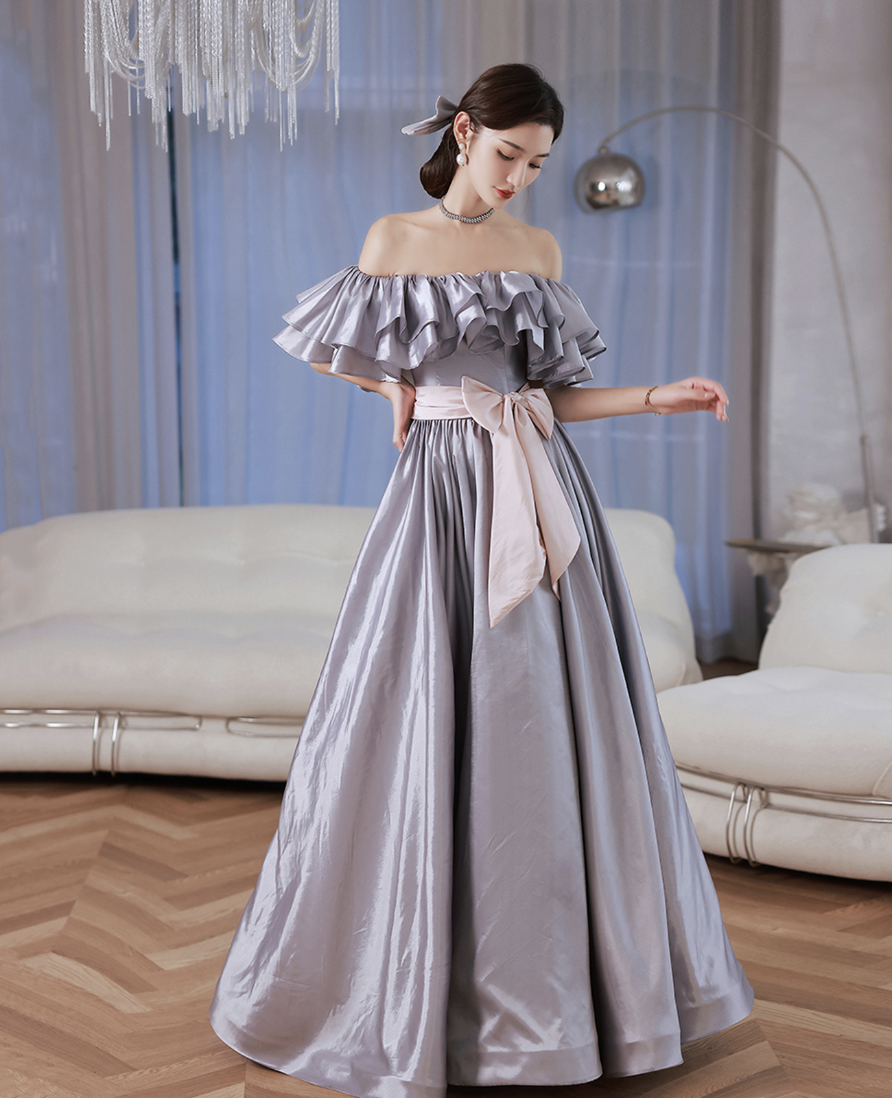 - Lovely Satin Floor Length Prom Dress, Off Shoulder Evening Dress with Bow -