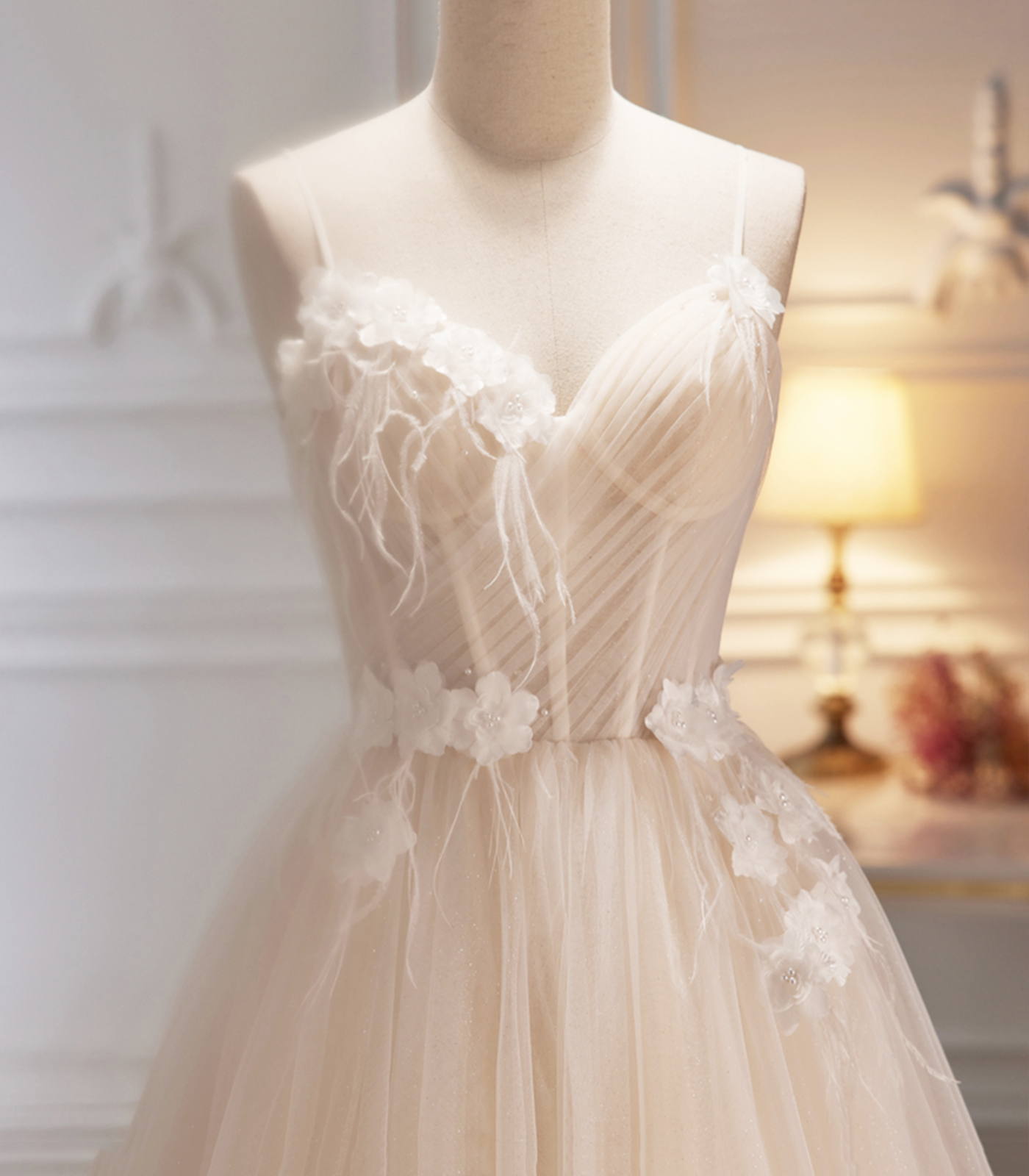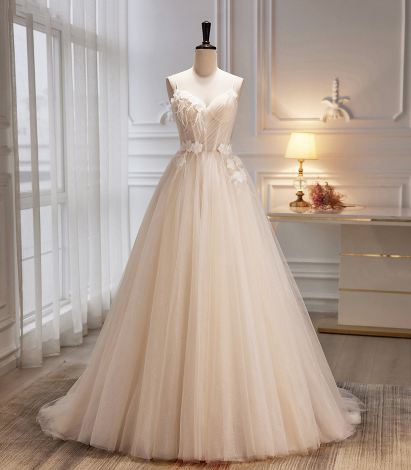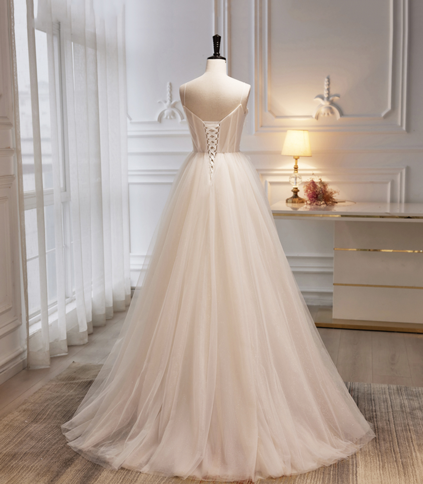 - Champagne V-Neck Tulle Long Prom Dress, A-Line Evening Party Dress -