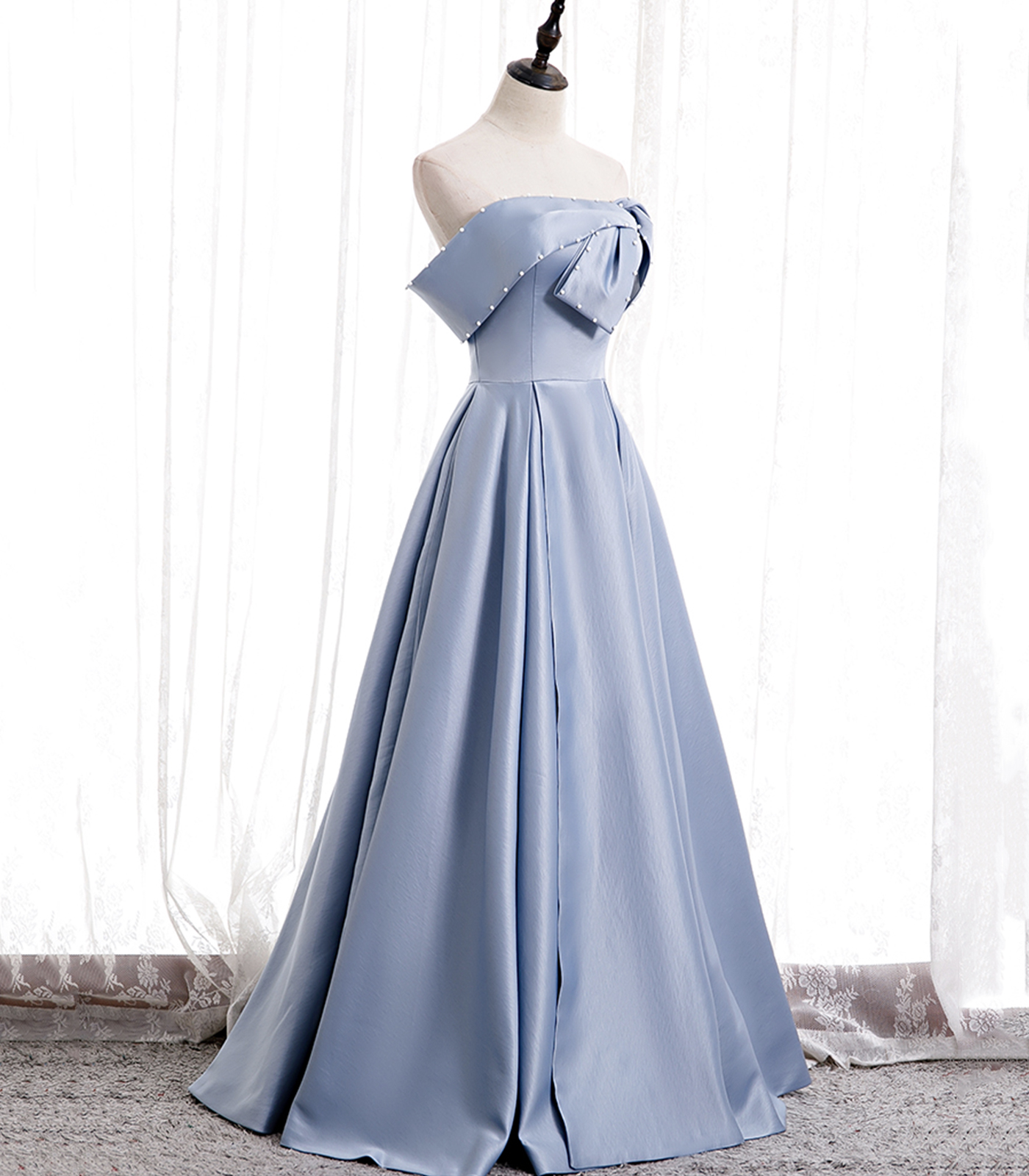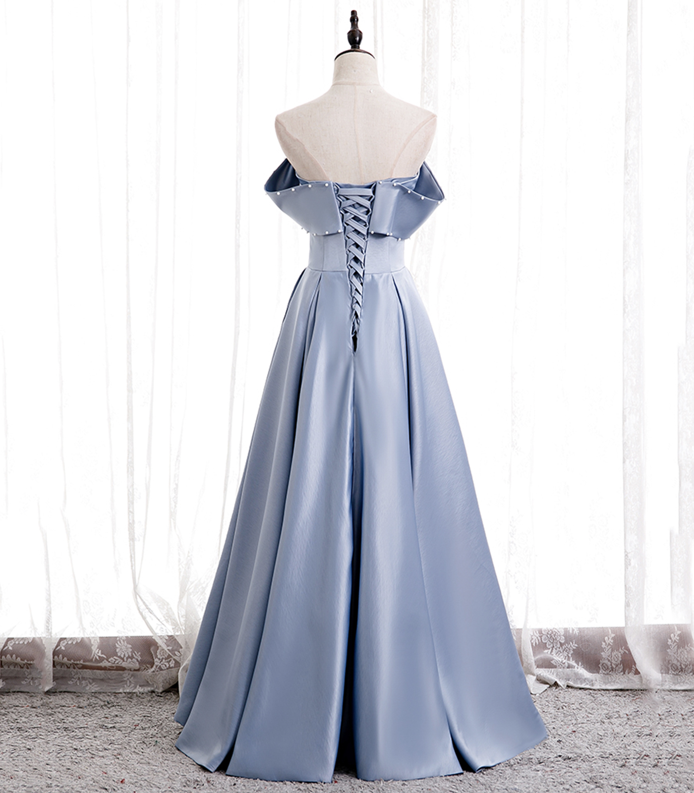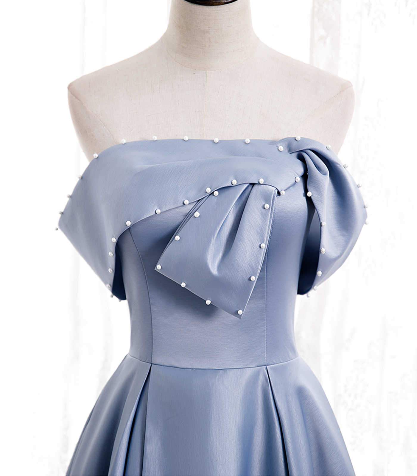 - Blue Satin Long Prom Dress with Pearls, Blue A-Line Strapless Party Dress -