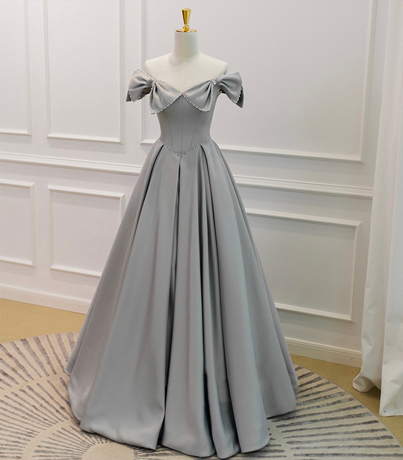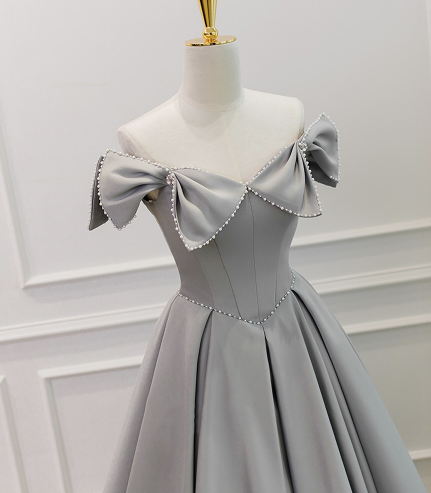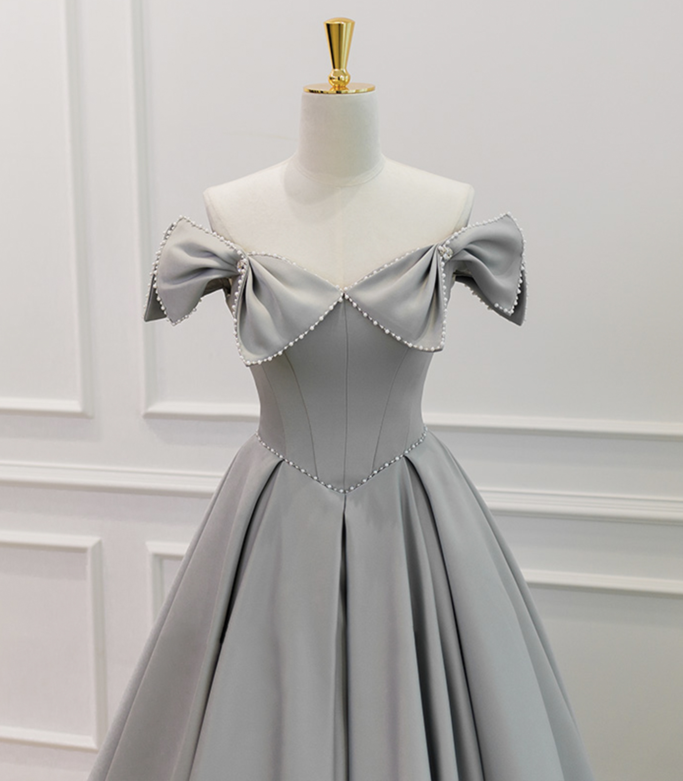 - Gray Satin Floor Length Formal Dress with Pearls, Cute A-Line Prom Dress -