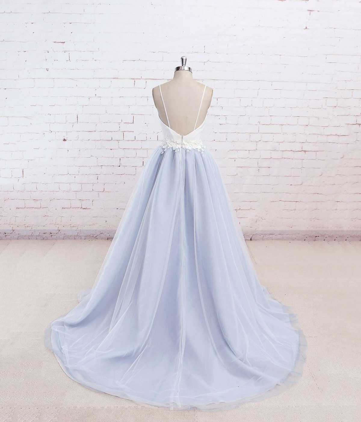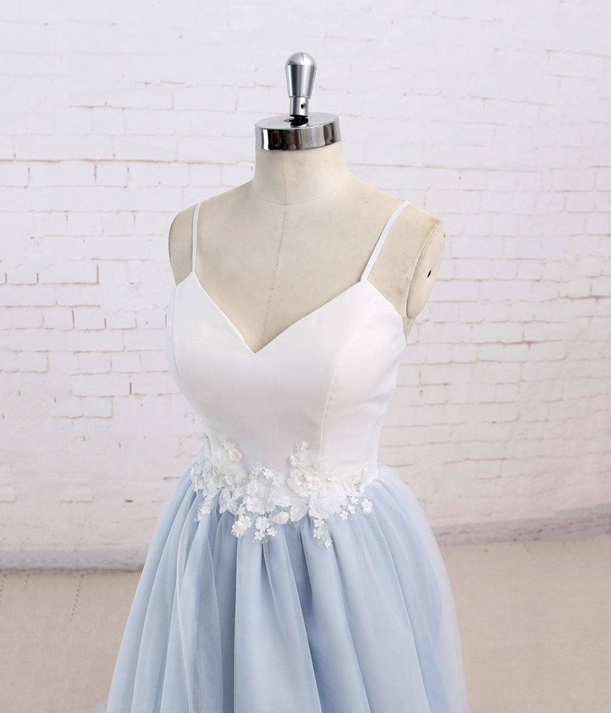 - Blue/White Spaghetti Strap Tulle Long Prom Dress with Lace, Cute A-Line Formal Dress -