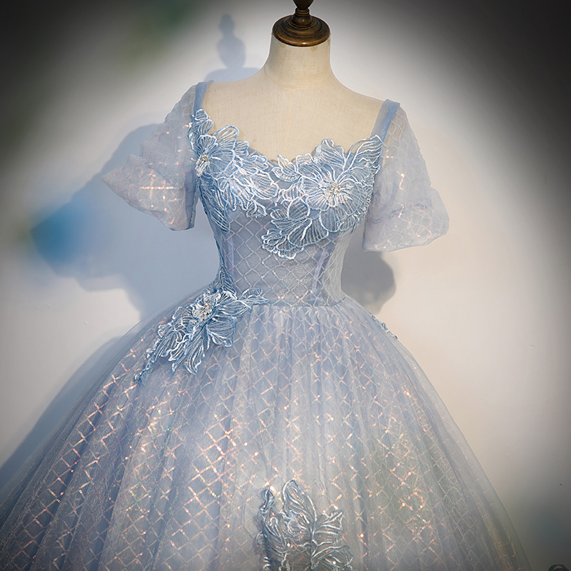 - Blue Tulle Lace Long Prom Dress, Shiny A-Line Short Sleeve Evening Dress -