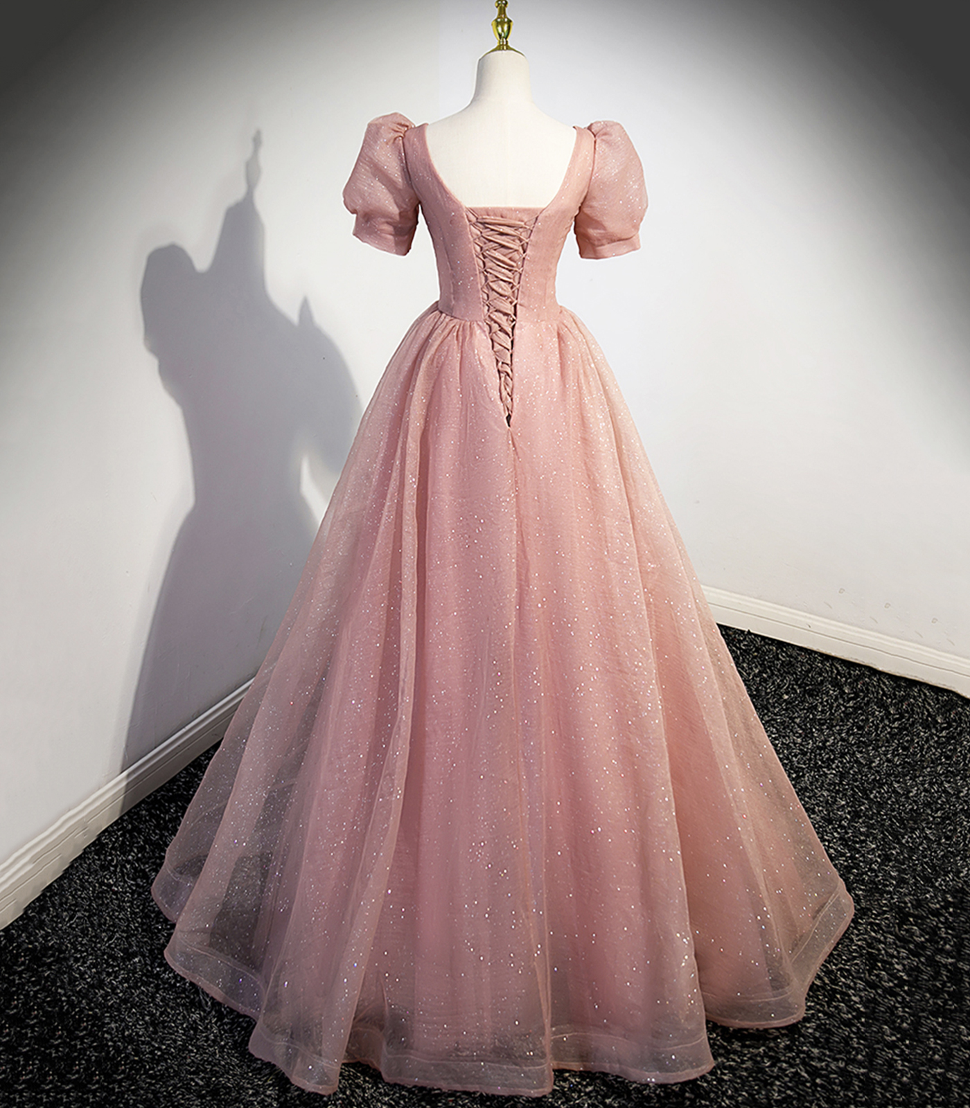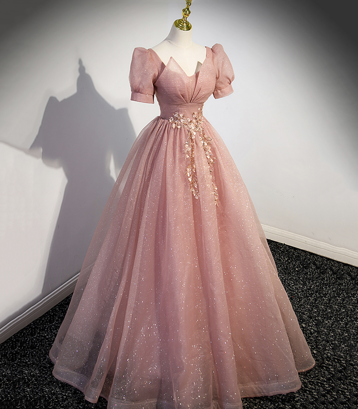 - Pink Tulle Floor Length Prom Dress with Short Sleeve, Beautiful A-Line Evening Dress -