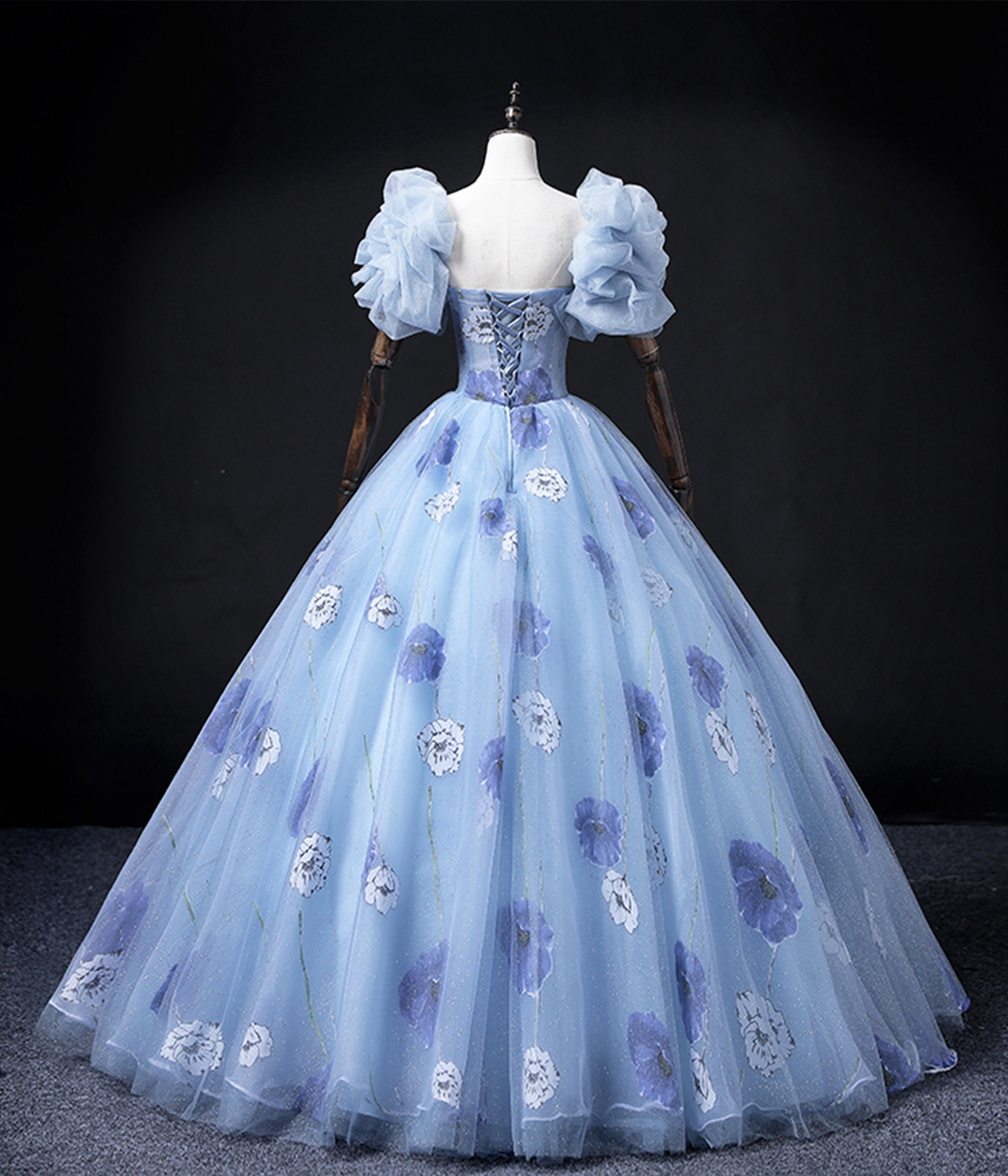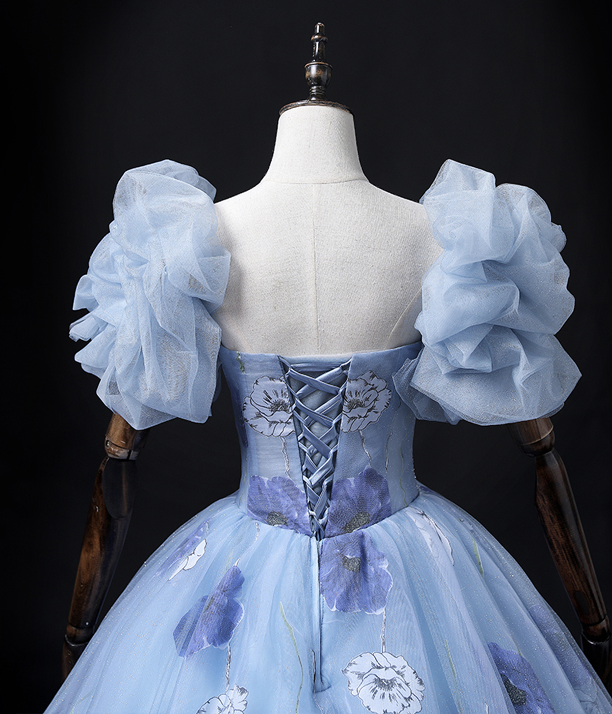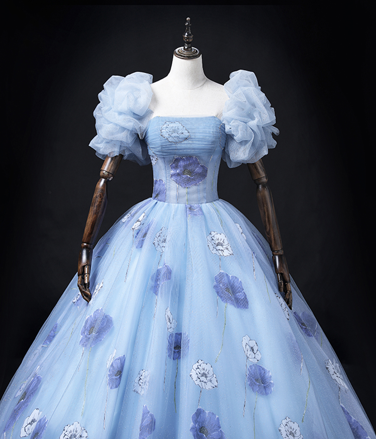 - Unique Blue Floral Long Prom Dress, Beautiful A-Line Evening Dress -