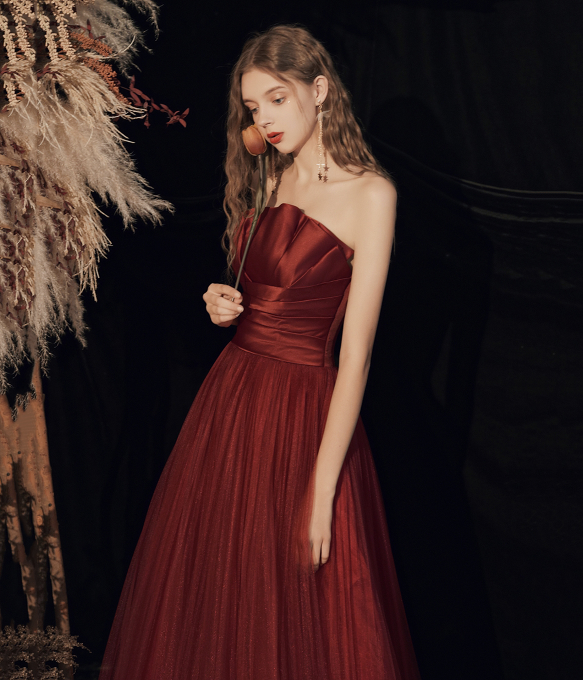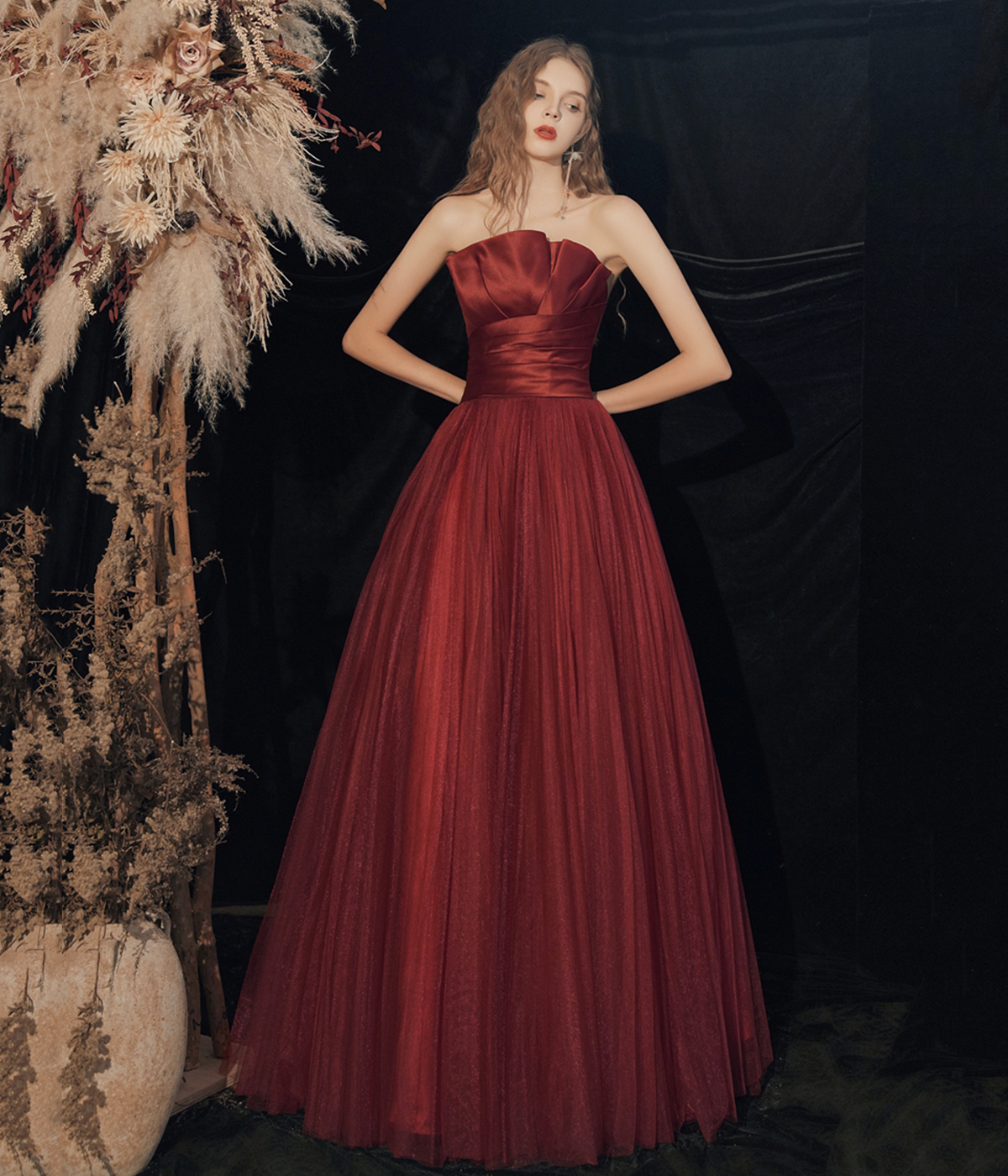 - Burgundy Strapless Tulle Long Prom Dress, Beautiful A-Line Evening Dress -