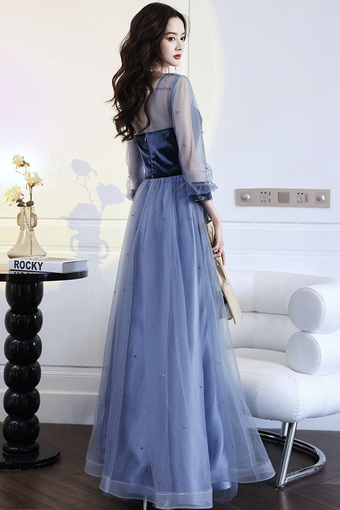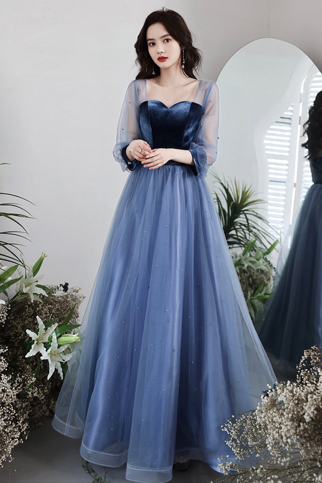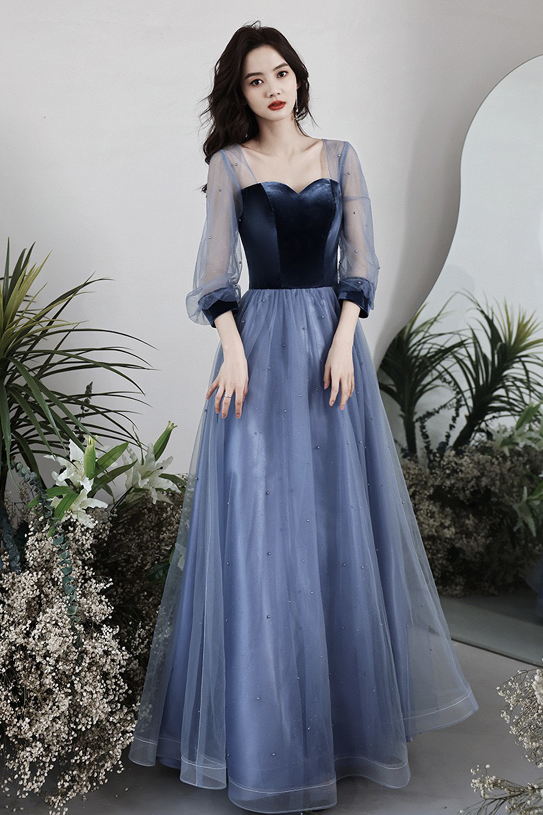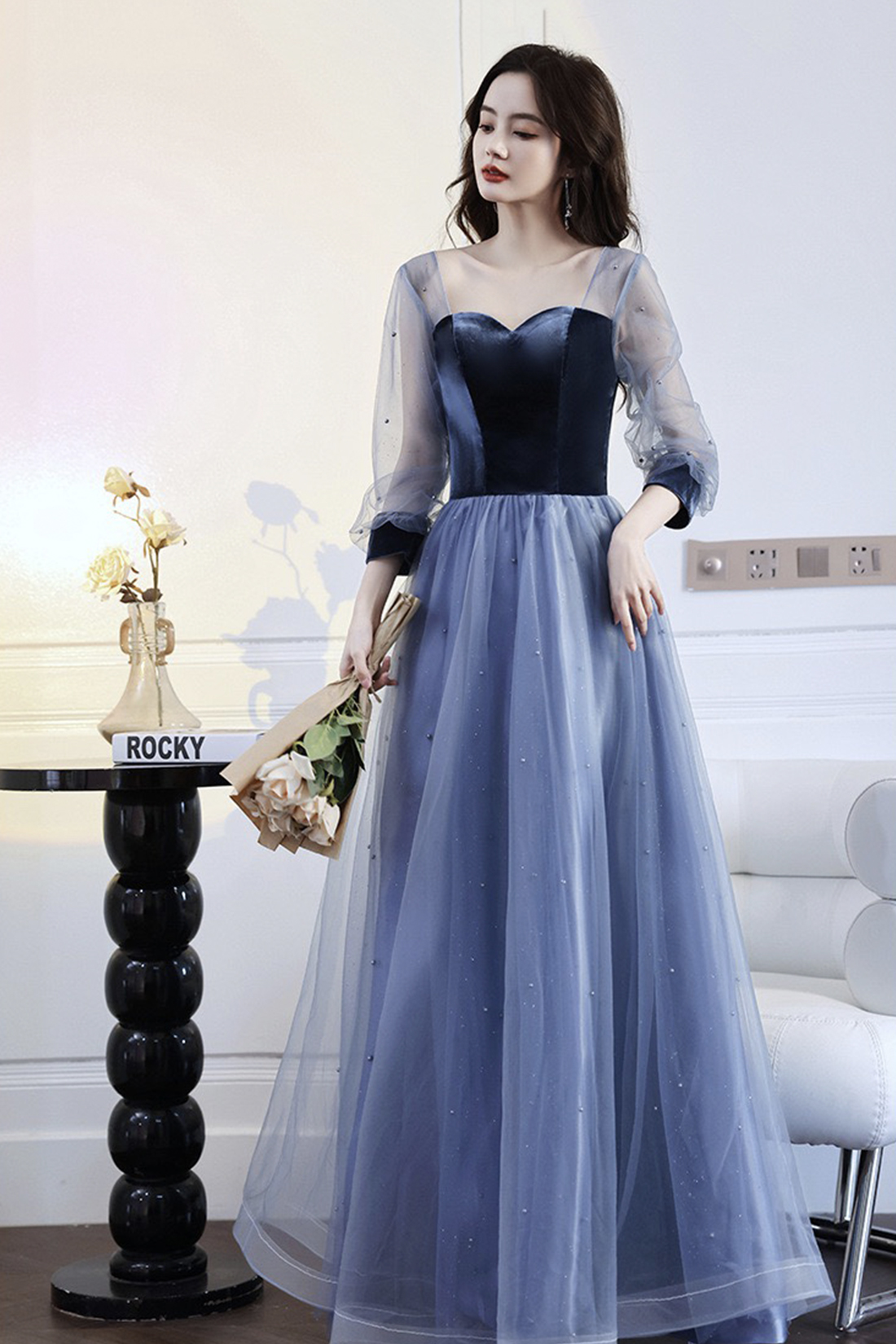 - Blue Velvet Tulle Long Prom Dress, Beautiful Long Sleeve Evening Dress -