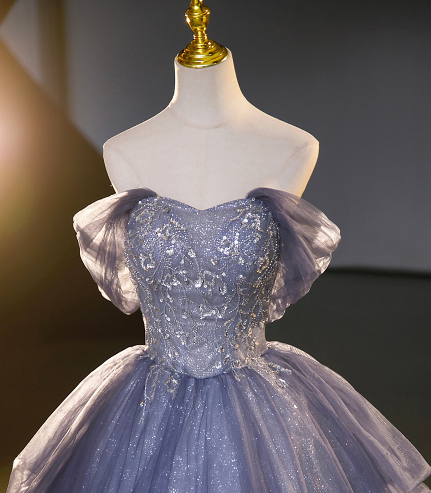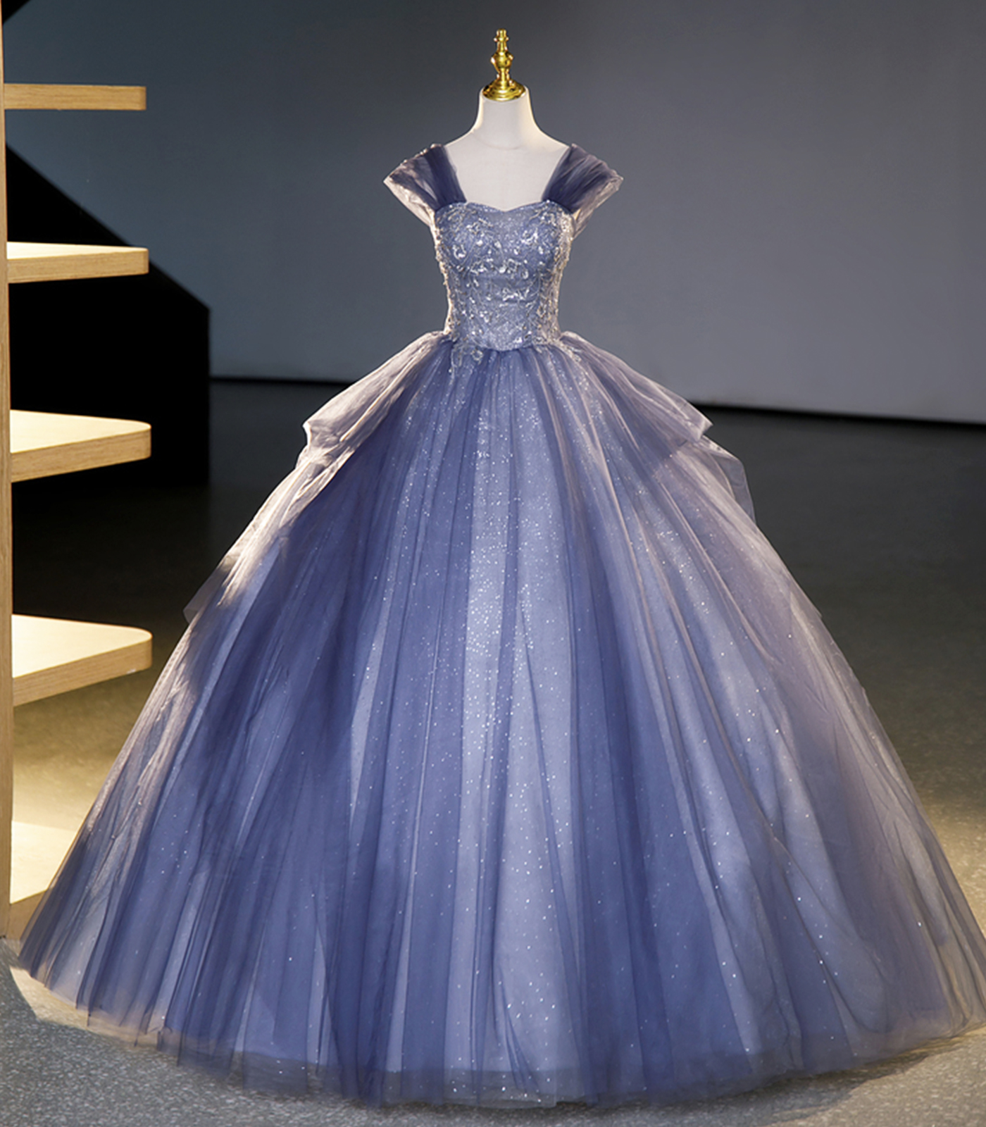 - Blue Tulle Sequins Long Ball Gown, A-Line Tulle Prom Dress -