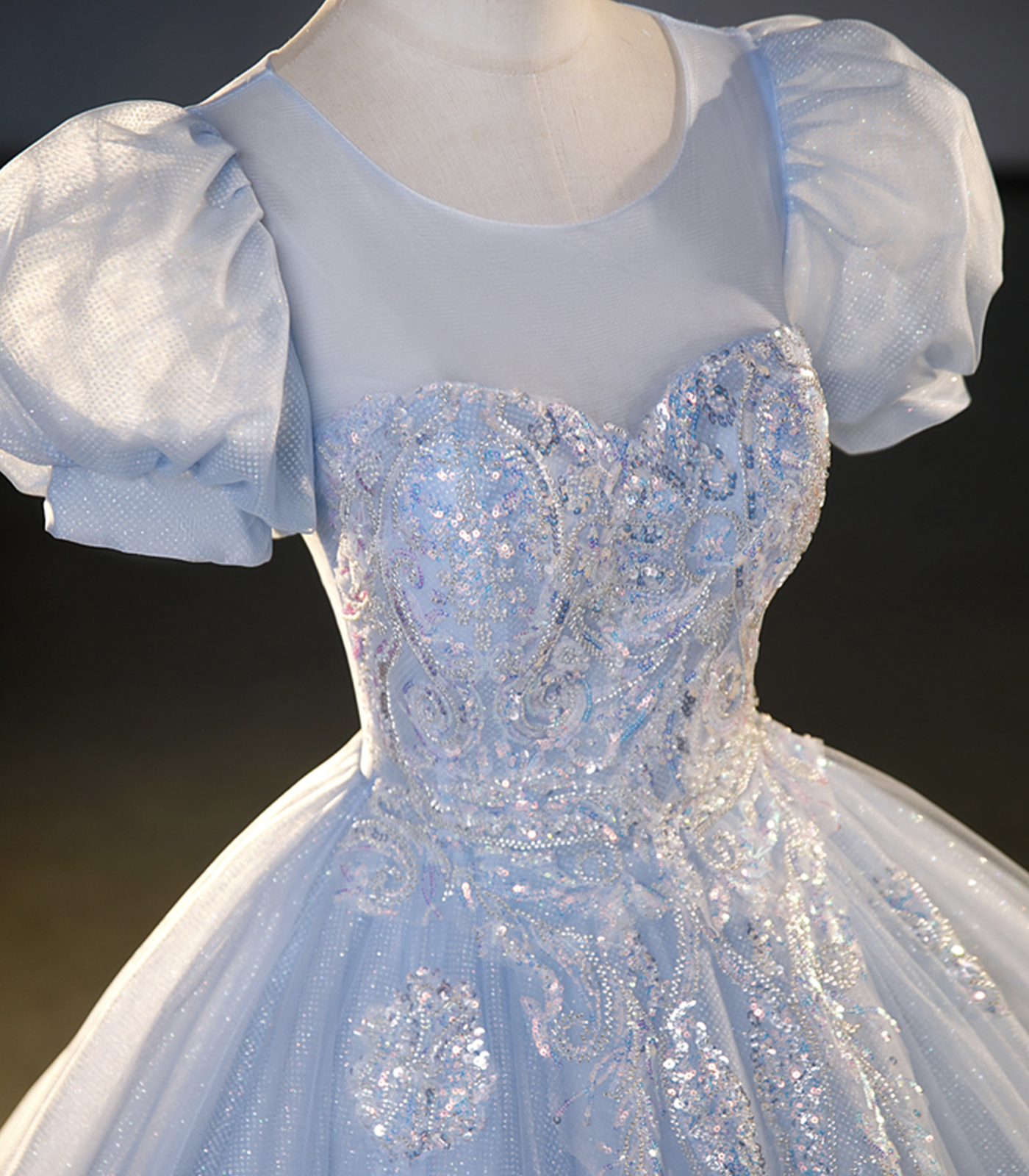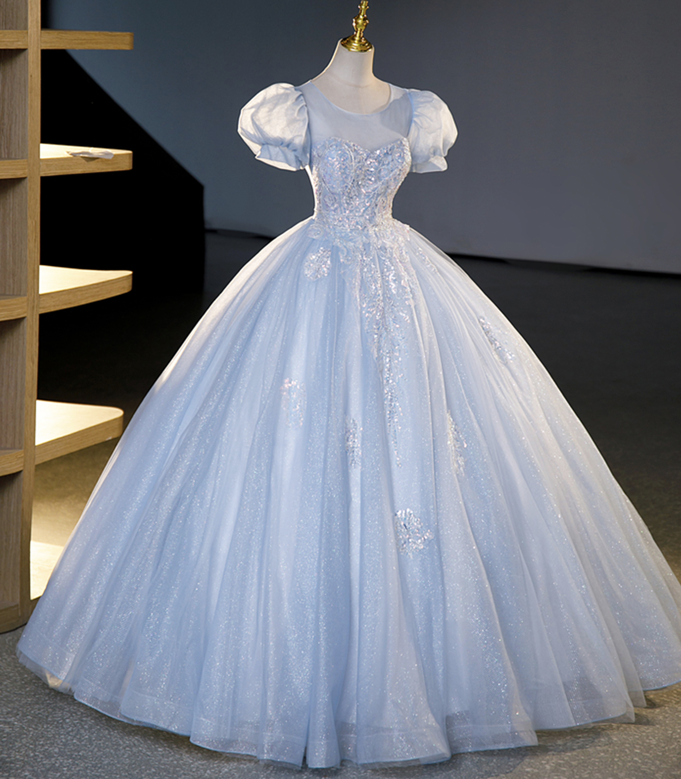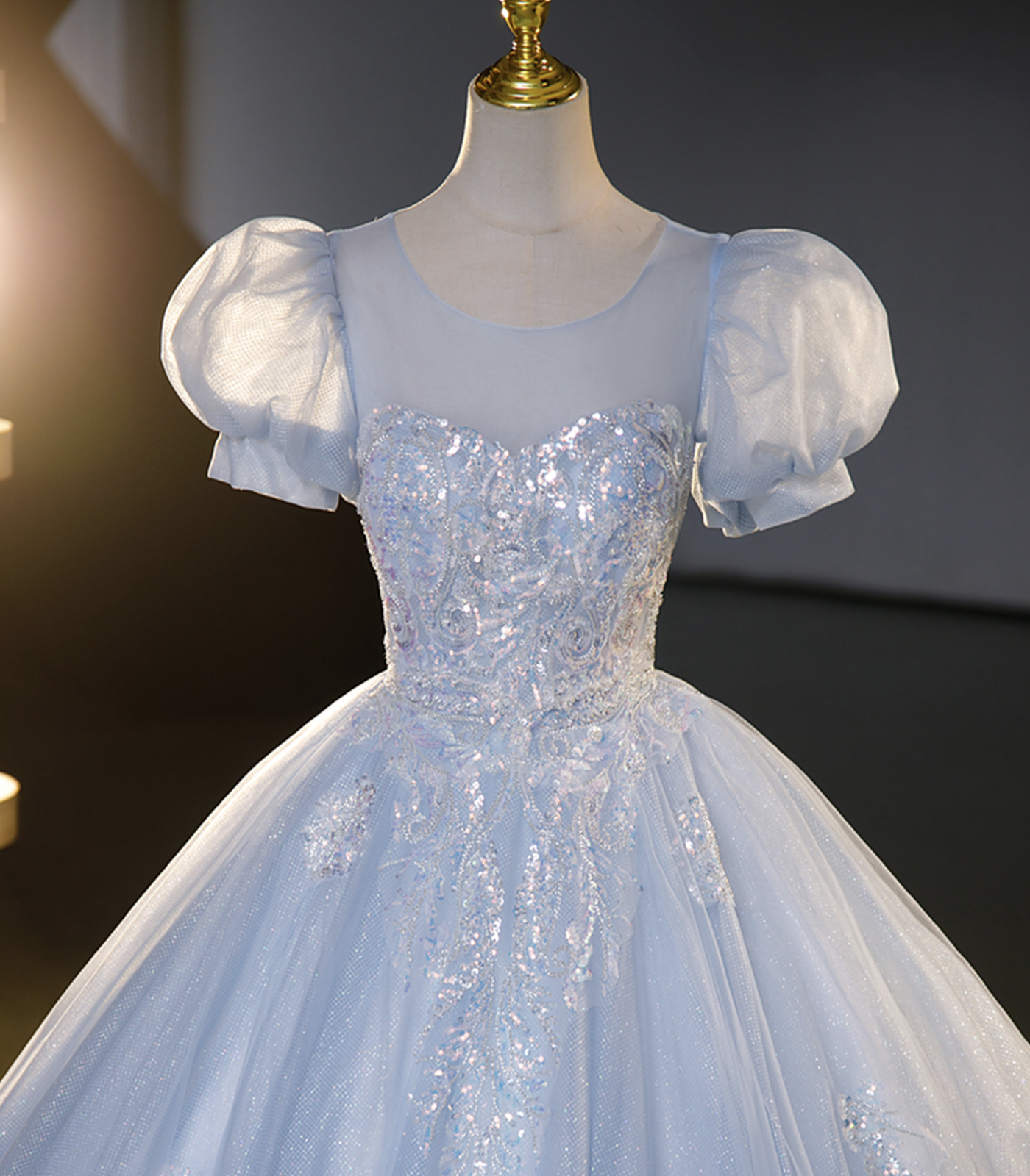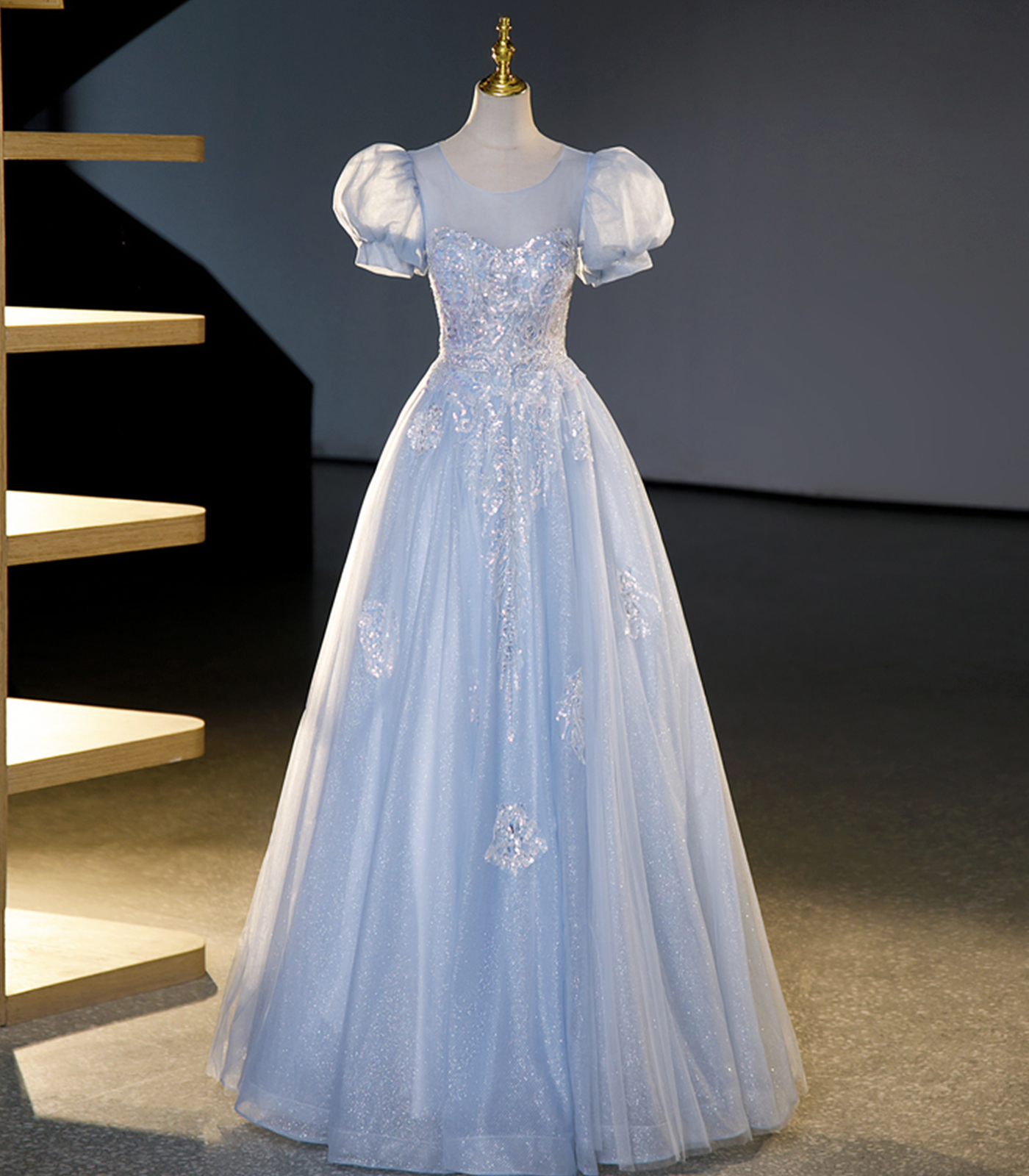 - Blue Tulle Sequins Long Prom Dresses, Blue Formal Dress -