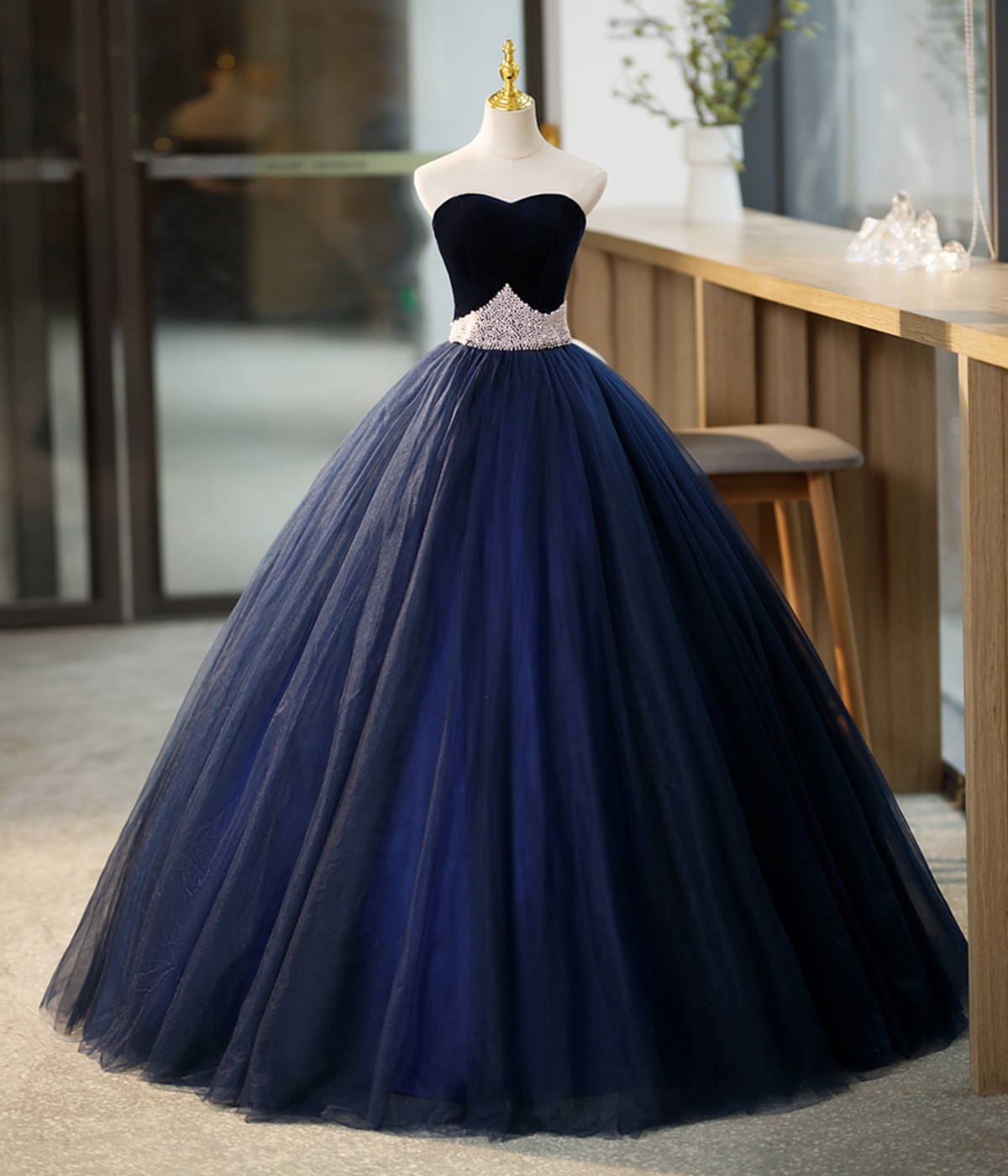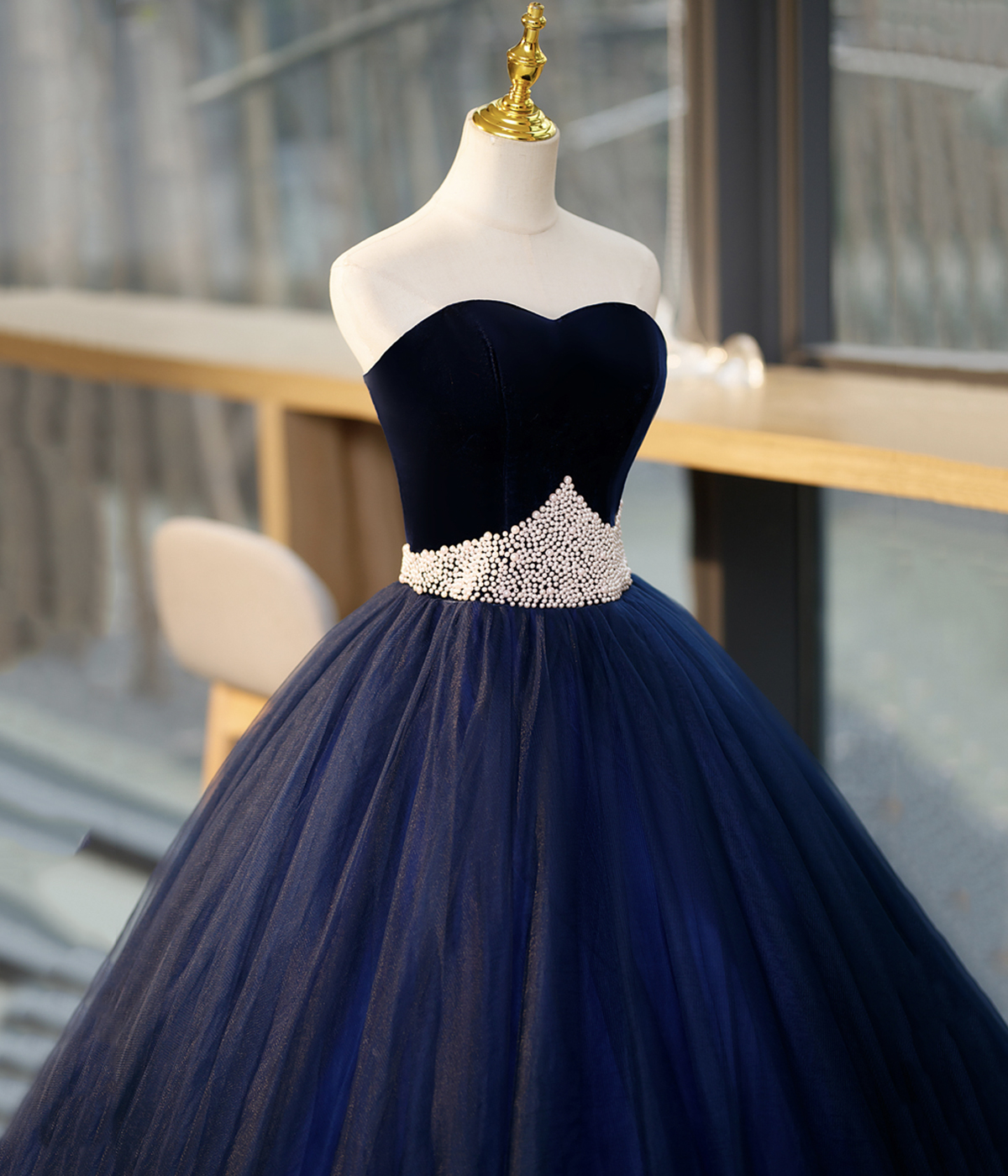 - Blue Tulle Long Formal Dress with Velvet, Blue Sweetheart Neck Prom Dress -
