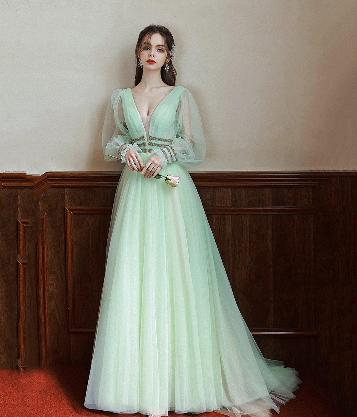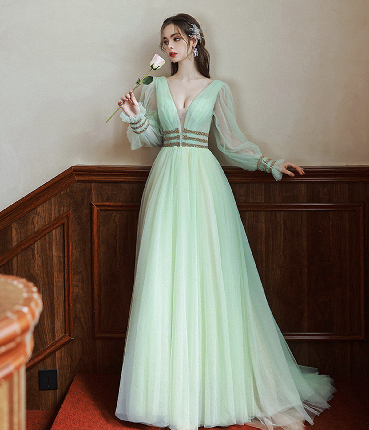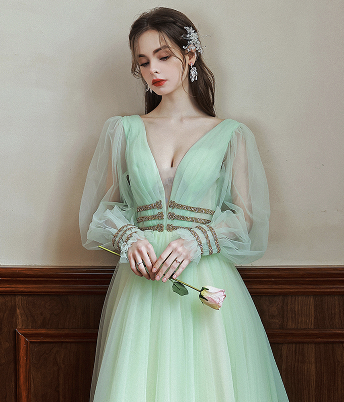 - Green V-Neck Tulle Long Prom Dress, Long Sleeve Evening Dress -