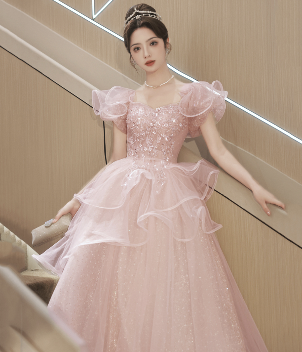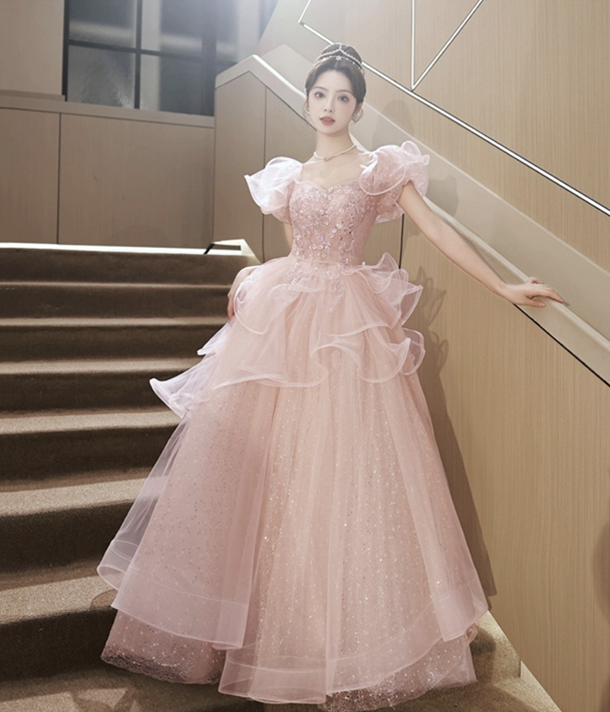 - Pink Tulle Sequins Long Prom Dress, Lovely Short Sleeve Evening Dress, Pink Formal Dress -