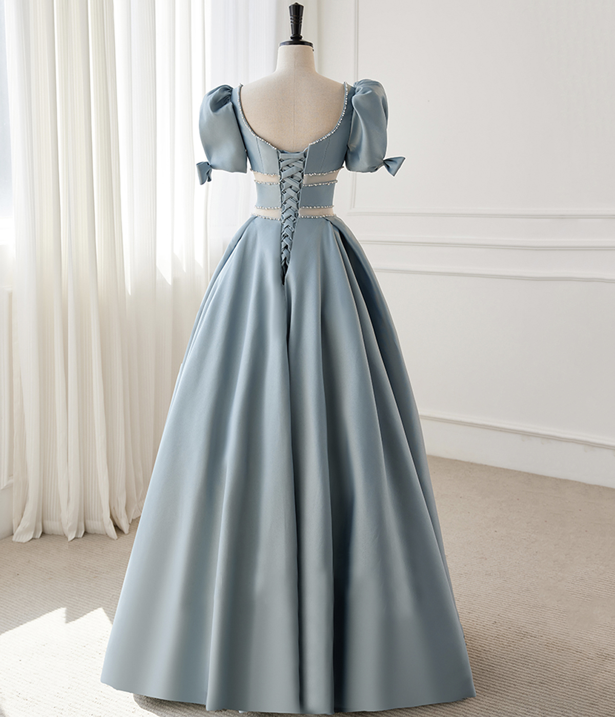 - Blue Satin Beaded Long Prom Dress, Blue Short Sleeve Evening Dress -