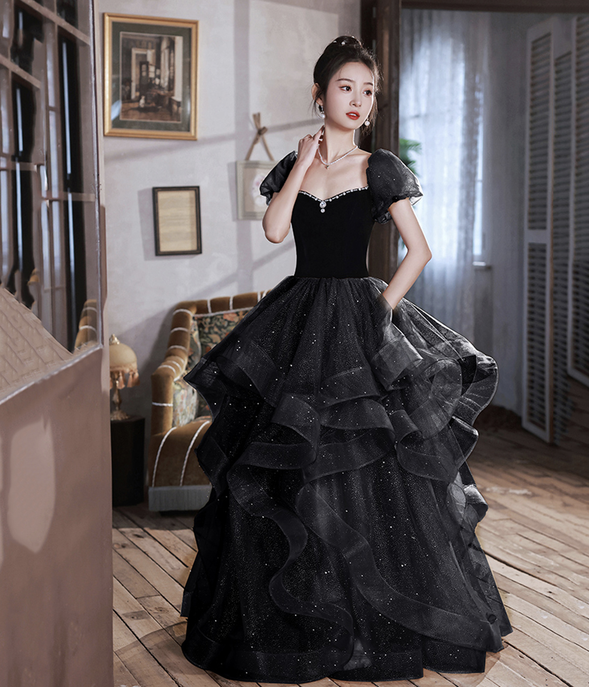 - Black Velvet Tulle Long Prom Dress, Black Evening Dress Party Dress -