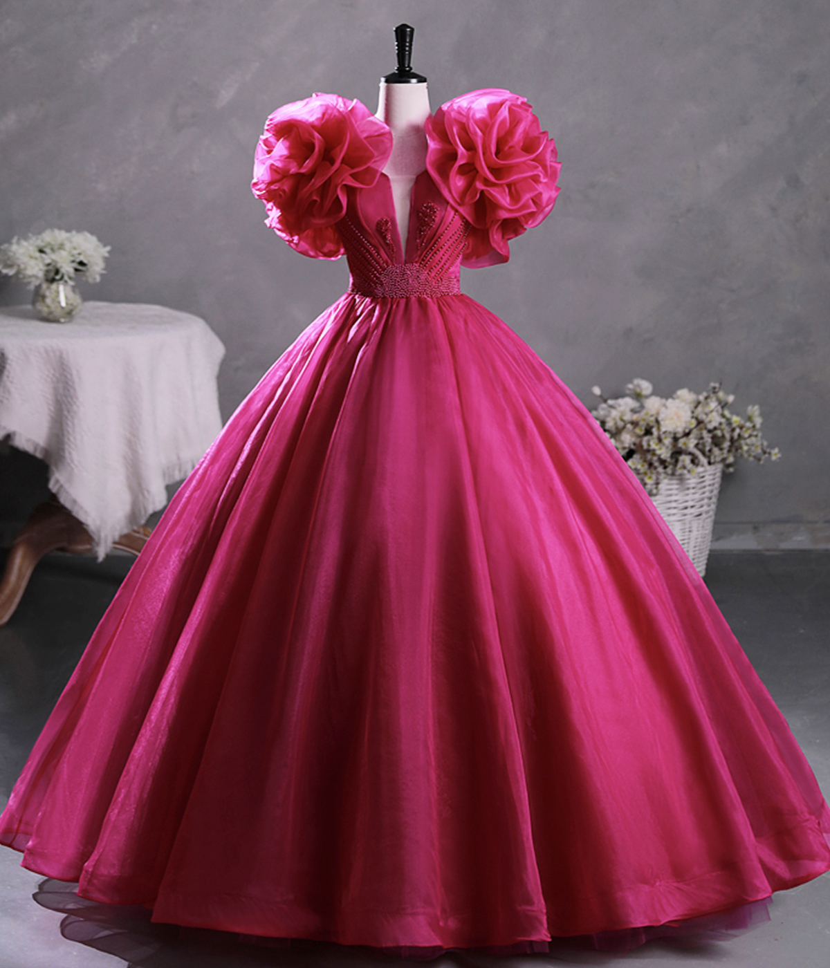 - Hot Pink V-Neck Tulle Long Prom Dresses, Beautiful Sweet 16 Dresses -