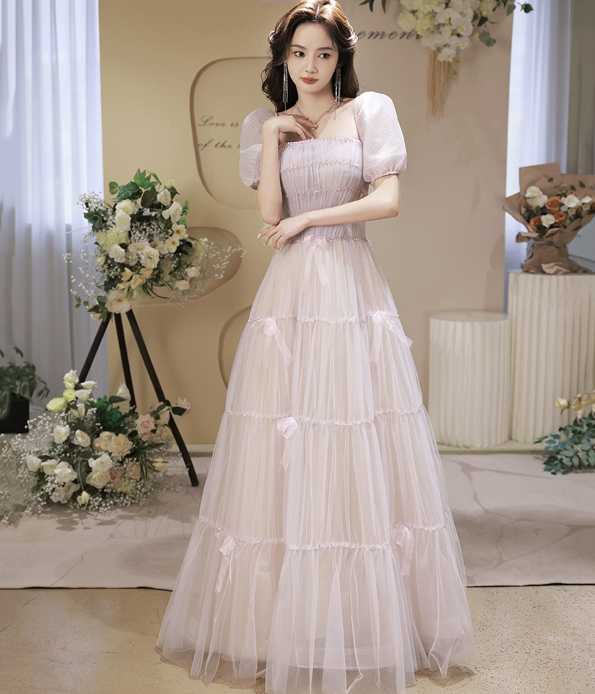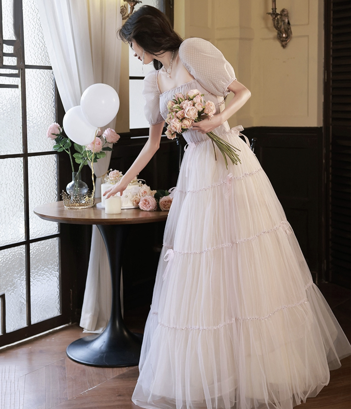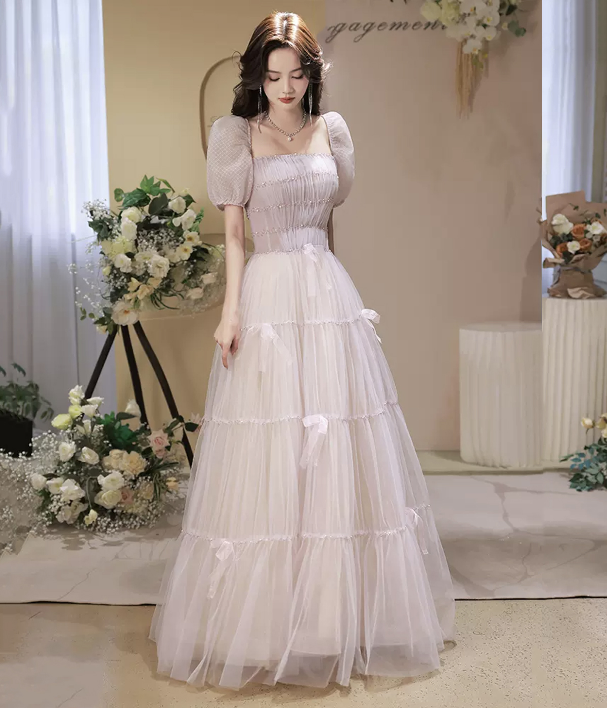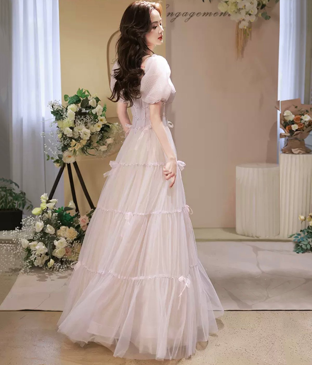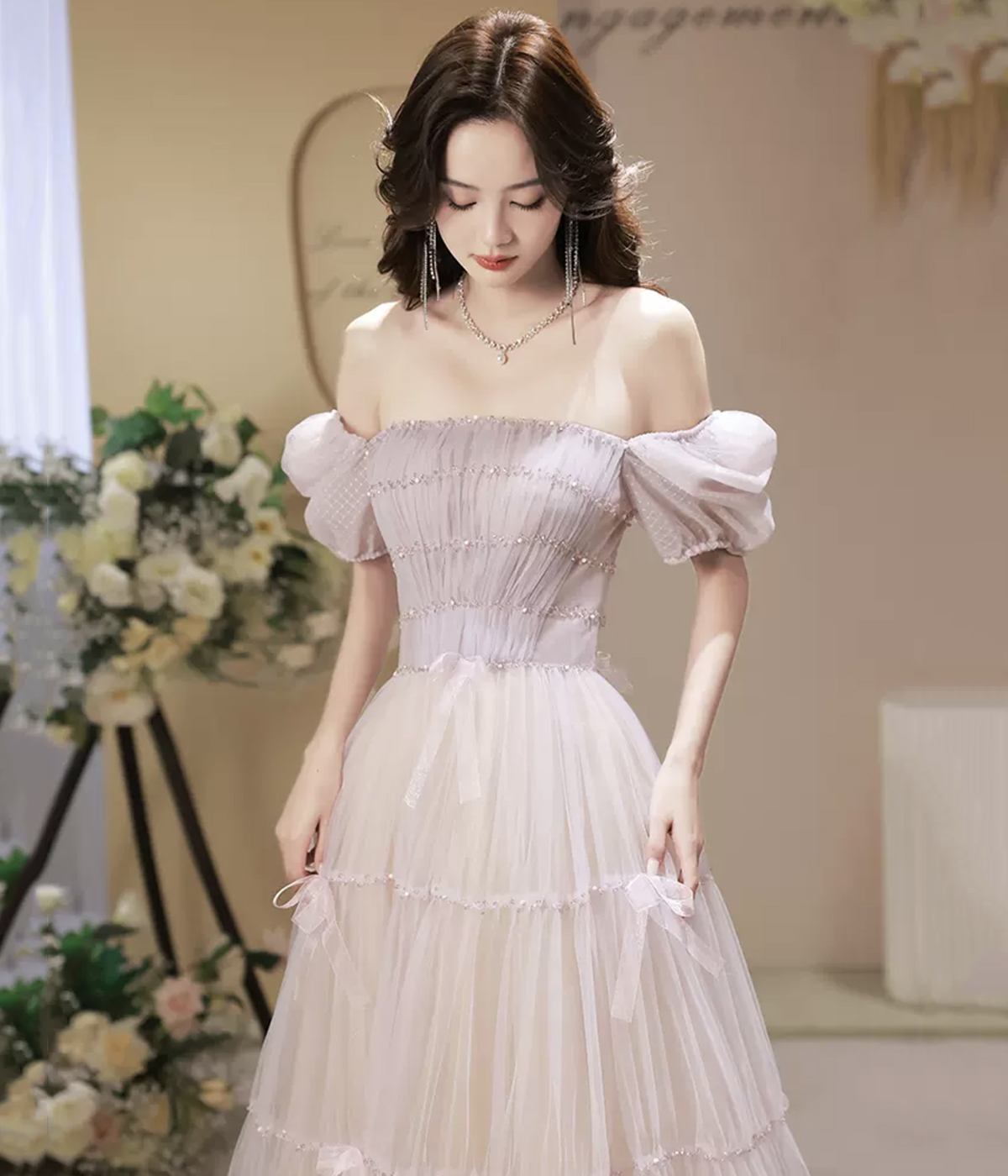 - Pink Tulle Beaded Long Prom Dress, Pink Off Shoulder Evening Dress -