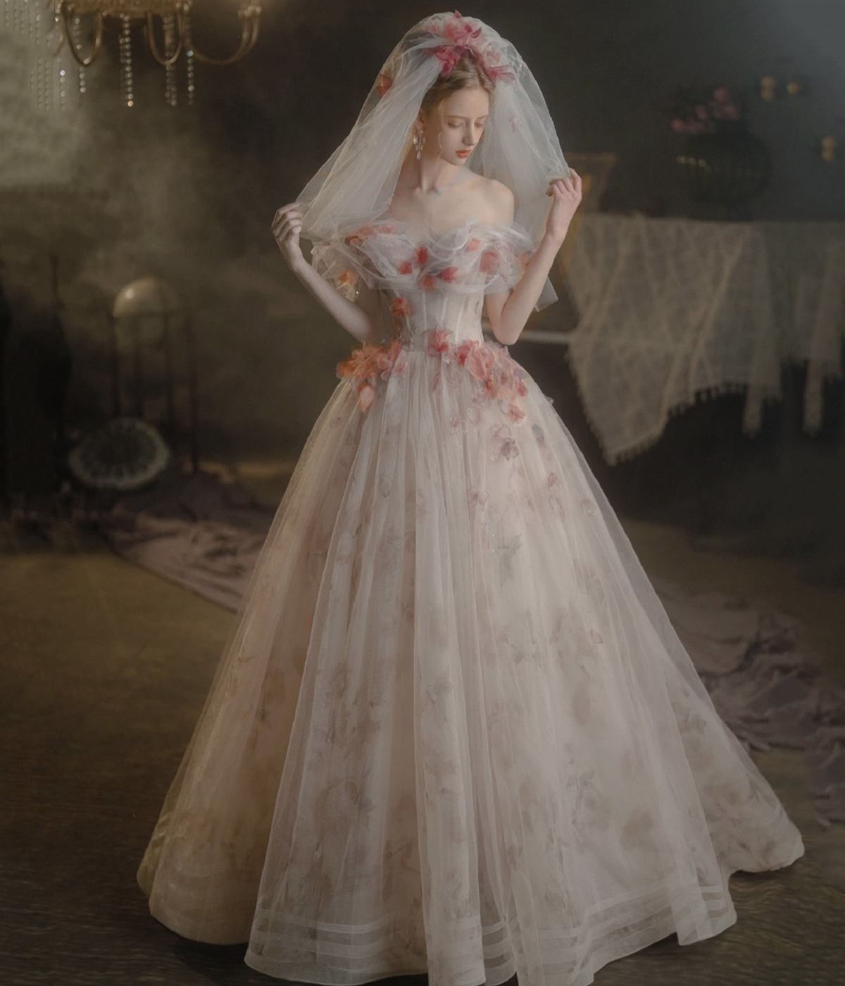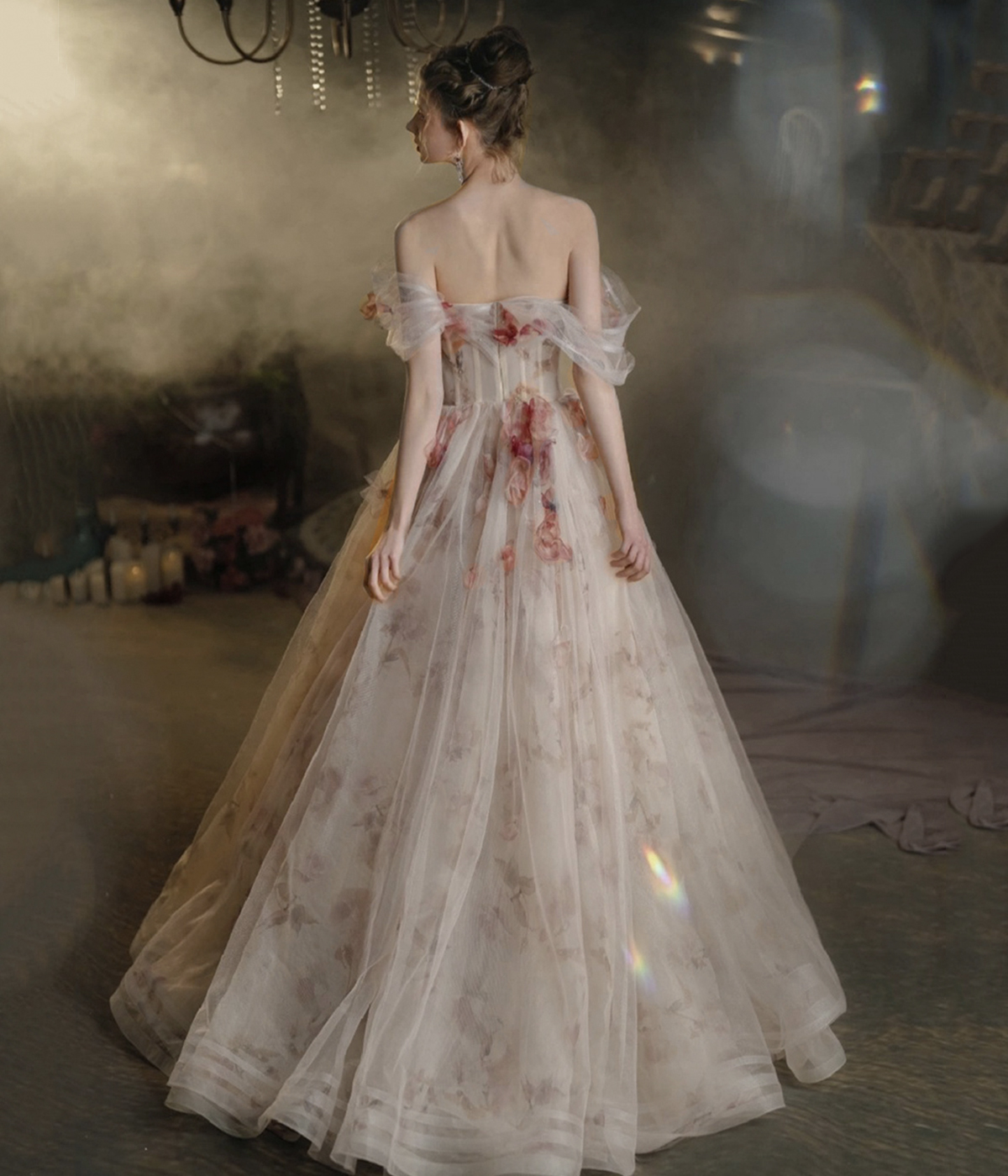 - Champagne Tulle Long Prom Dress, Off Shoulder Evening Party Dress -