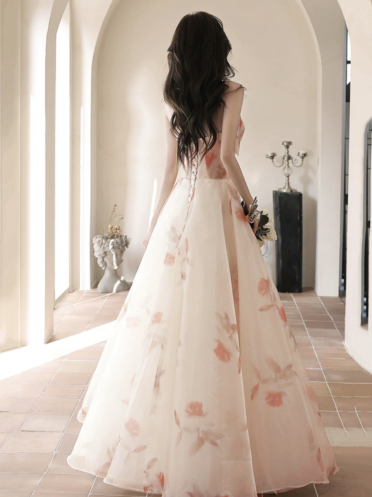 - Champagne Tulle Long Prom Dress with Bow, Cute A-Line Evening Party Dress -