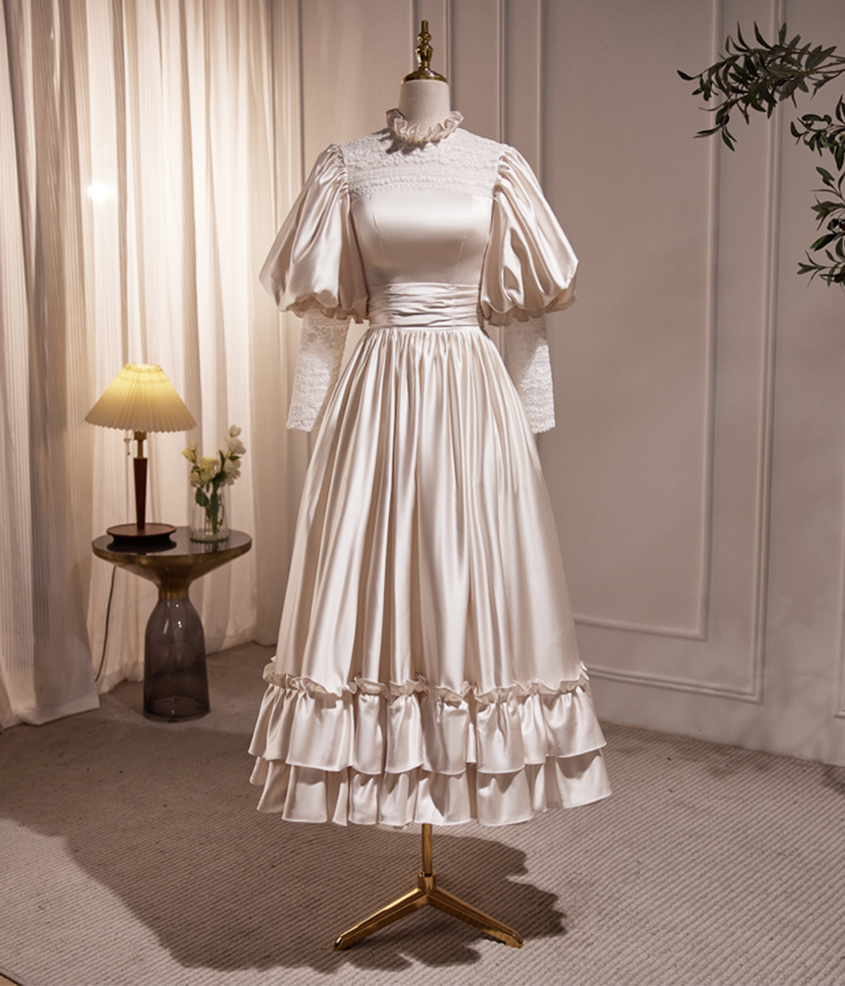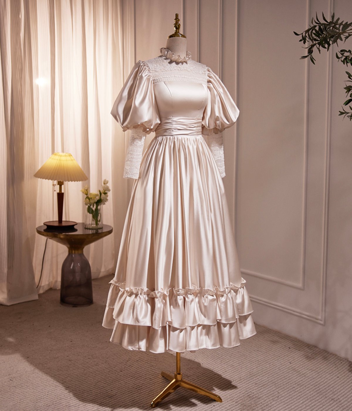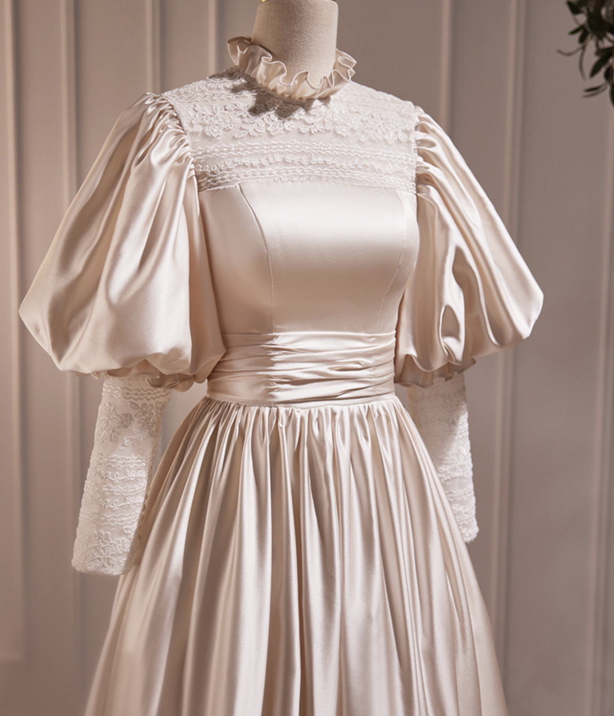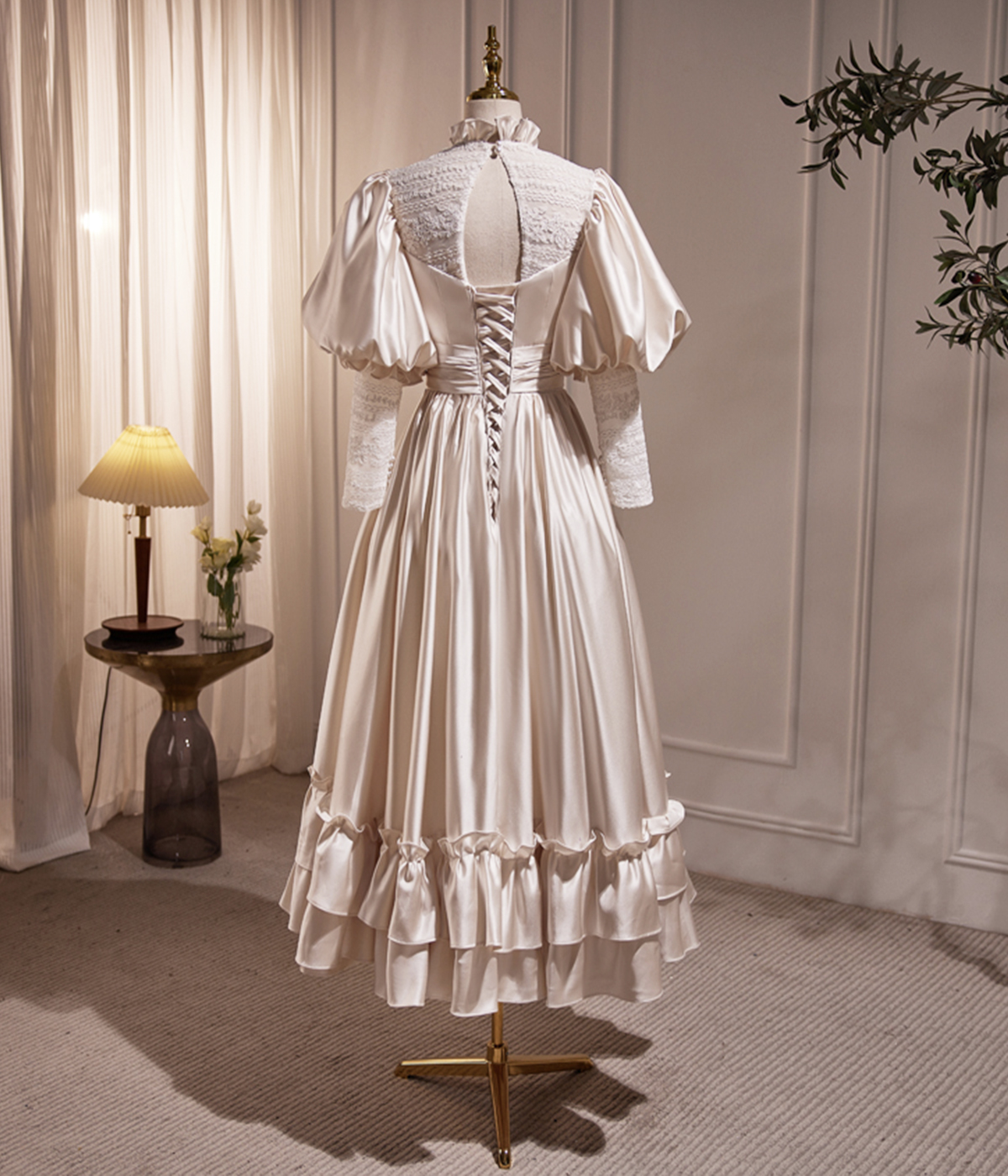 - Champagne Satin Lace Long Sleeve Prom Dress -