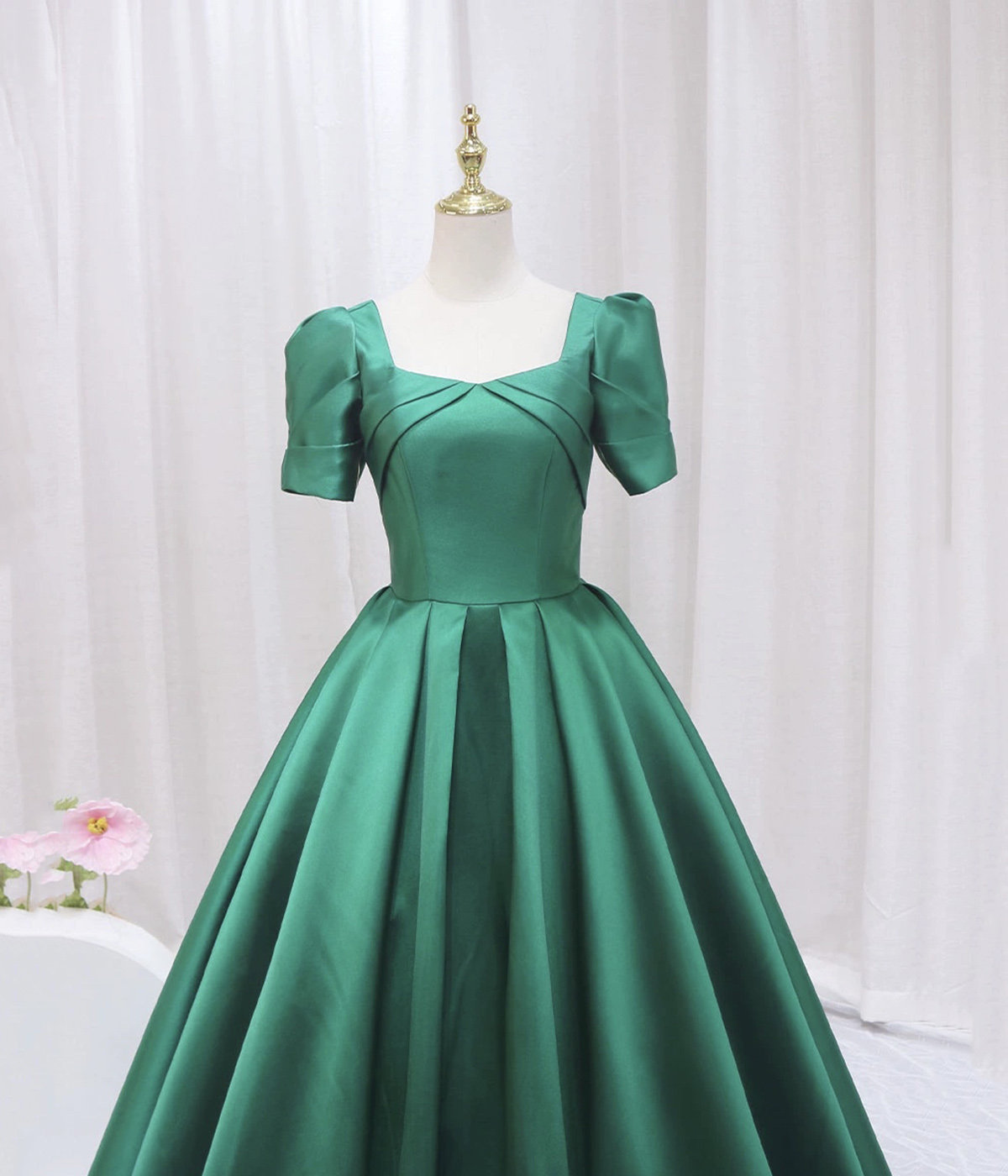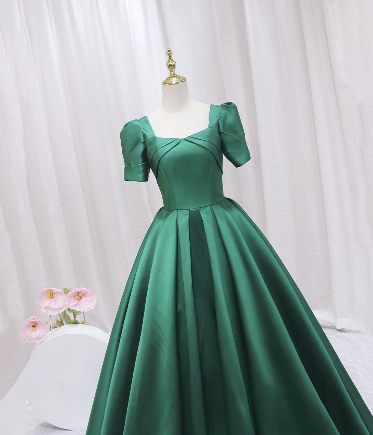 - Green Satin Short Sleeve Long Formal Dress, Simple Green A-Line Prom Dress -