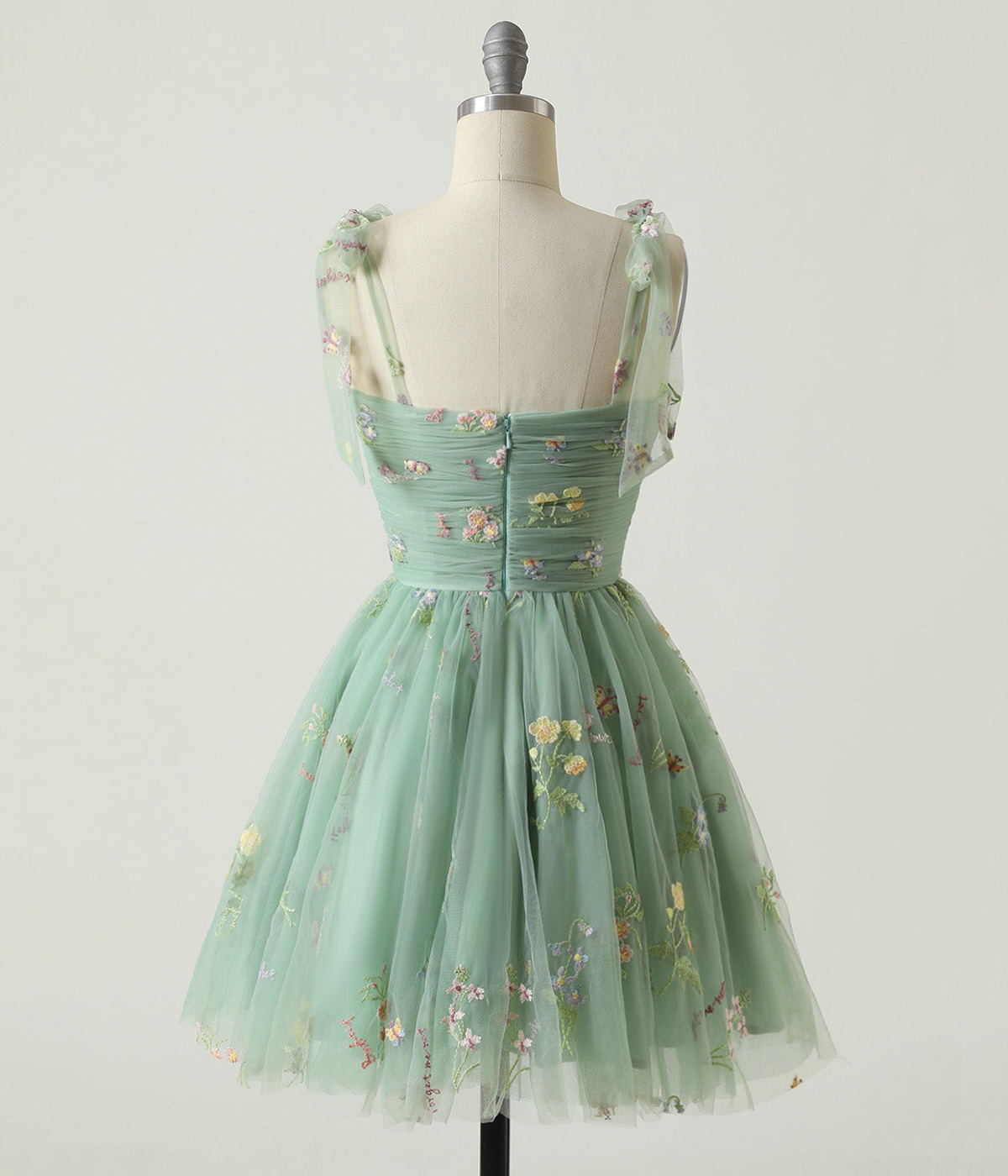 - Green Spaghetti Straps A Line Tulle Floral Short Prom Dress -