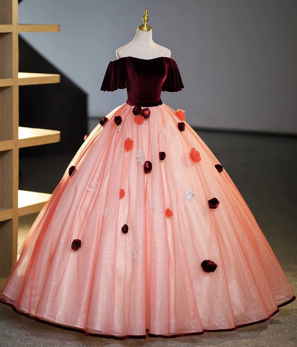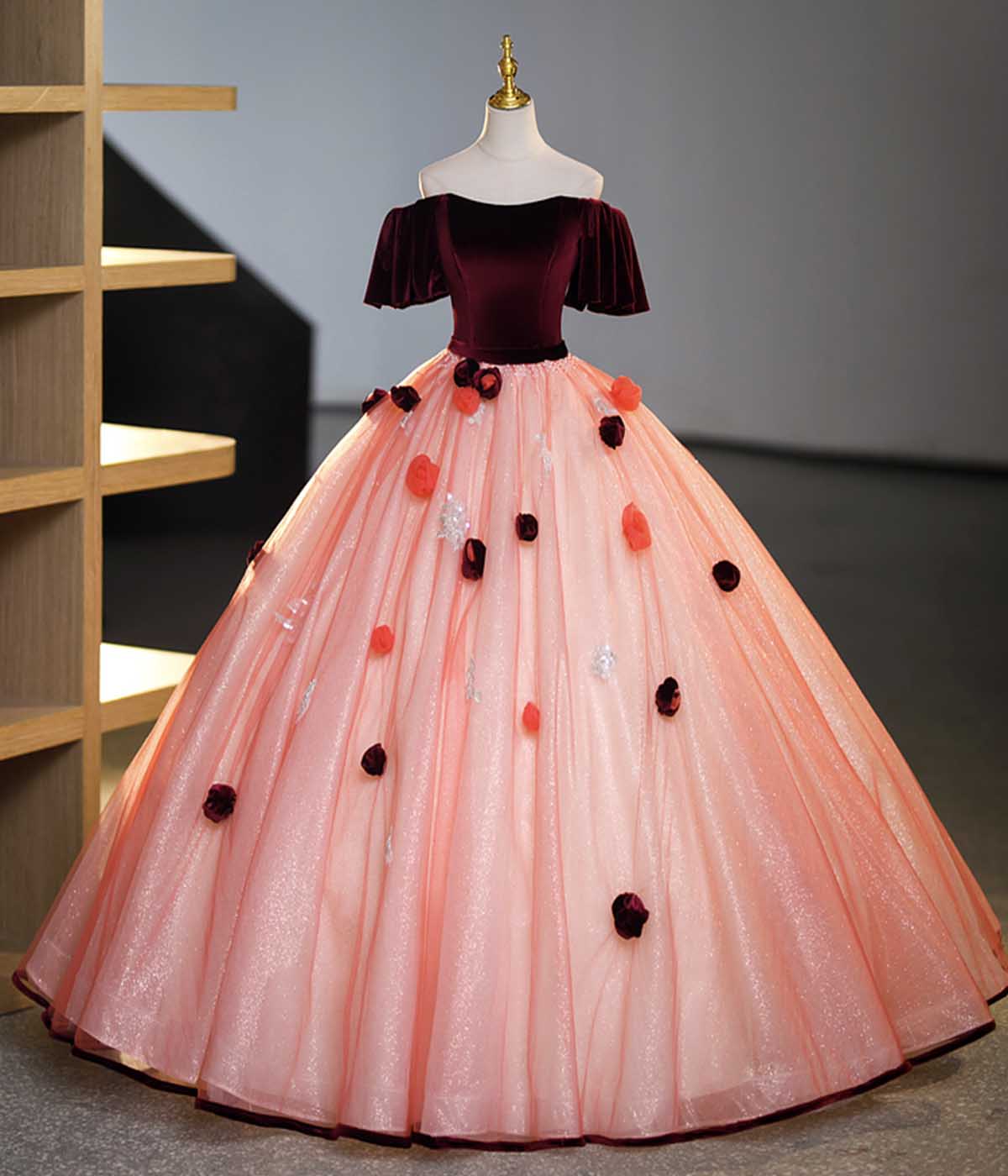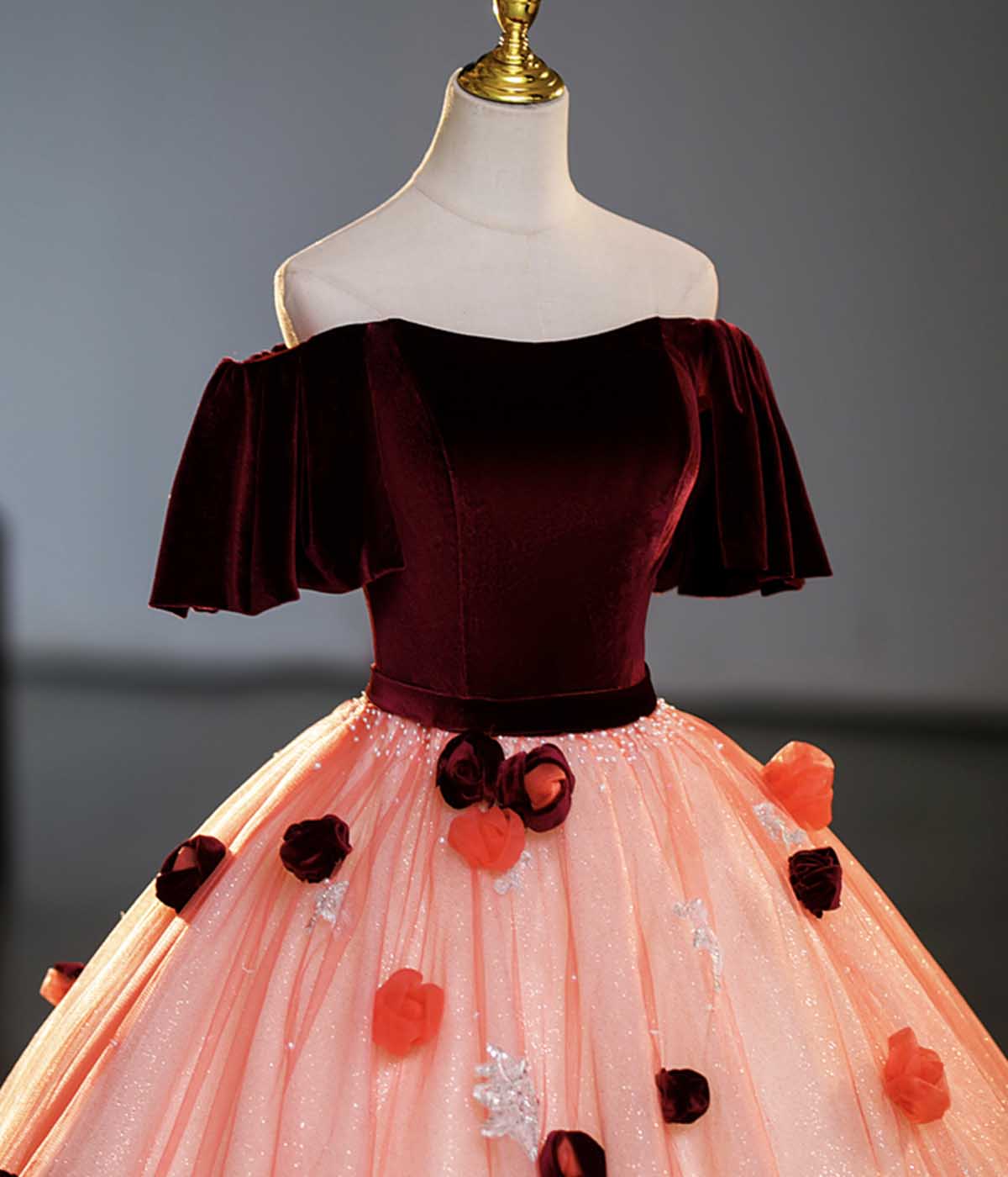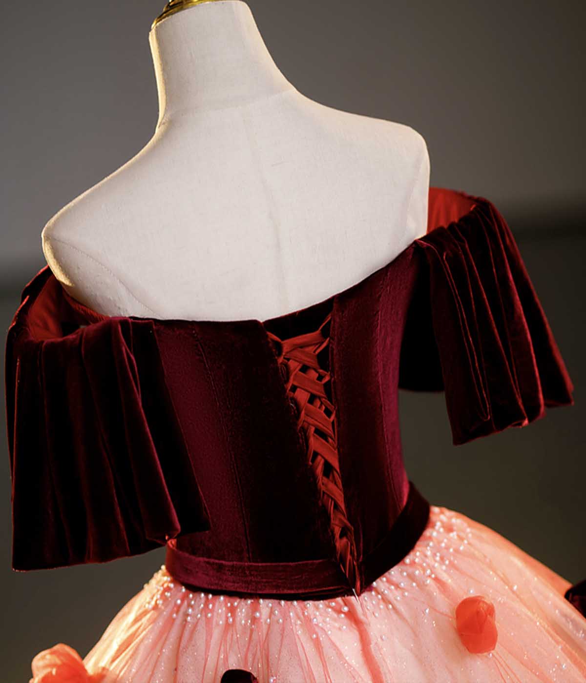 - Burgundy Velvet Tulle Long Formal Dress, Off the Shoulder Sweet Flower Party Dress -