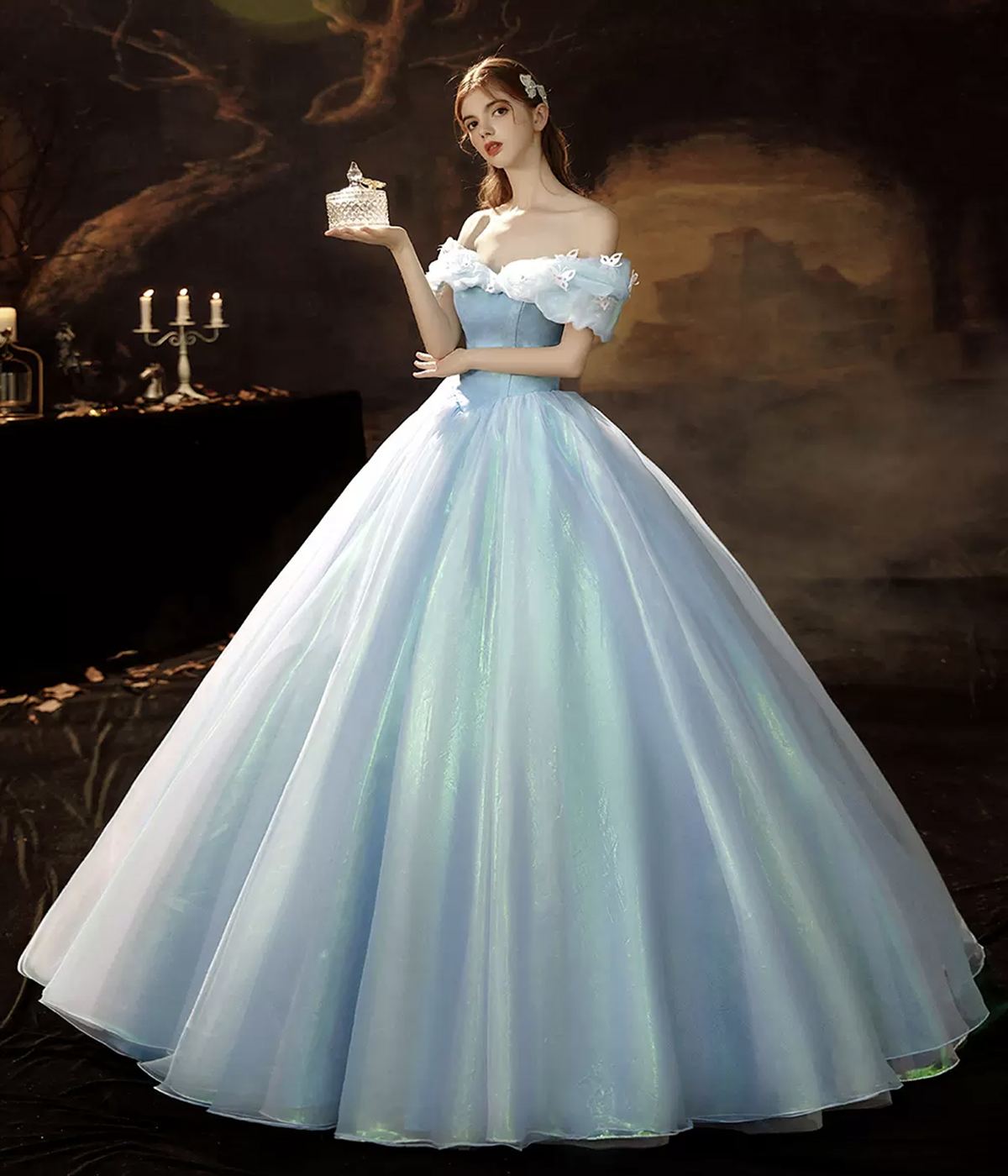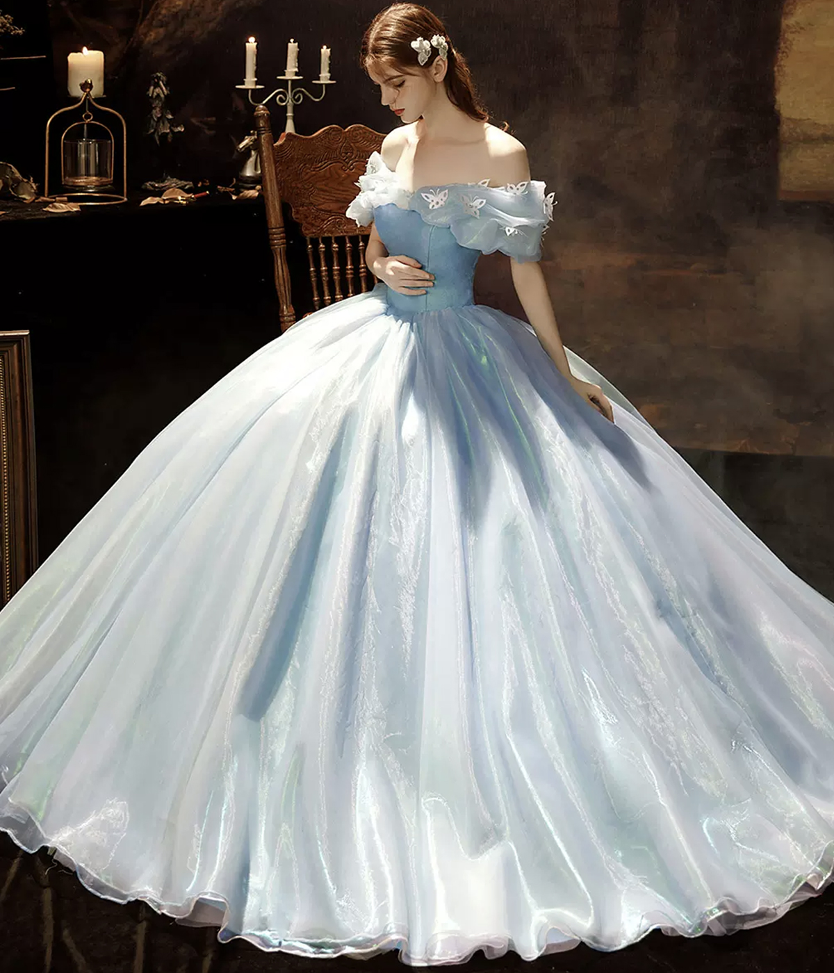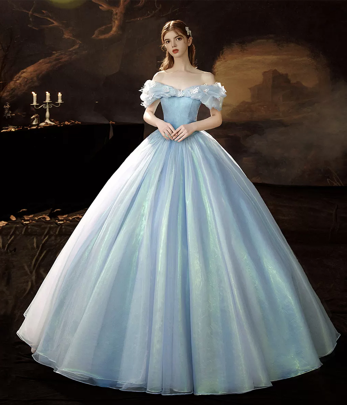 - Blue Tulle Long Princess Dress, A-Line Off the Shoulder Evening Party Dress -