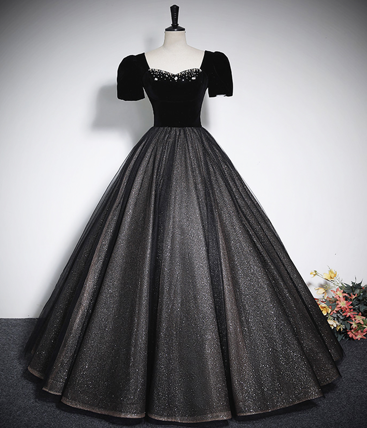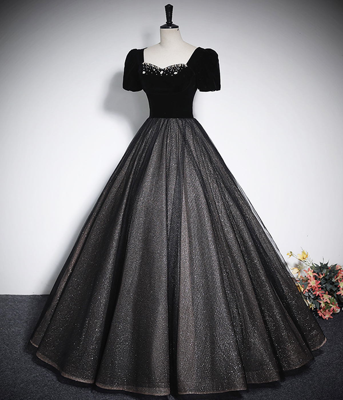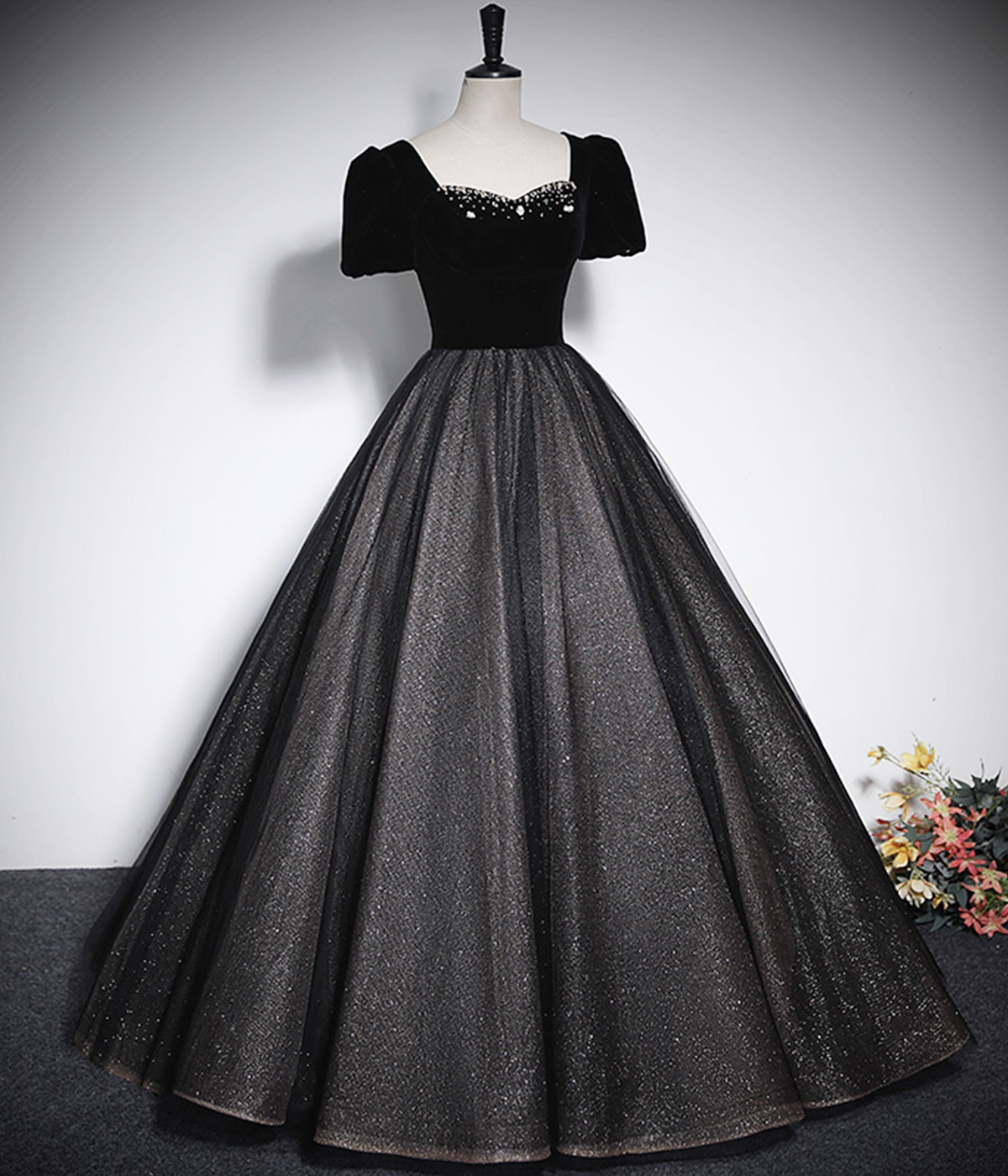 Black Velvet Tulle Long A-Line Prom Dress, Black Short Sleeve Evening Dress