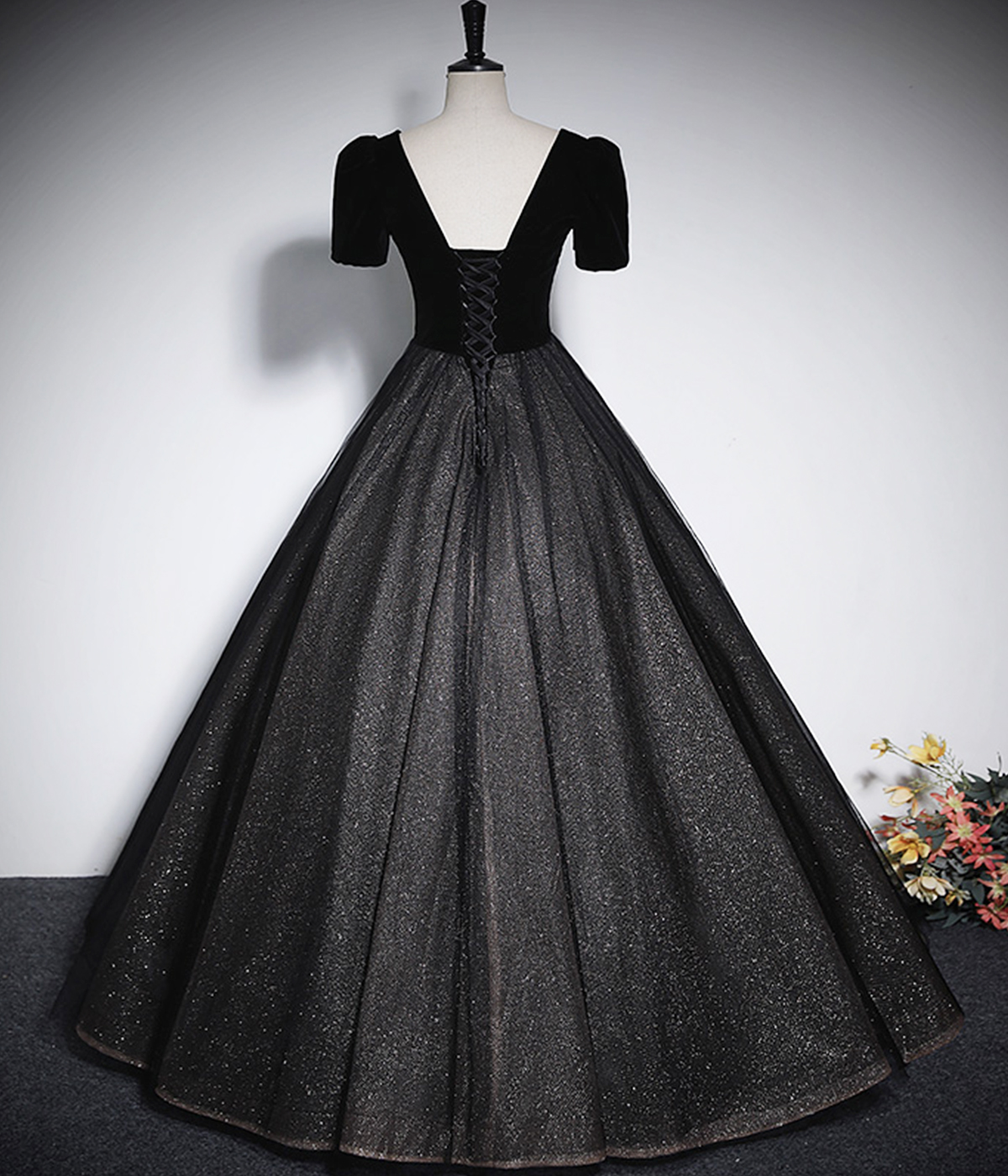 - Black Velvet Tulle Long A-Line Prom Dress, Black Short Sleeve Evening Dress -