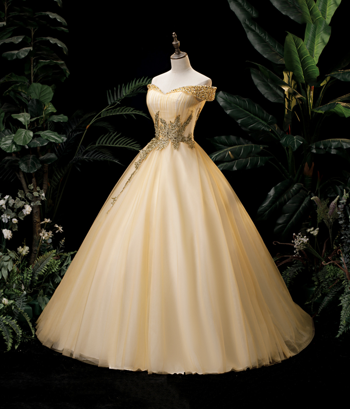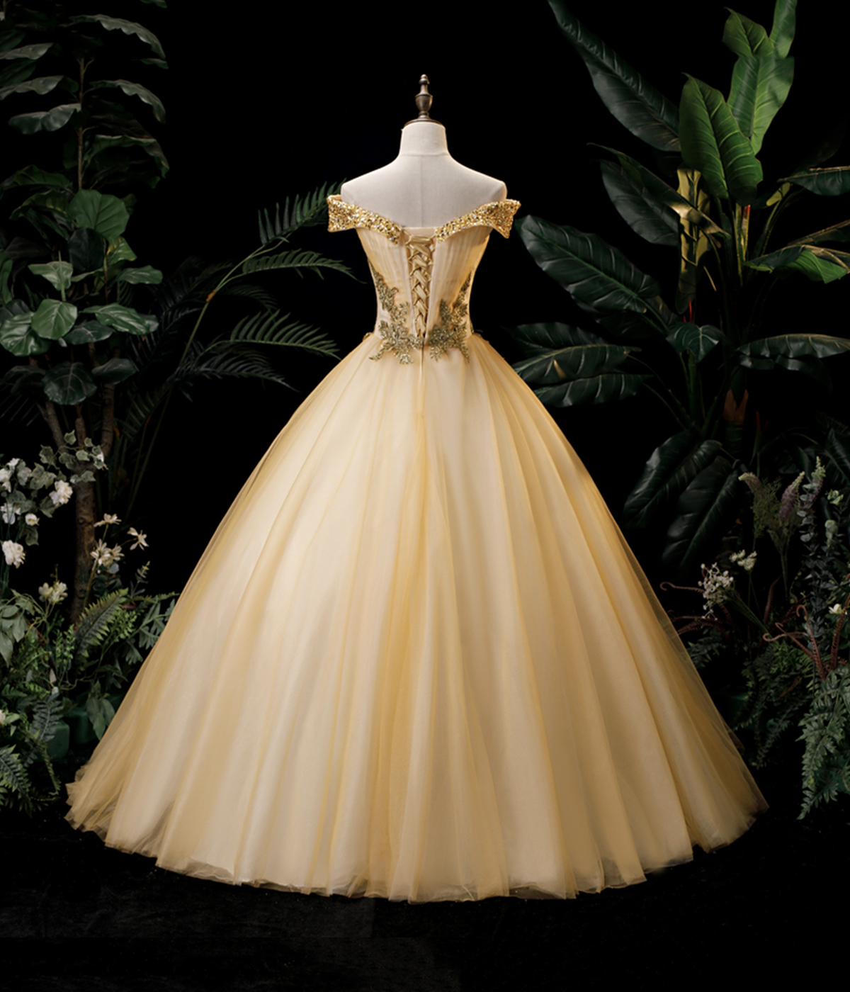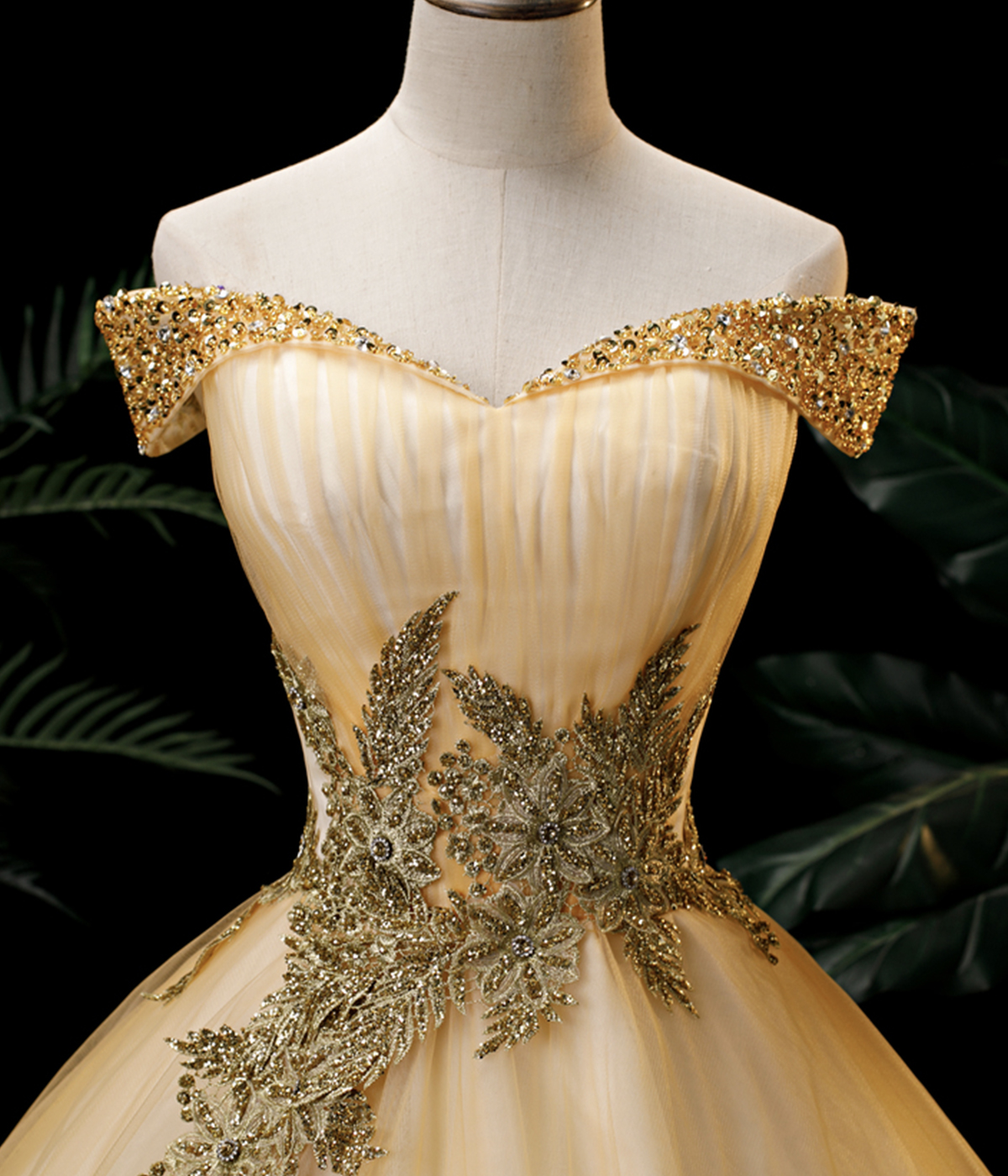 - Gold Tulle Lace Long Formal Dress, A-Line Off the Shoulder Evening Party Dress -
