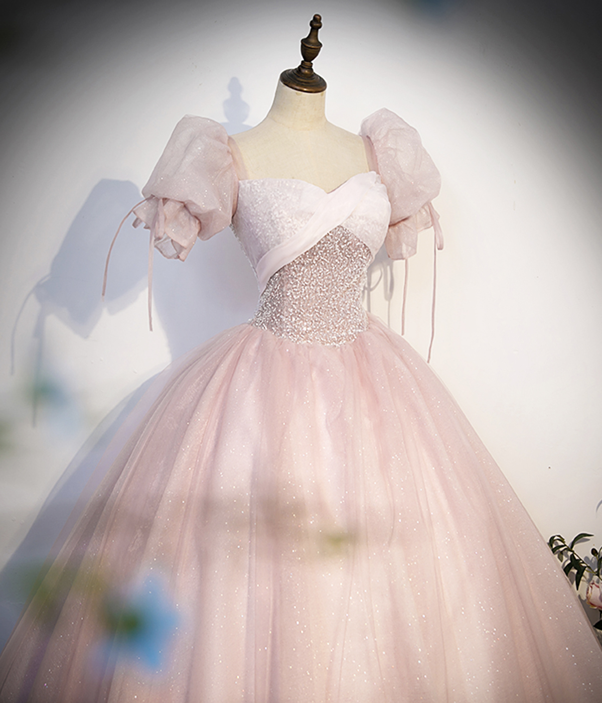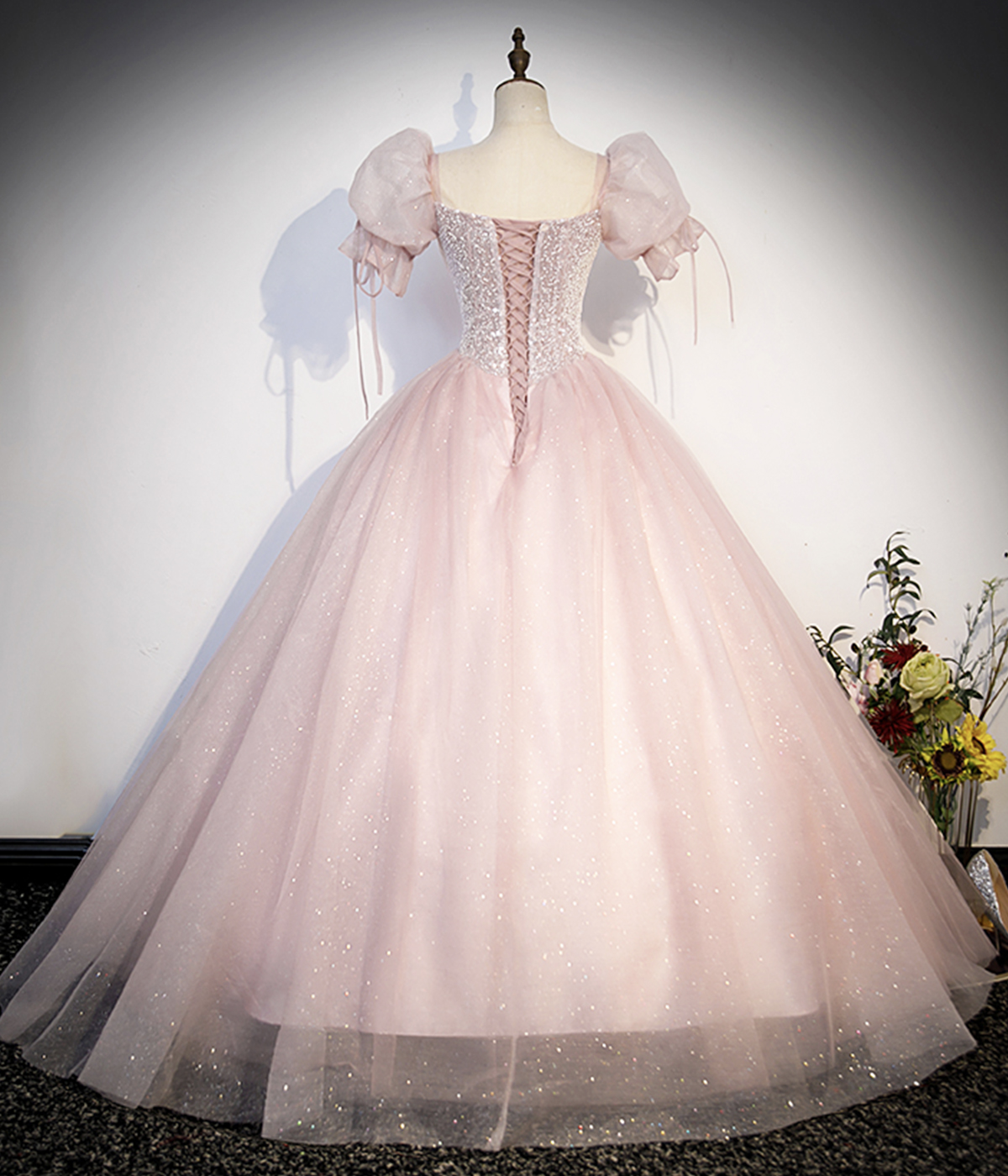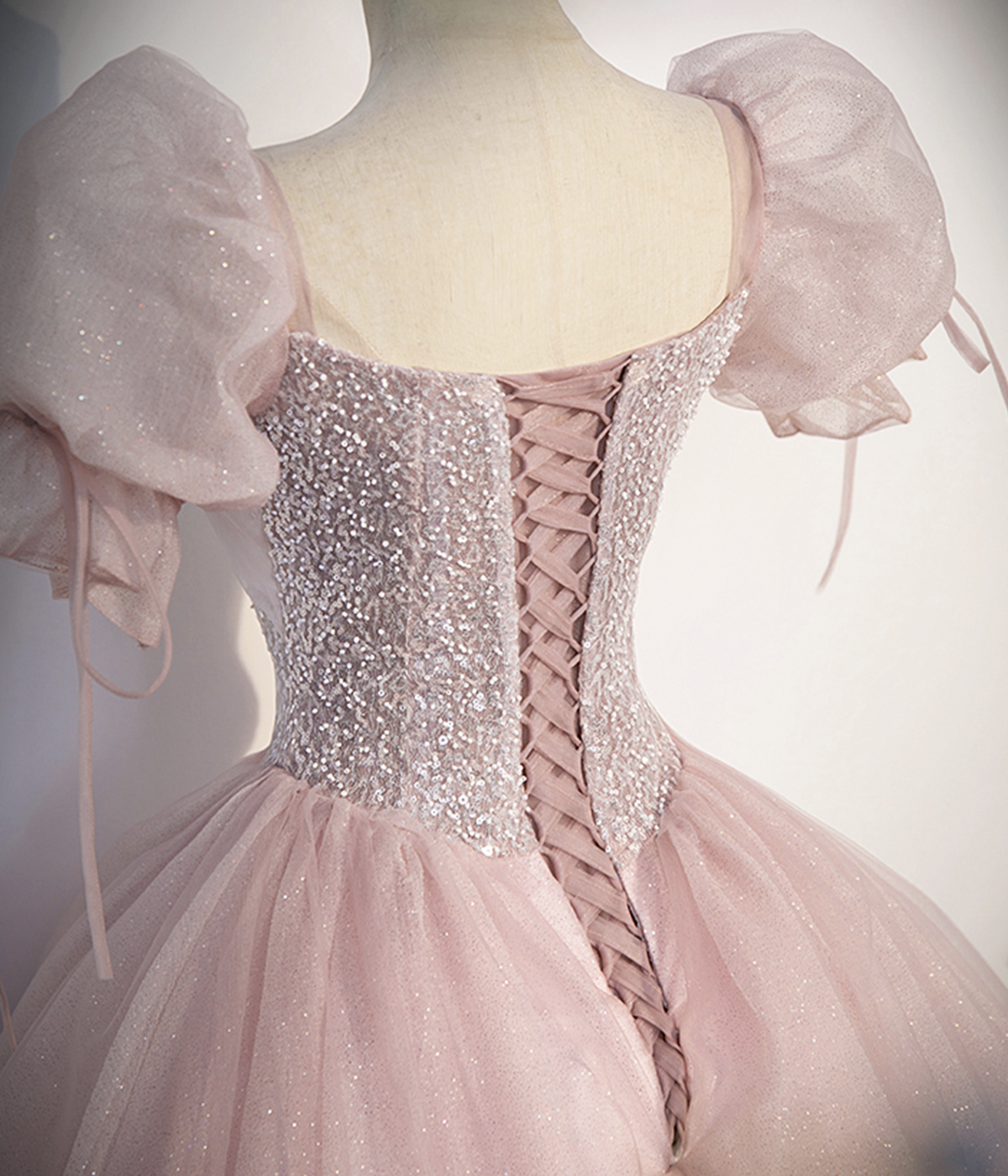 - Lovely Blushing Pink Beading Sequins Prom Dresses, Short Sleeve Backless Floor-Length Formal Dresses -