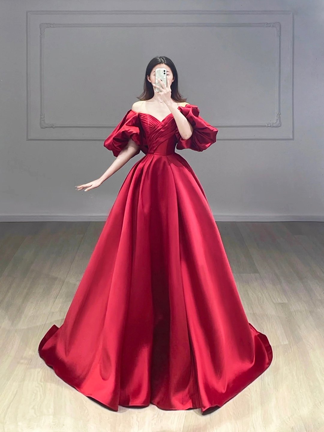 - Burgundy Satin A-Line Prom Dress, Burgundy Puffy Short Sleeve Evening Dress -