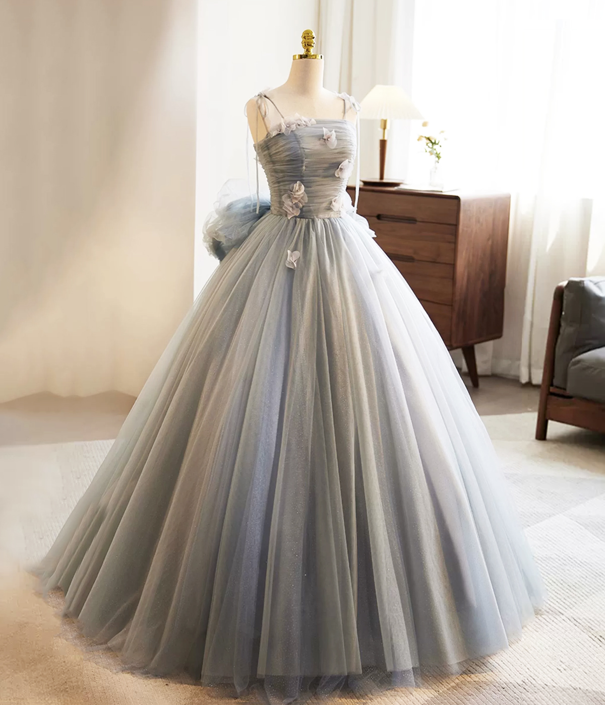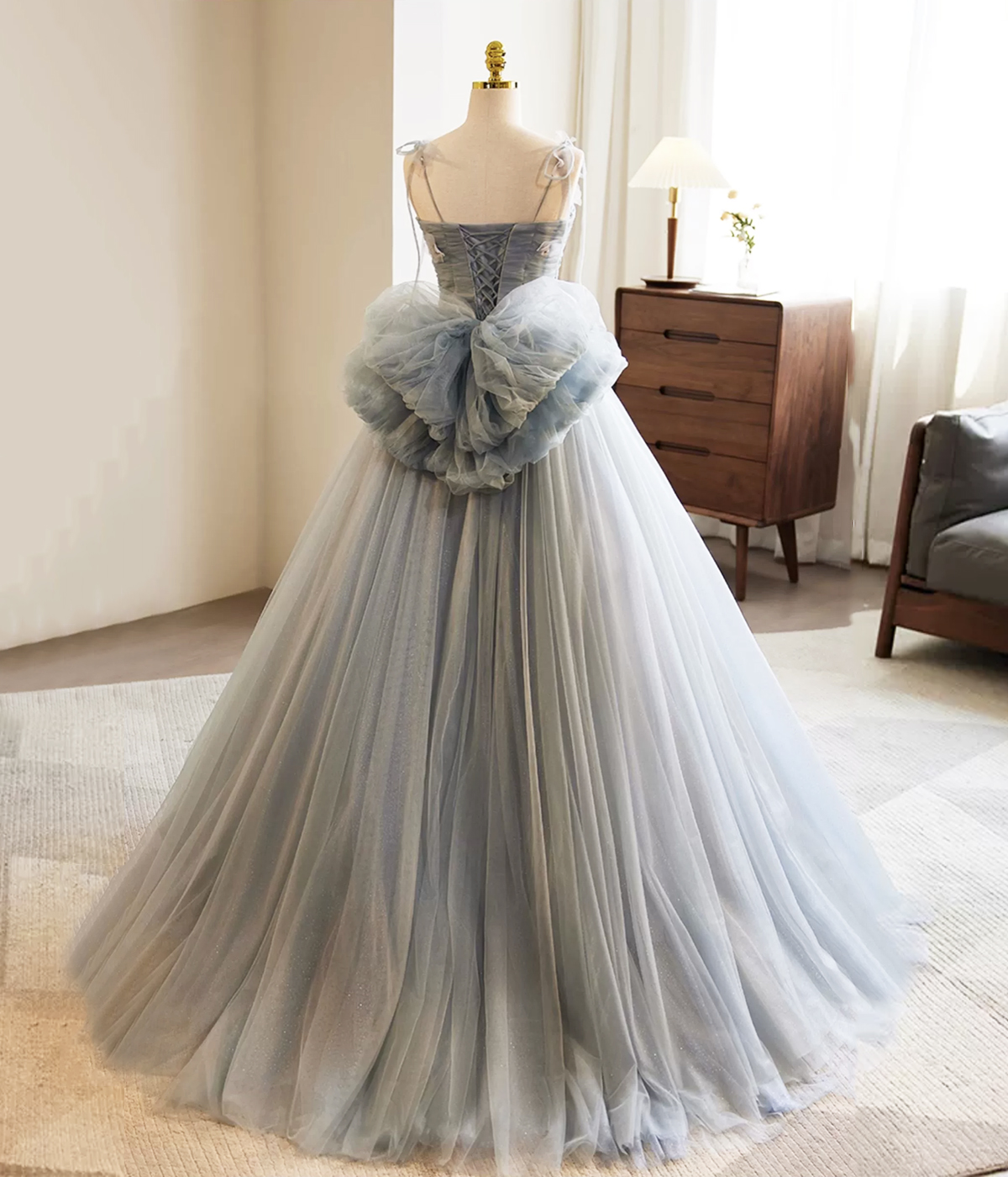 - Gray Spaghetti Strap Tulle Long Ball Gown with Bow -