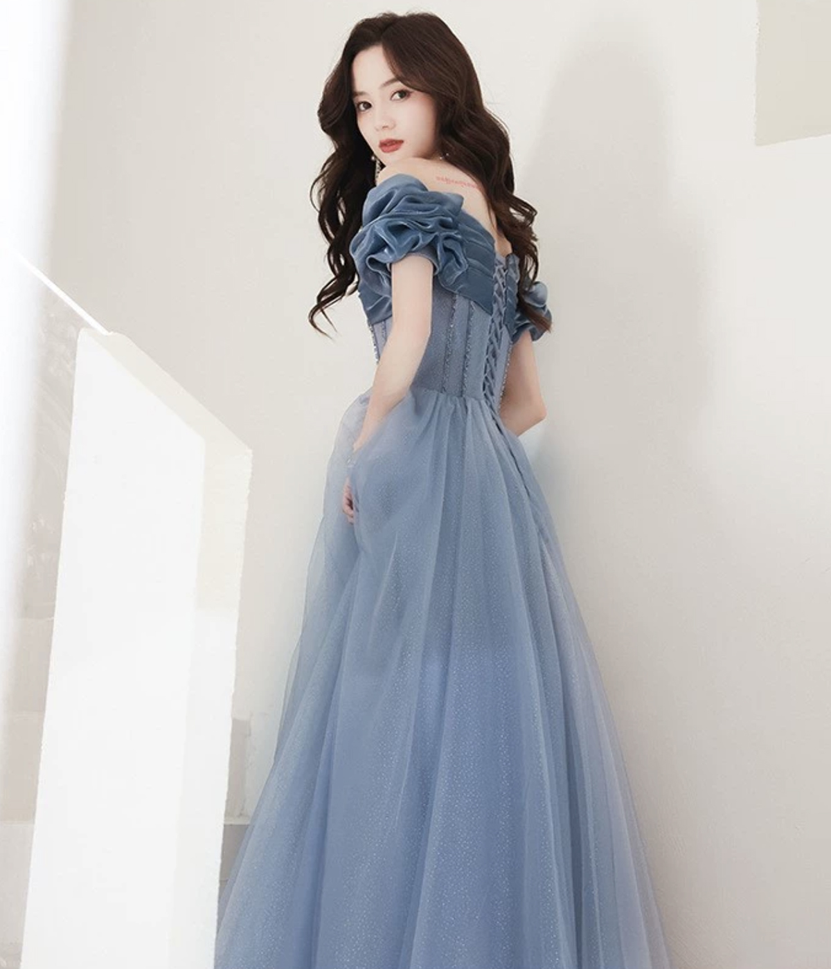 - Blue Tulle Off the Shoulder Floor Length Prom Dress -