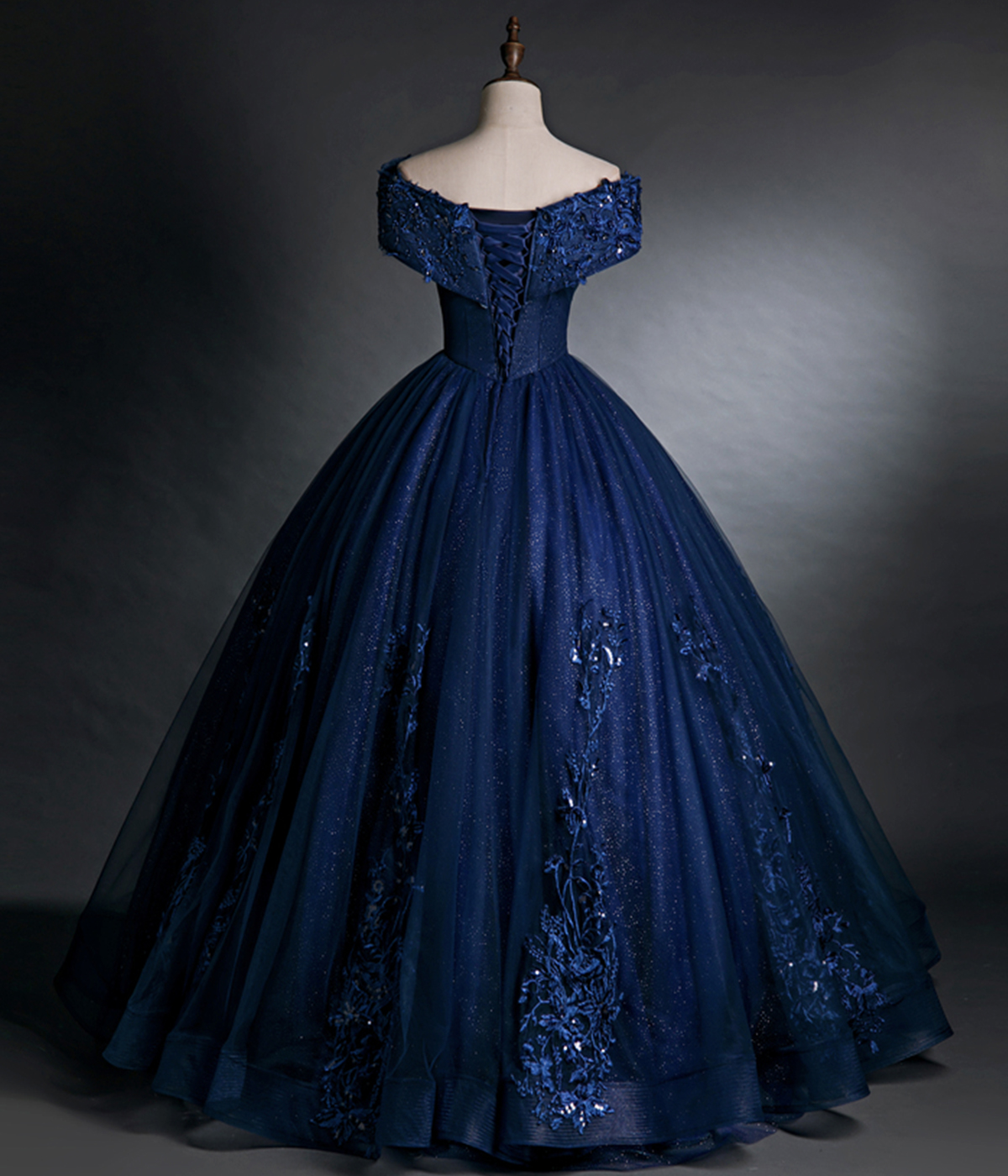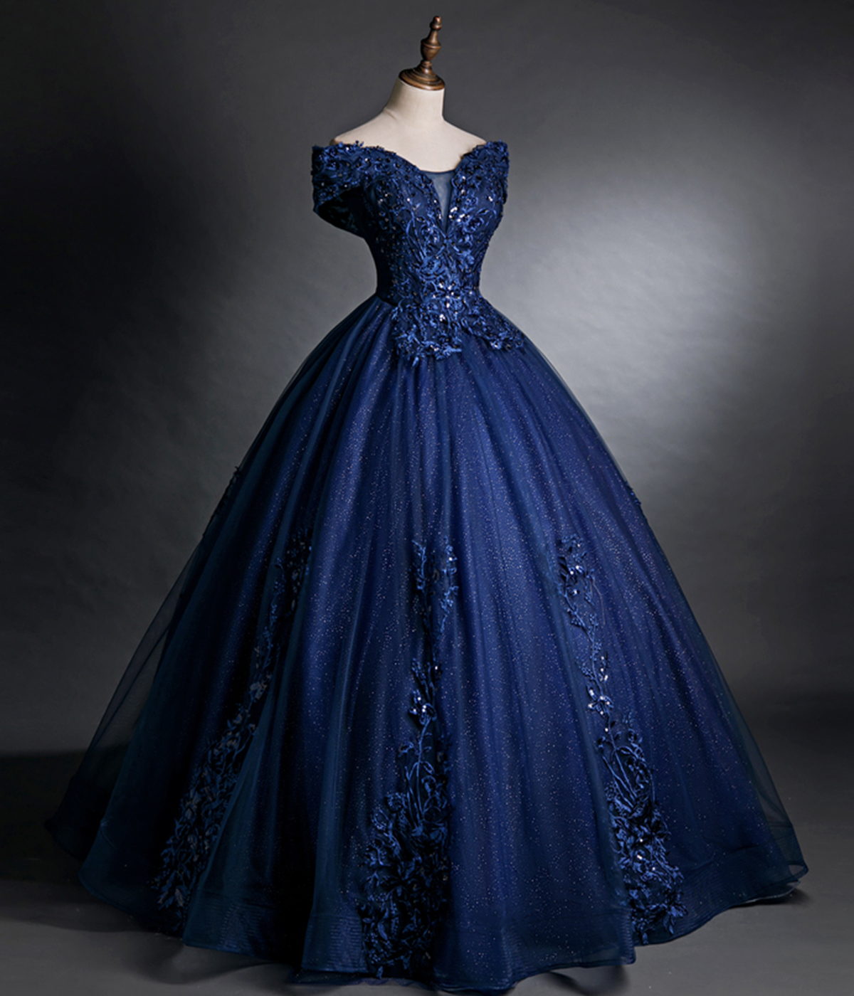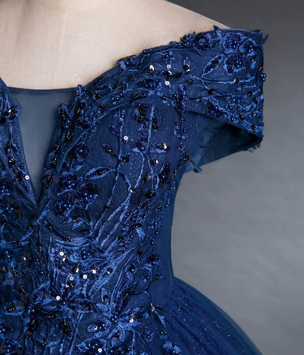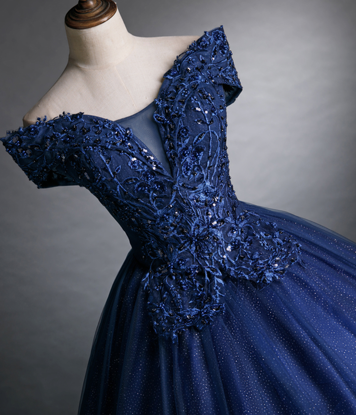 - Blue Tulle Lace Long Prom Dress, Blue V-Neck Evening Party Dress -