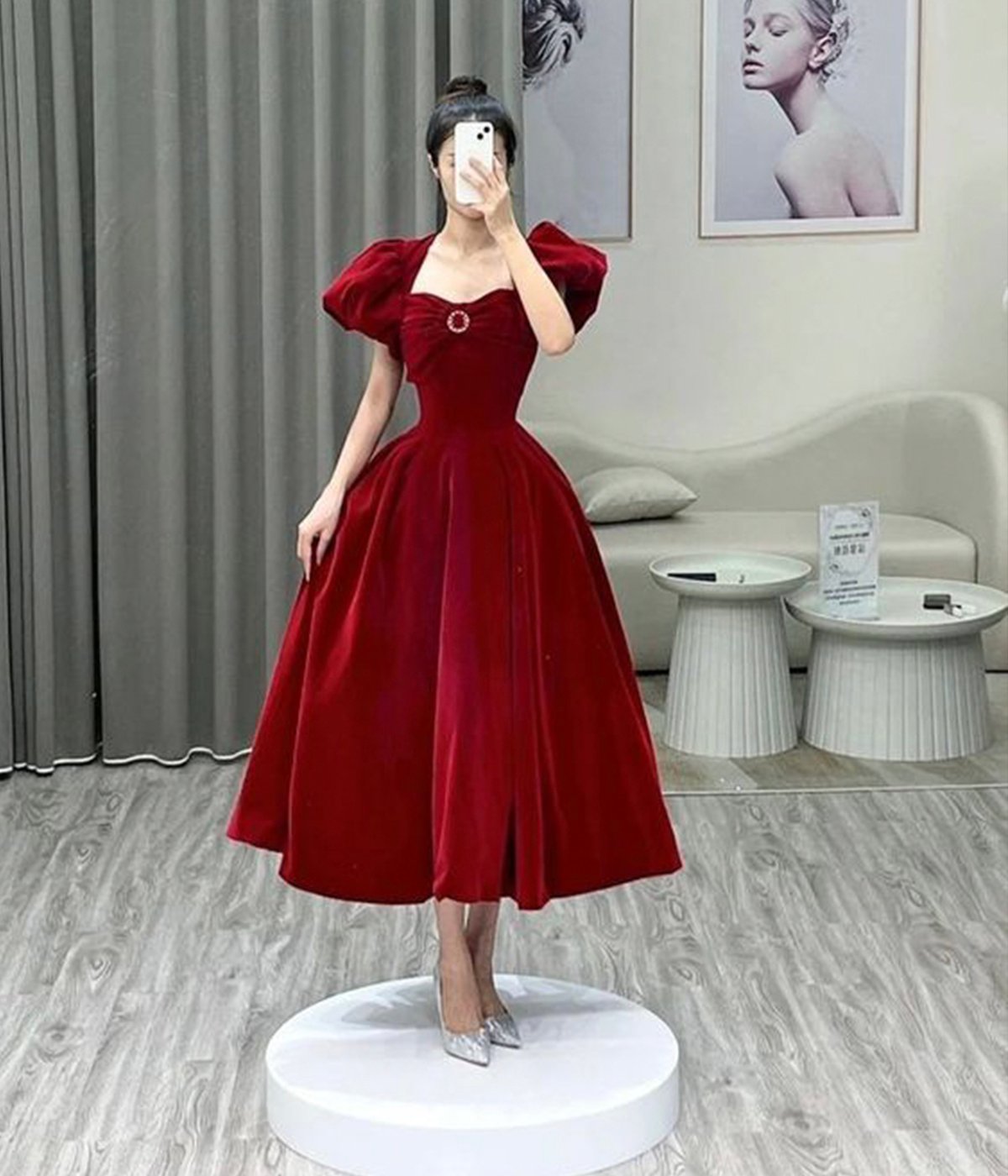 - Burgundy Velvet Short Prom Dress, A-Line Short Sleeve Evening Party Dress -