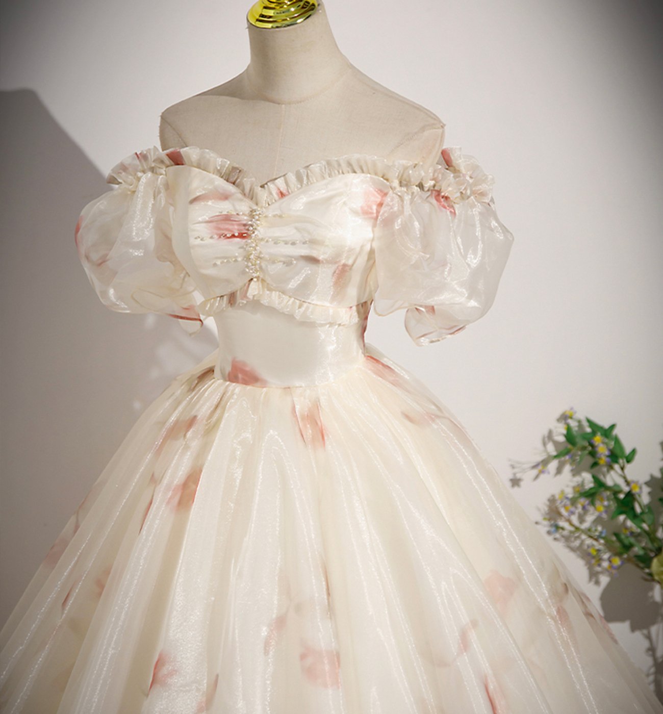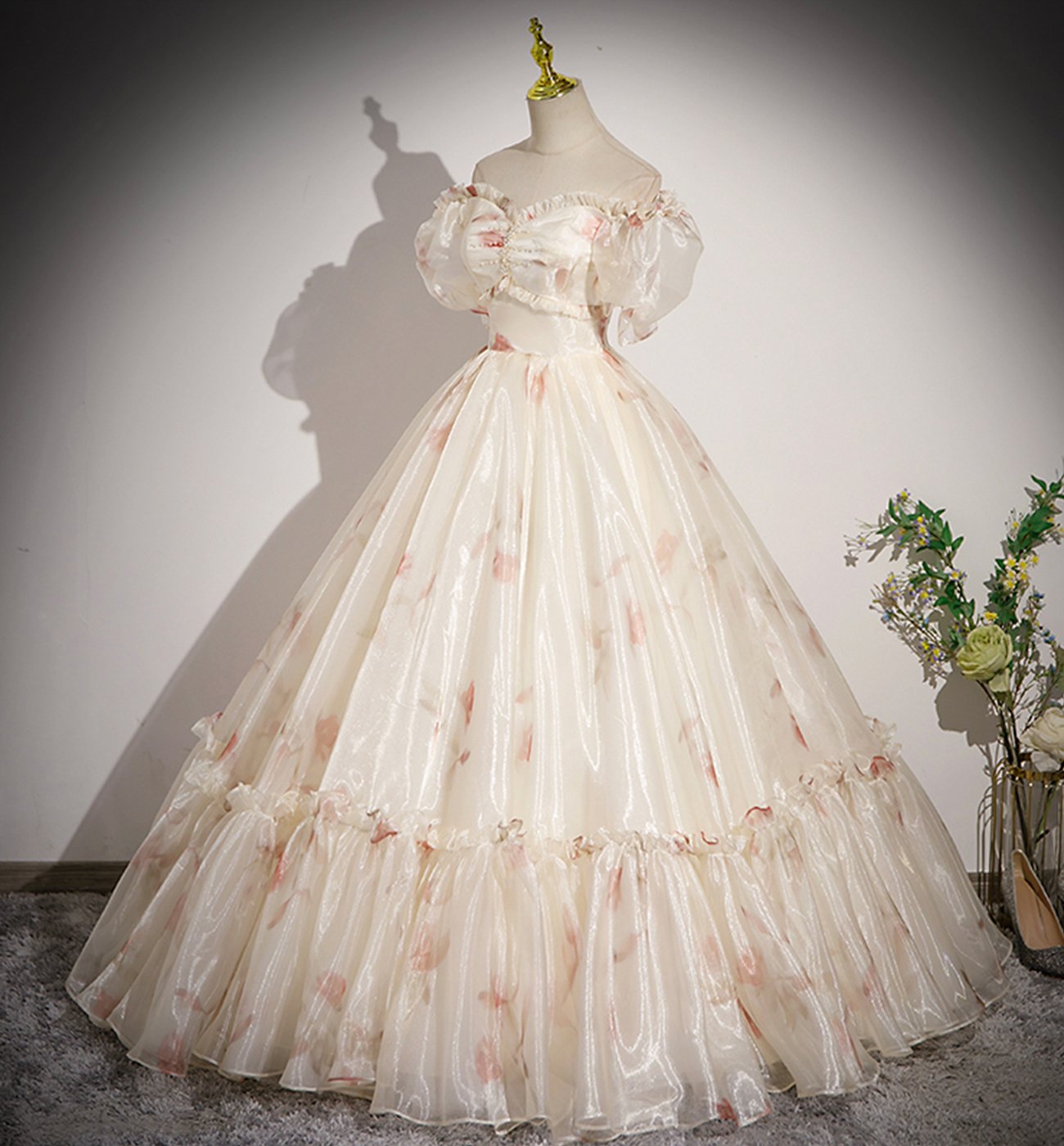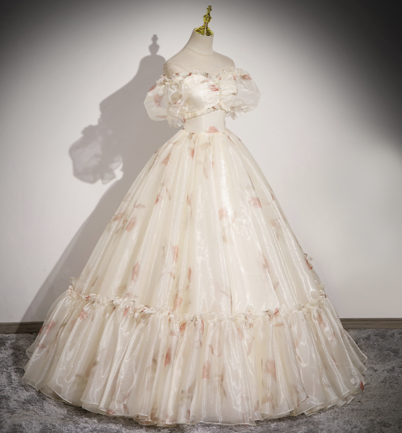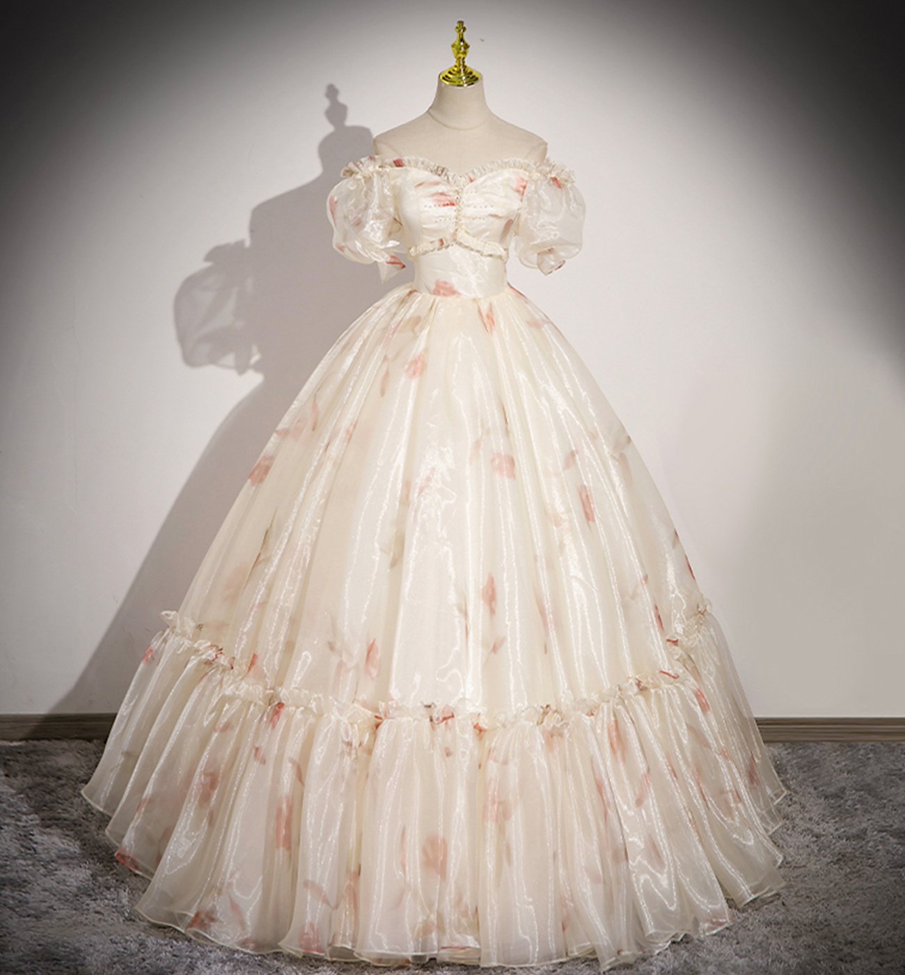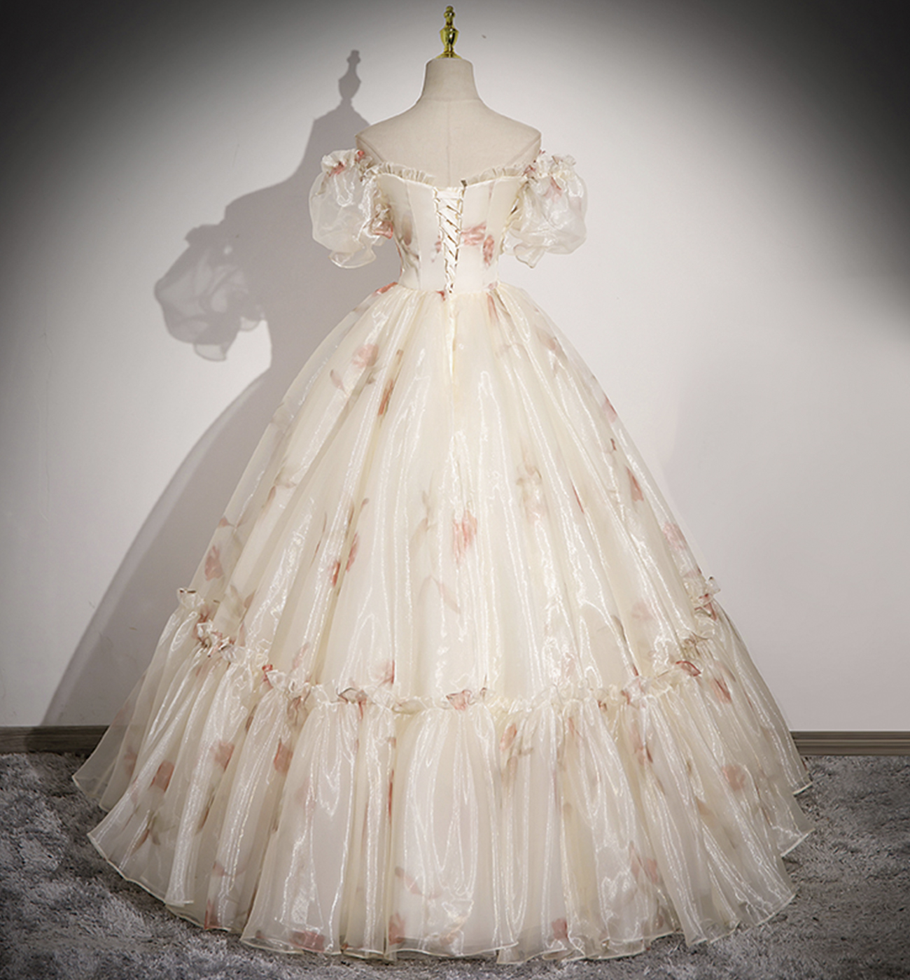 - Champagne Floral Tulle Long A-Line Prom Dress -