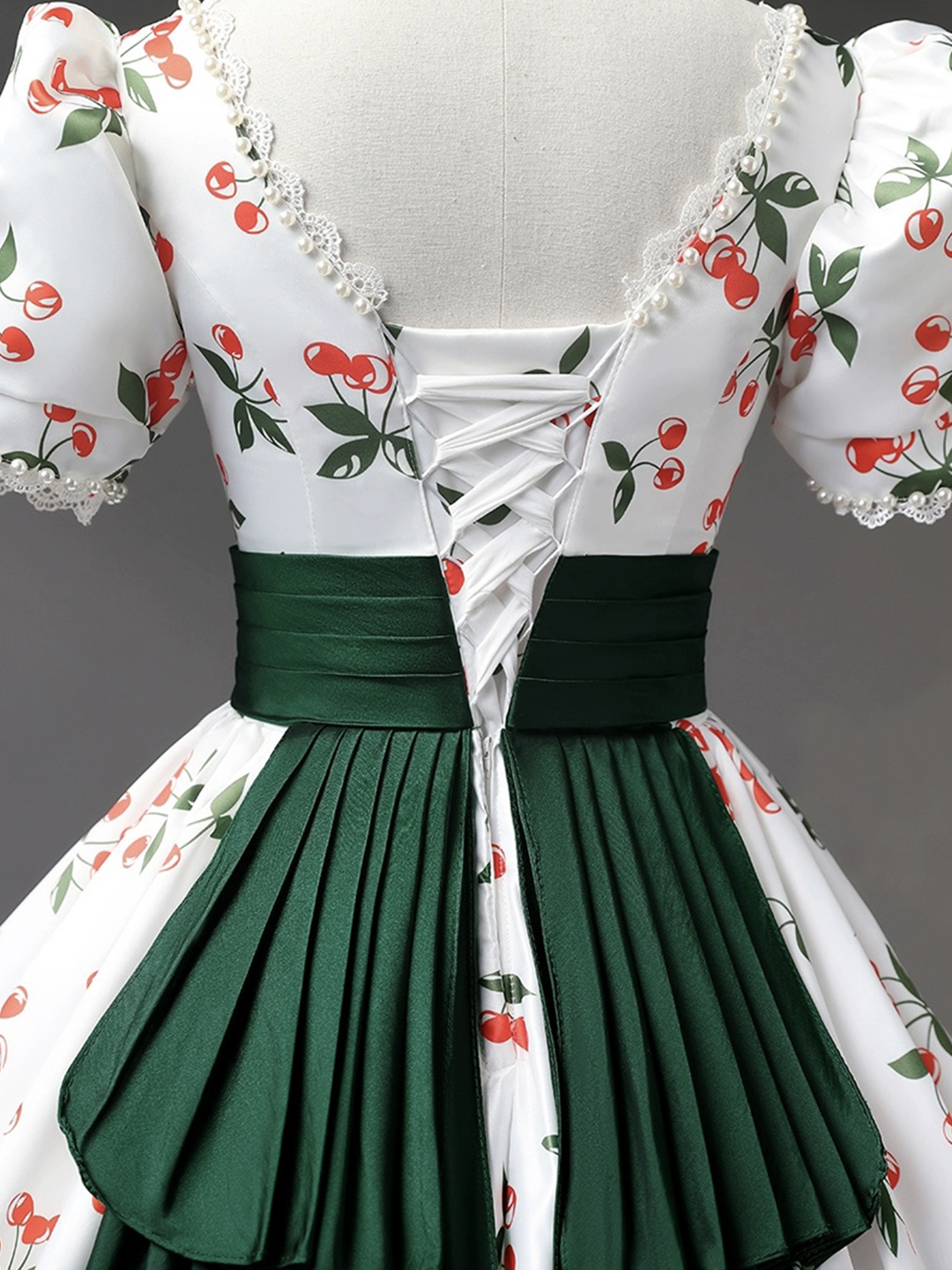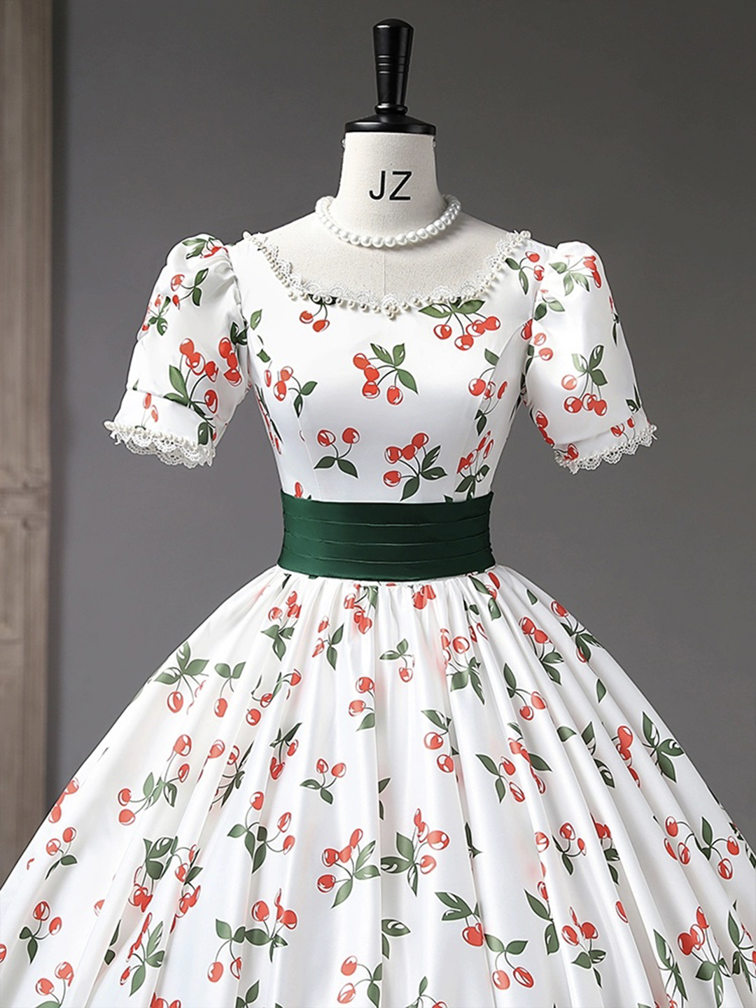 - White Cherry Pattern Long Princess Prom Dress -