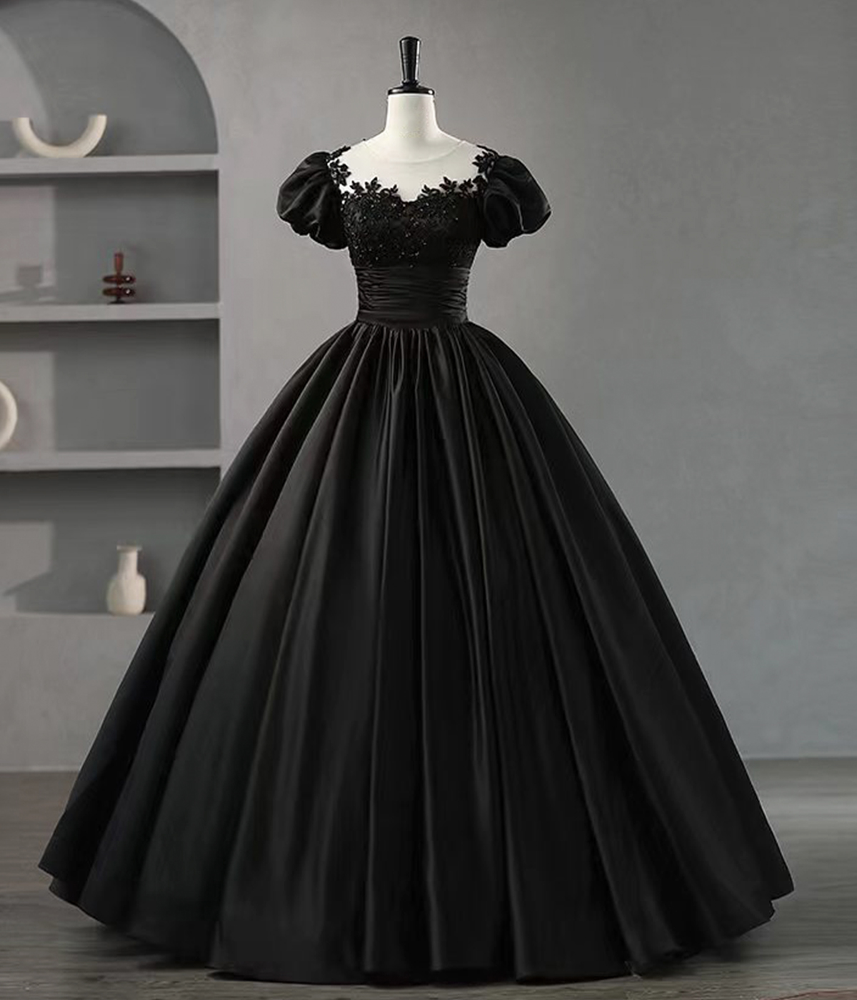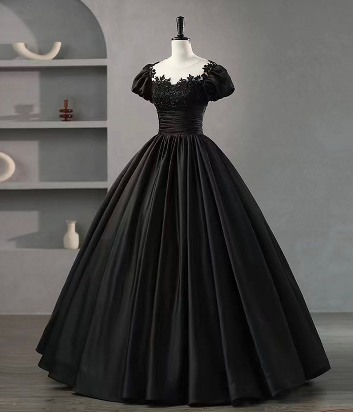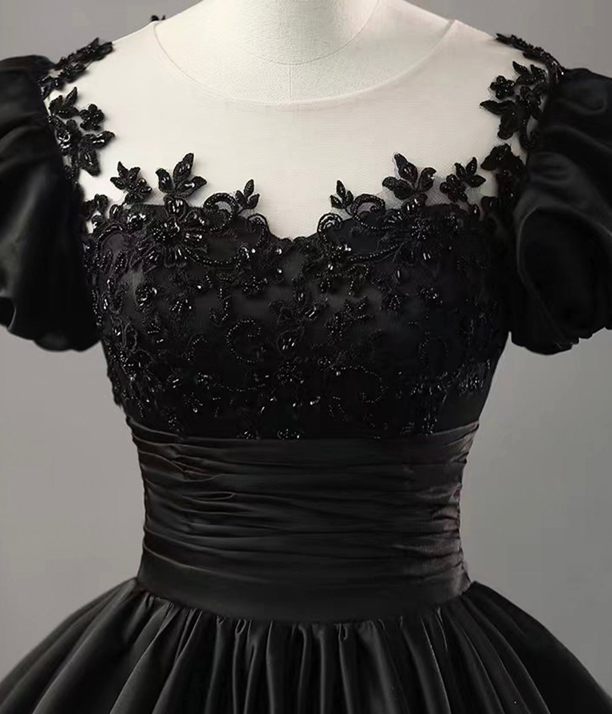 - Black Satin Lace Long Prom Dress, Black A-Line Evening Party Dress -