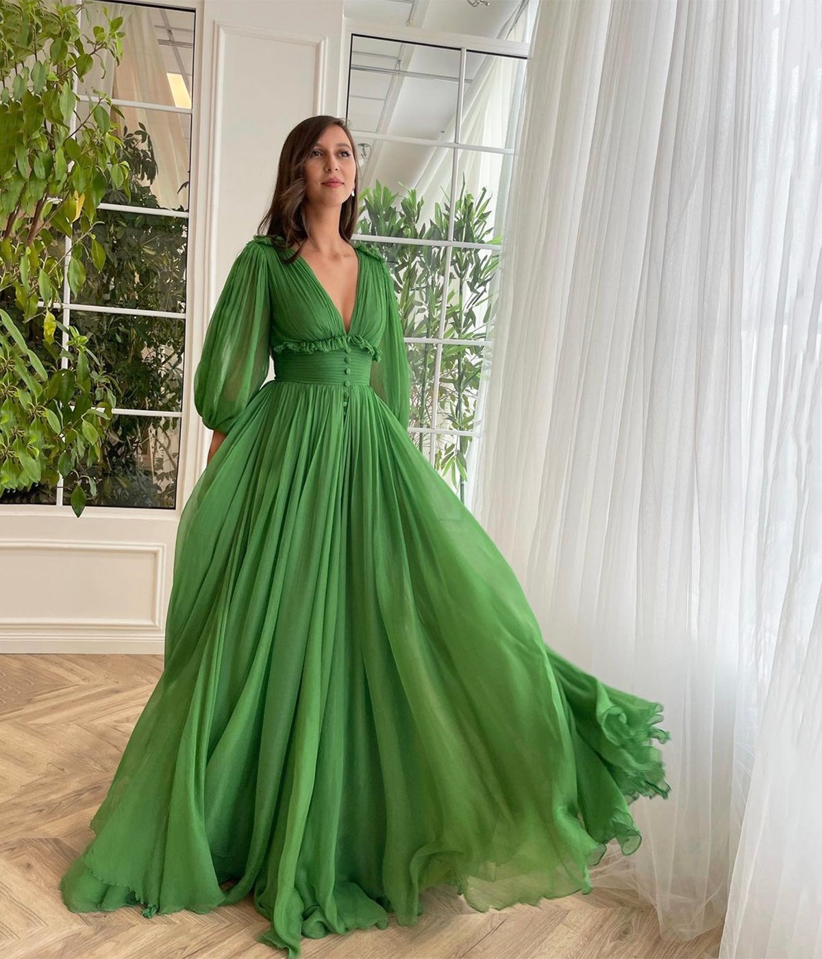 - Green V-Neck Chiffon Long A-Line Prom Dress -