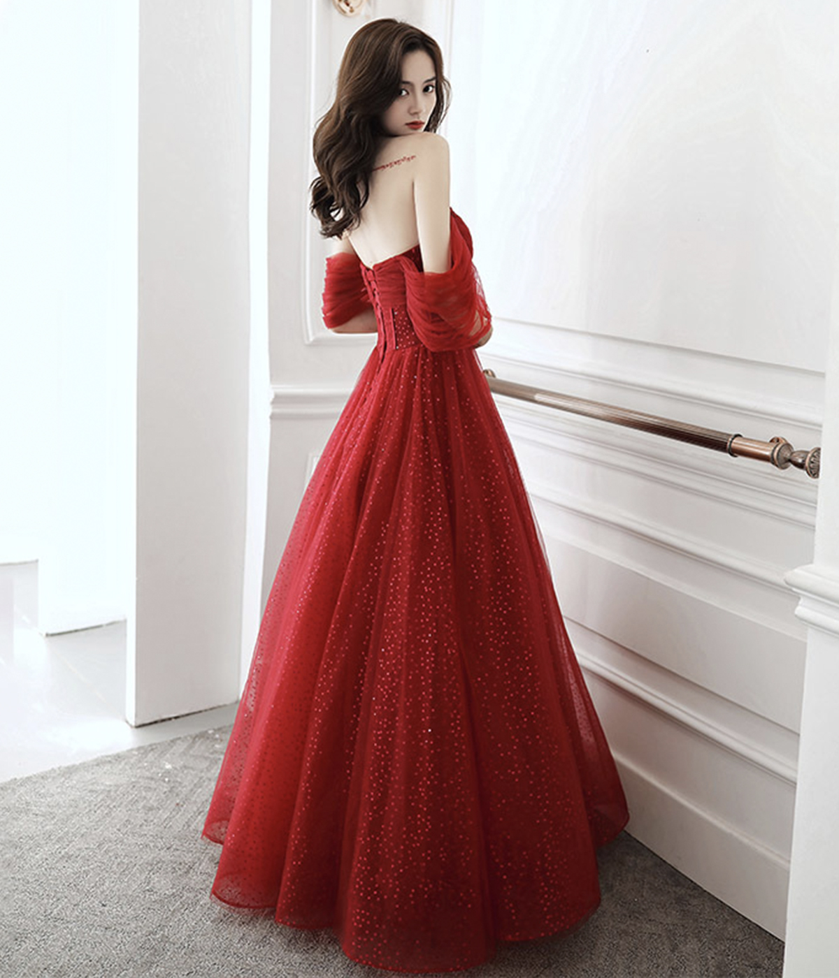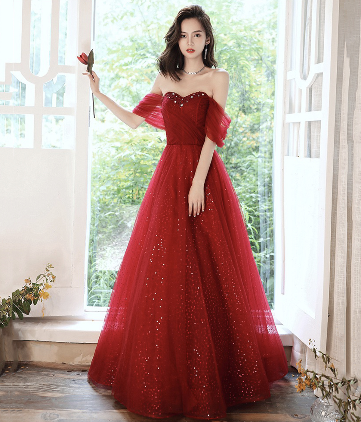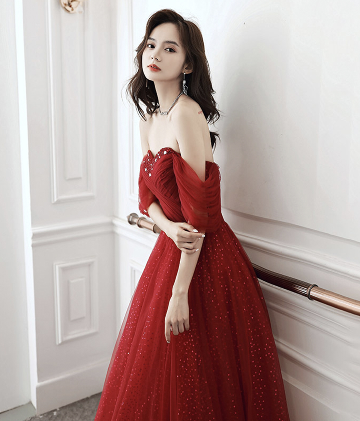- Dark Red Off the Shoulder Tulle Long A-Line Prom Dress -